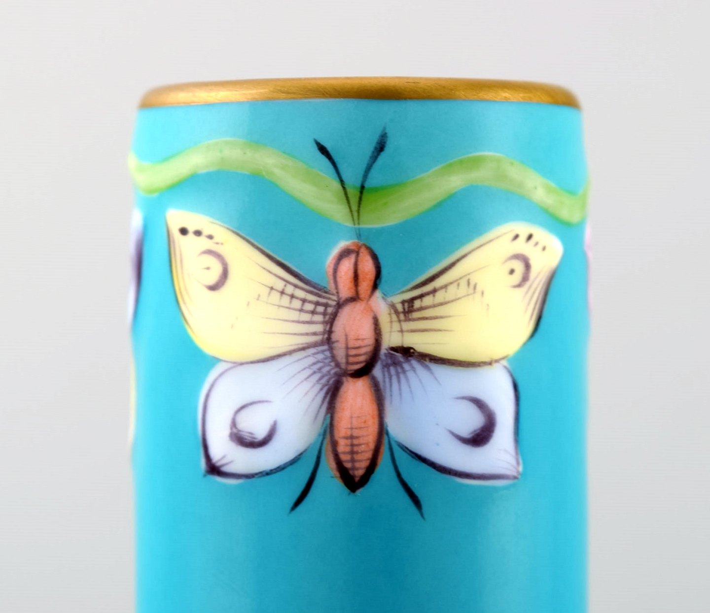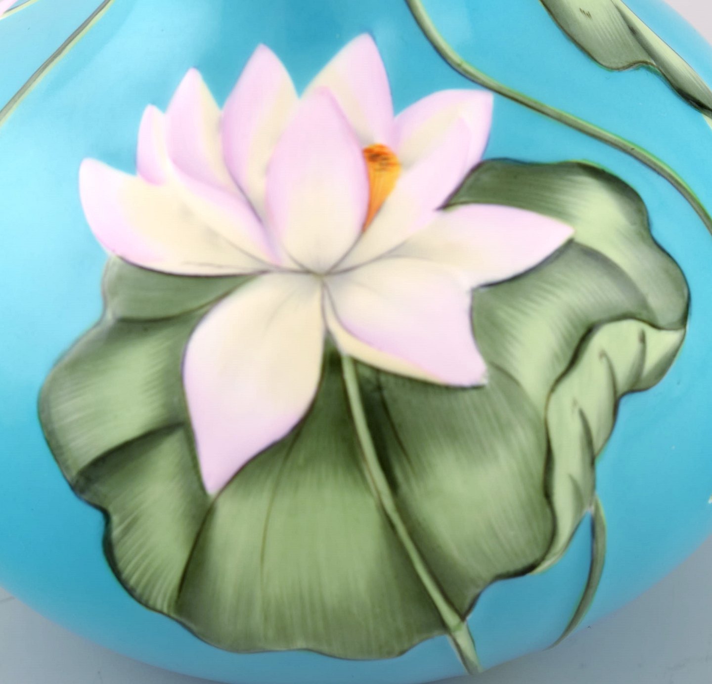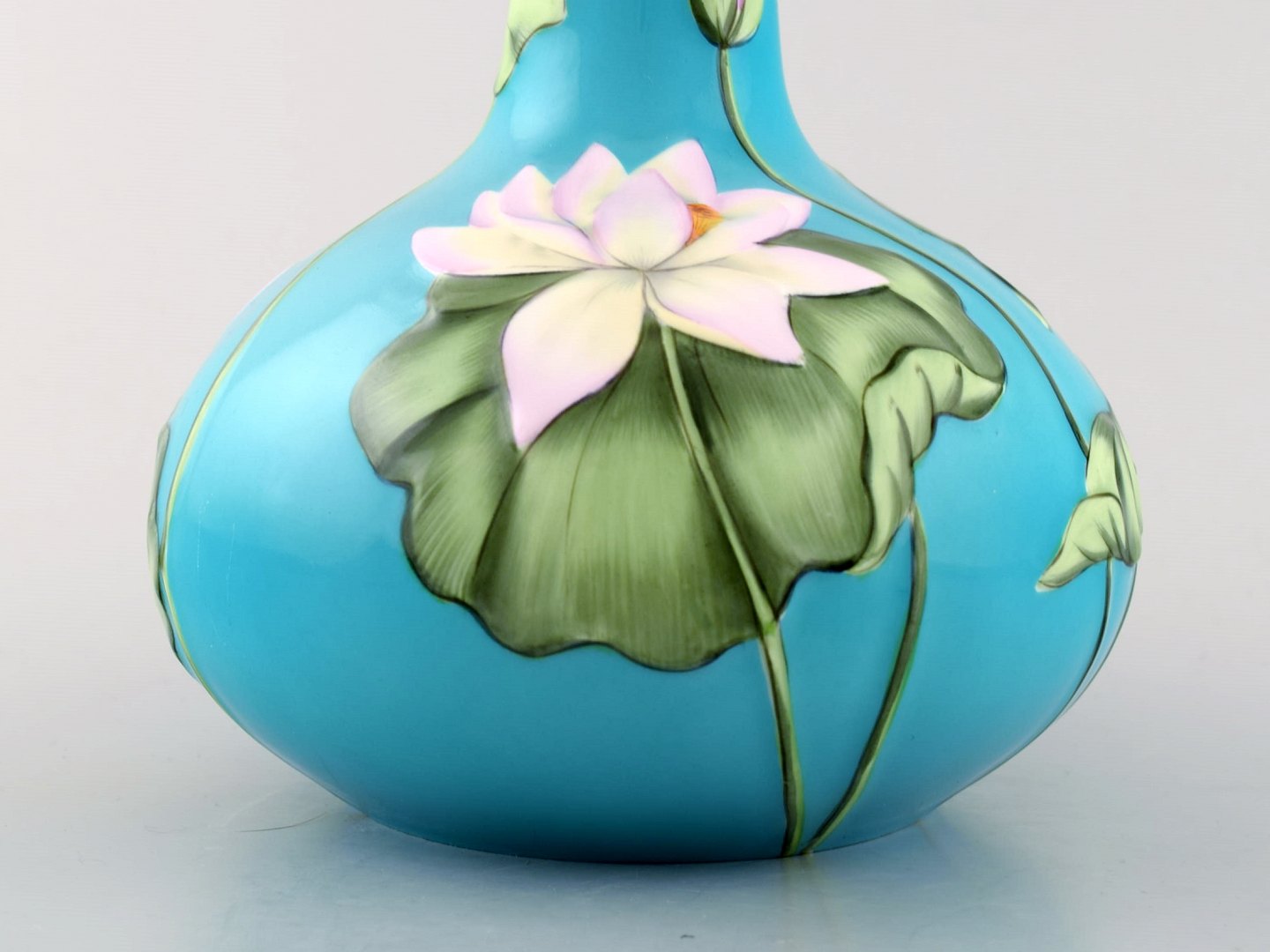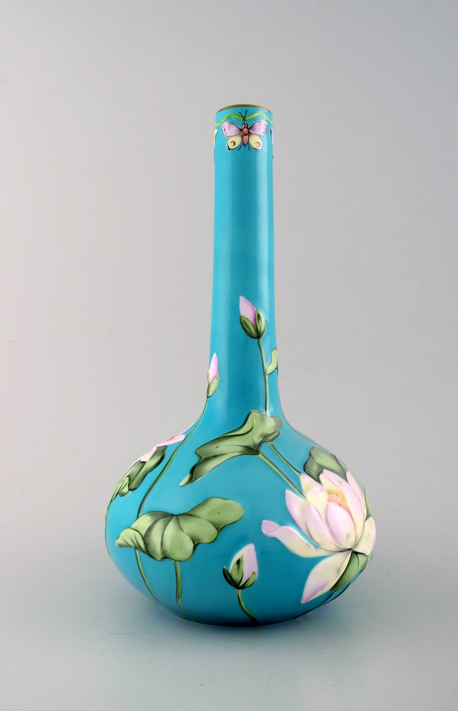 Herend Hungary. Håndmalet art nouveau vase med åkander og sommerfugle i relief. Modelnummer: 7141 Stemplet. I Flot stand. Måler: 28,5 cm x 16 cm.