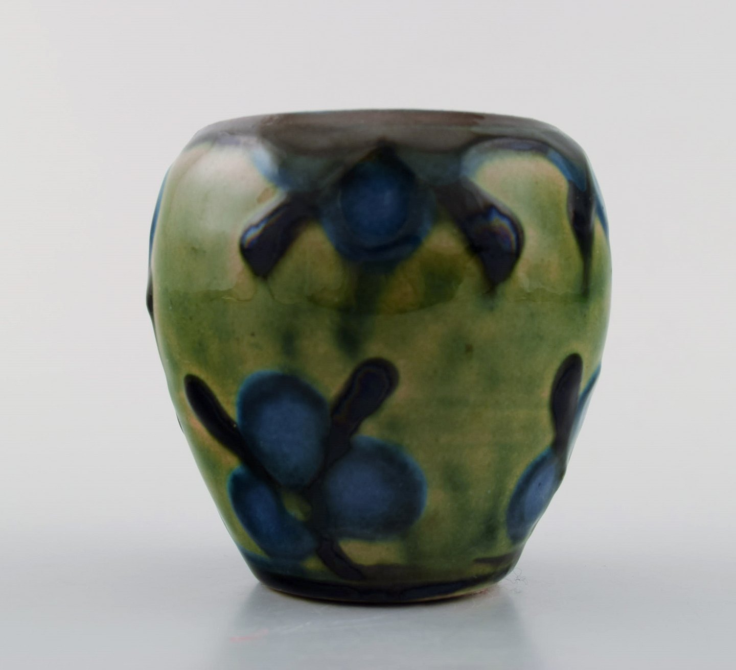 Fin Kähler, HAK, glaseret stentøjsvase. 1940´erne. Flot grøn glasur og blomstermotiv. Stemplet. Måler : 8 cm. x 8 cm. I perfekt stand.