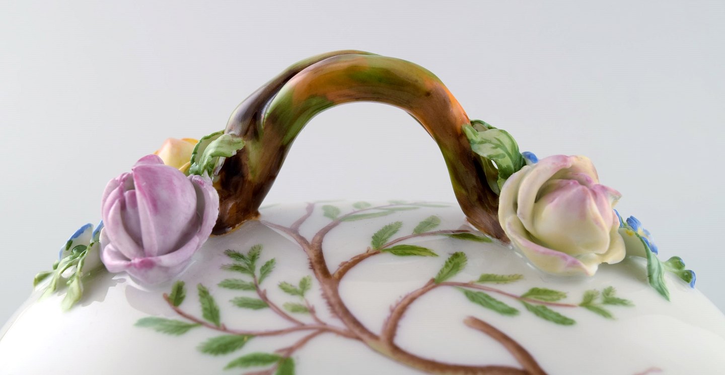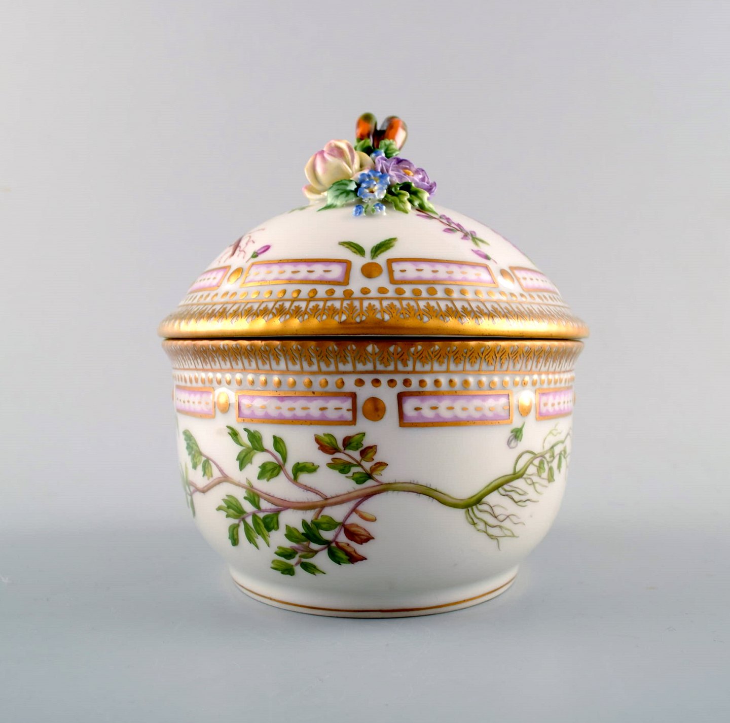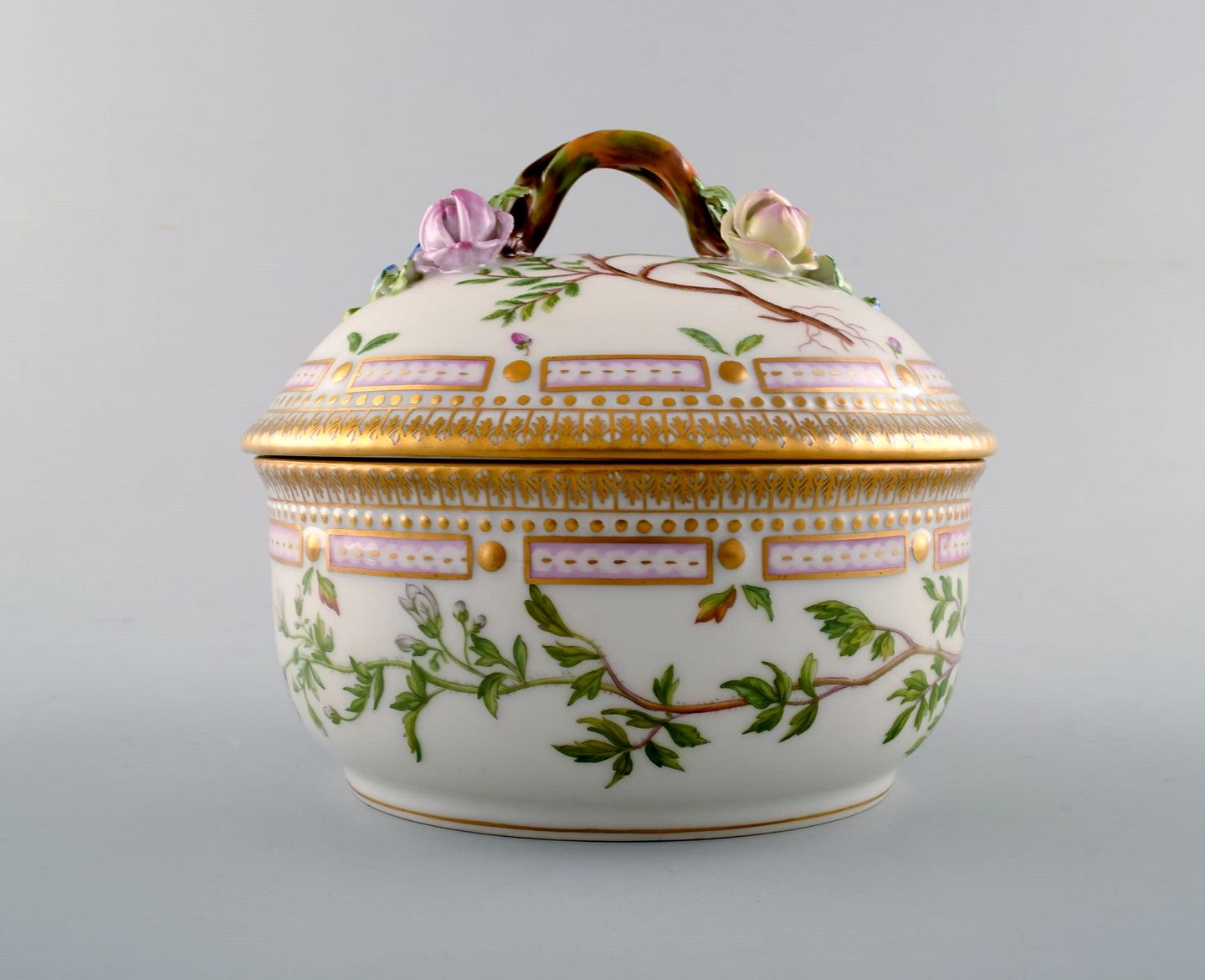 Royal Copenhagen. 'Flora Danica' porcelain lidded bowl, decorated in colors and gold with lid handles in the form of branches with repousse flowers.
