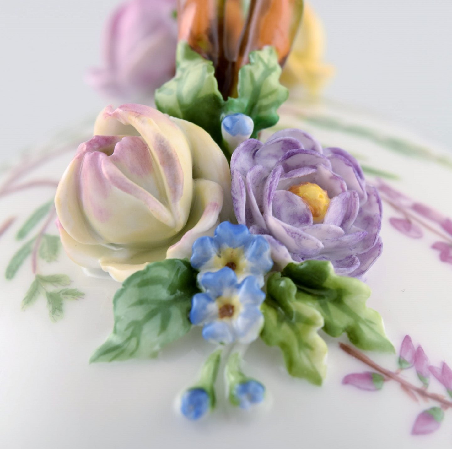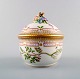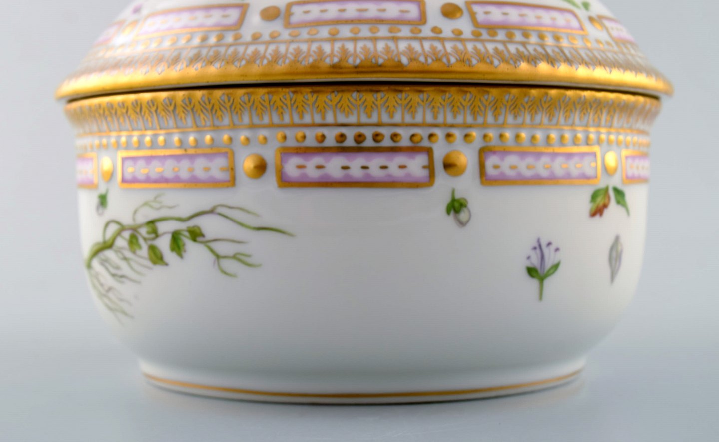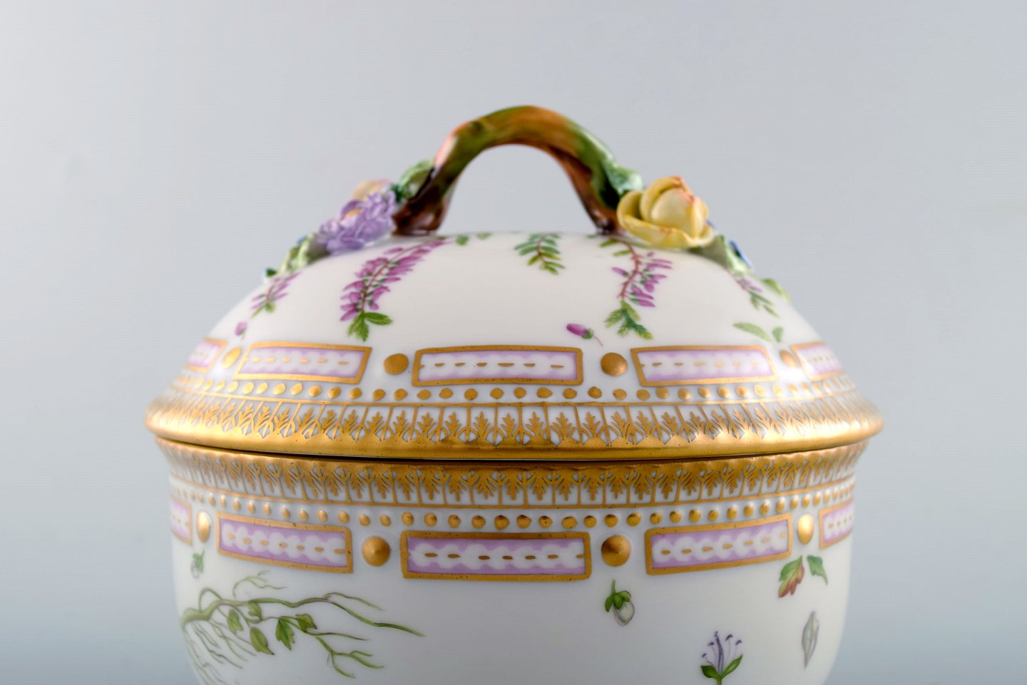 Royal Copenhagen. 'Flora Danica' porcelain lidded bowl, decorated in colors and gold with lid handles in the form of branches with repousse flowers.