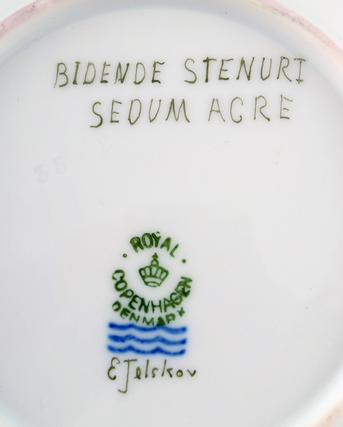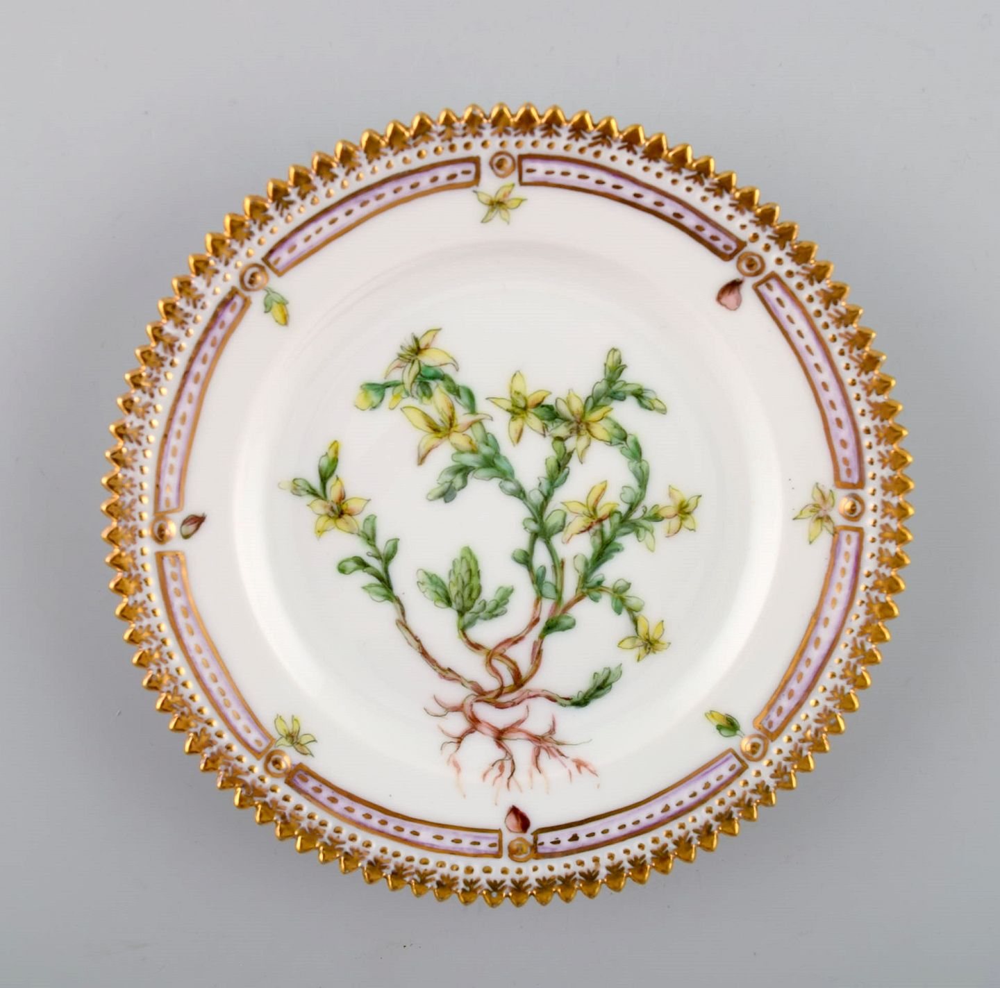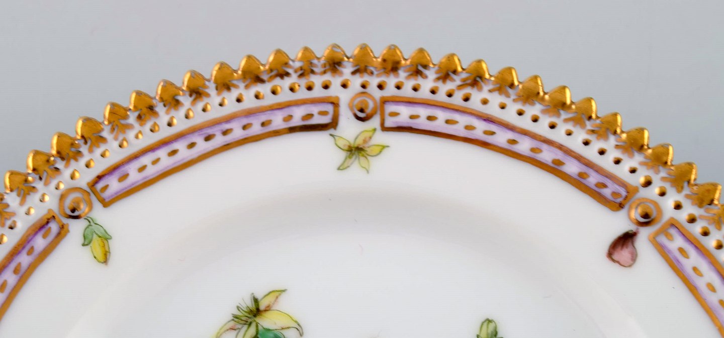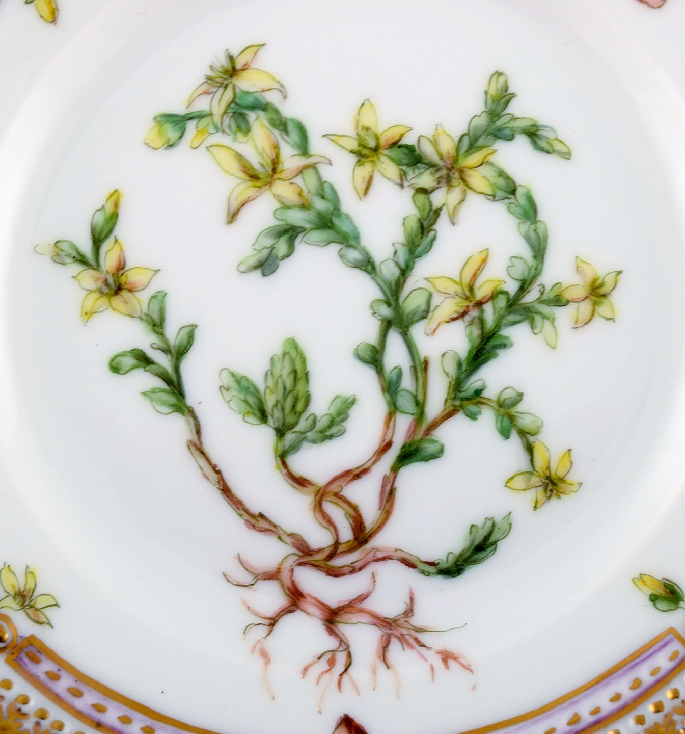 Royal Copenhagen. 'Flora Danica' kagetallerken af porcelæn, dekoreret med blomster i farver og guld.