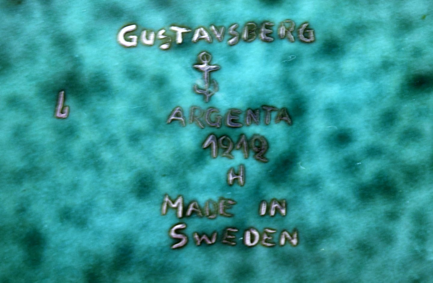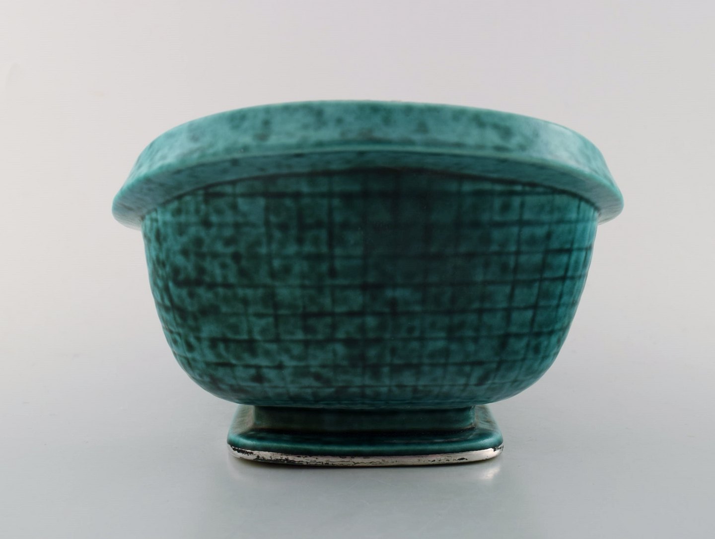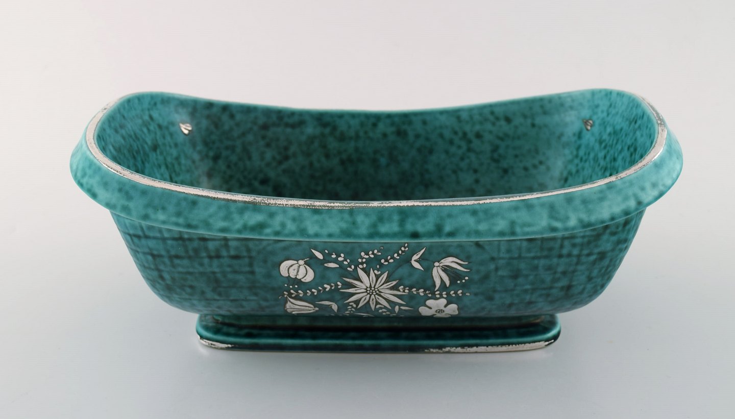 Wilhelm Kåge, Gustavsberg, Argenta Art deco blomsterkumme/ jardiniere dekoreret med blomster. Måler 27 cm. x 11 cm. I flot stand. Stemplet Gustavsberg, Argenta 1212.
