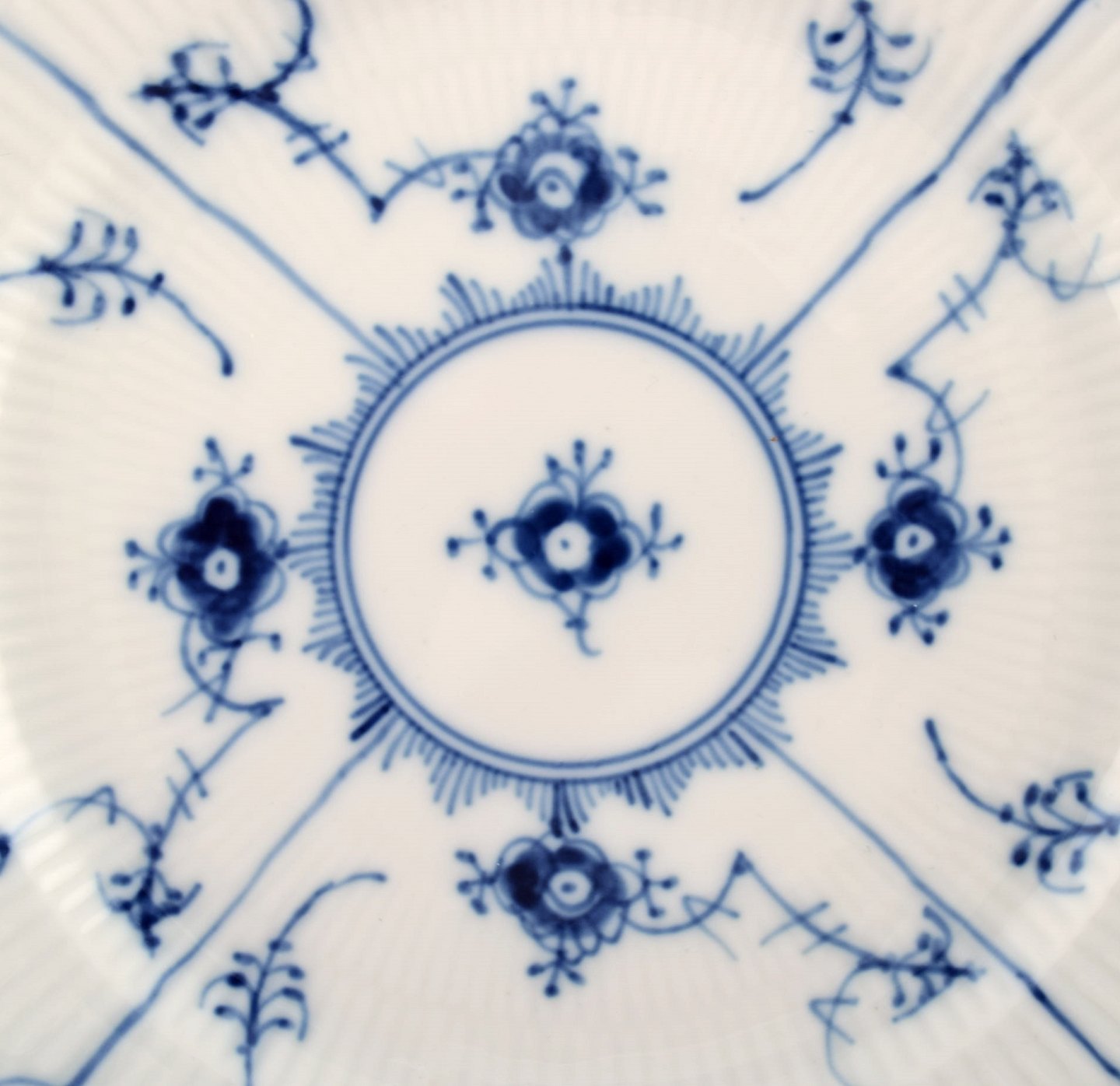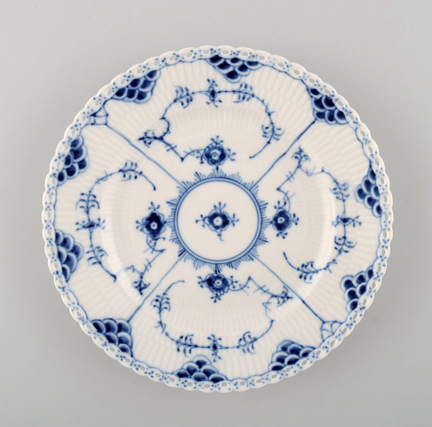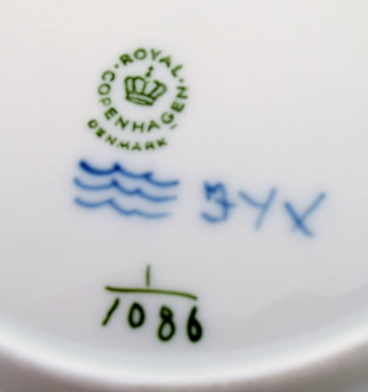 Fire stk. musselmalet, helblonde flad tallerken fra Royal Copenhagen. Dekorationsnummer : 1/1086. Måler : 19,5 cm. 1. sortering. I perfekt stand.