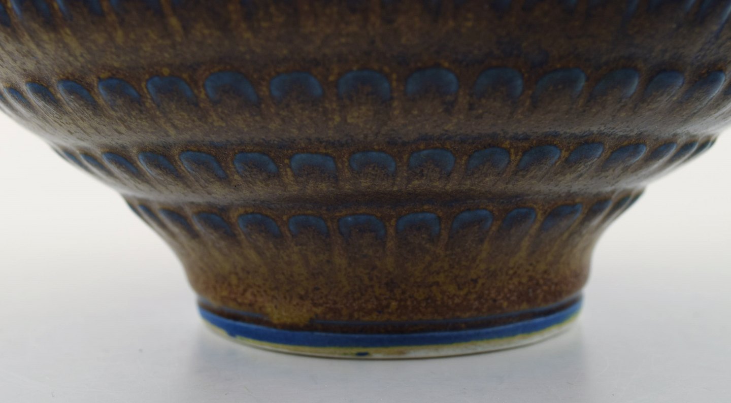 Stor skål af stentøj, dekoreret med blå/brun glasur.