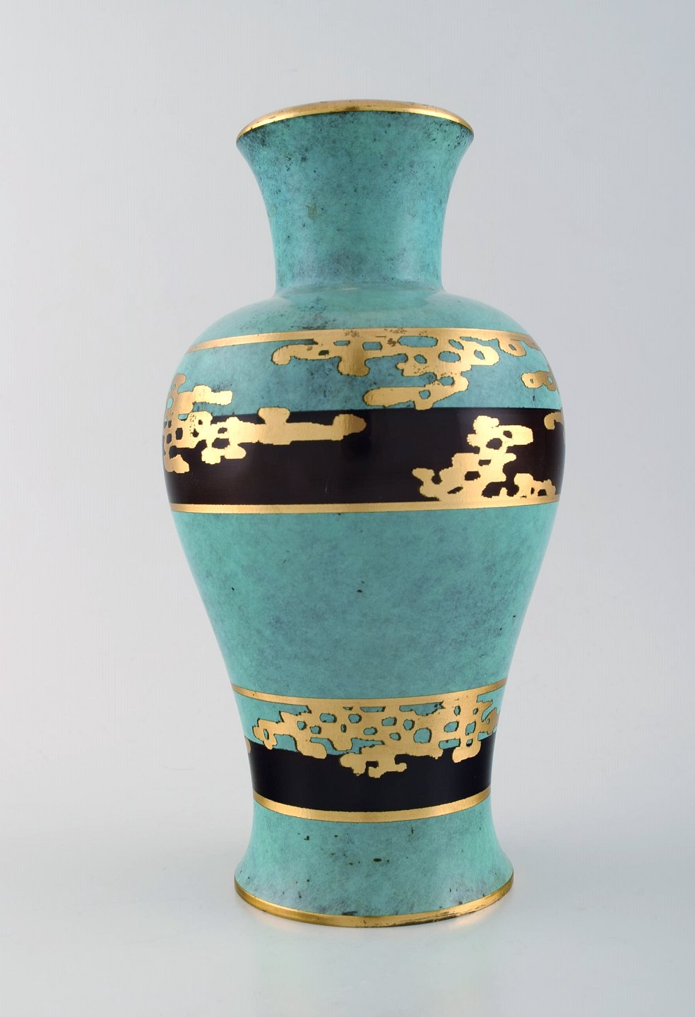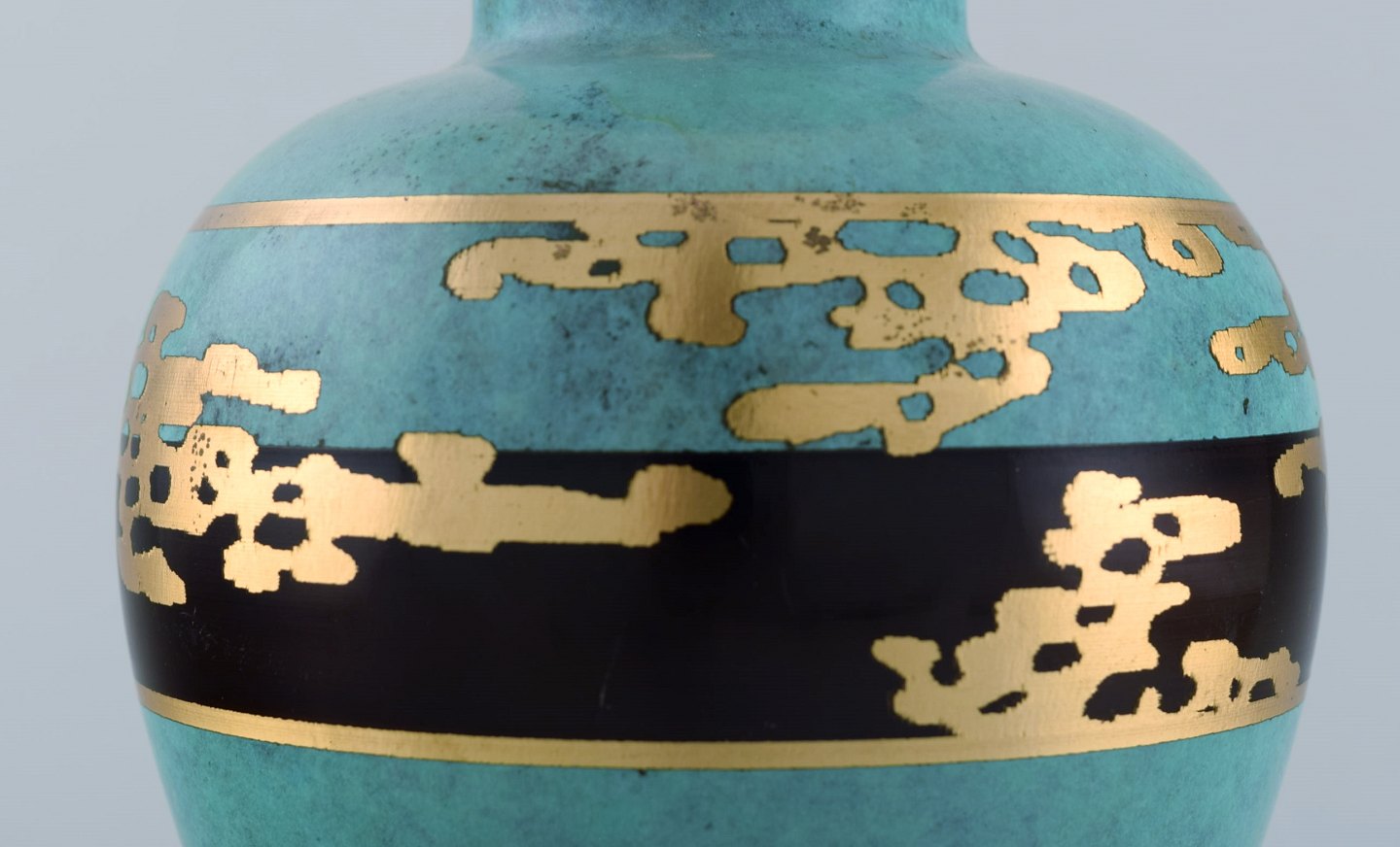 Art Deco vase, grønpatineret bronze med gulddekoration "Ikora" WMF (Württembergische METALLWARENFABRIK) I flot stand. Måler : 25,5 cm. x 14 cm. Stemplet.