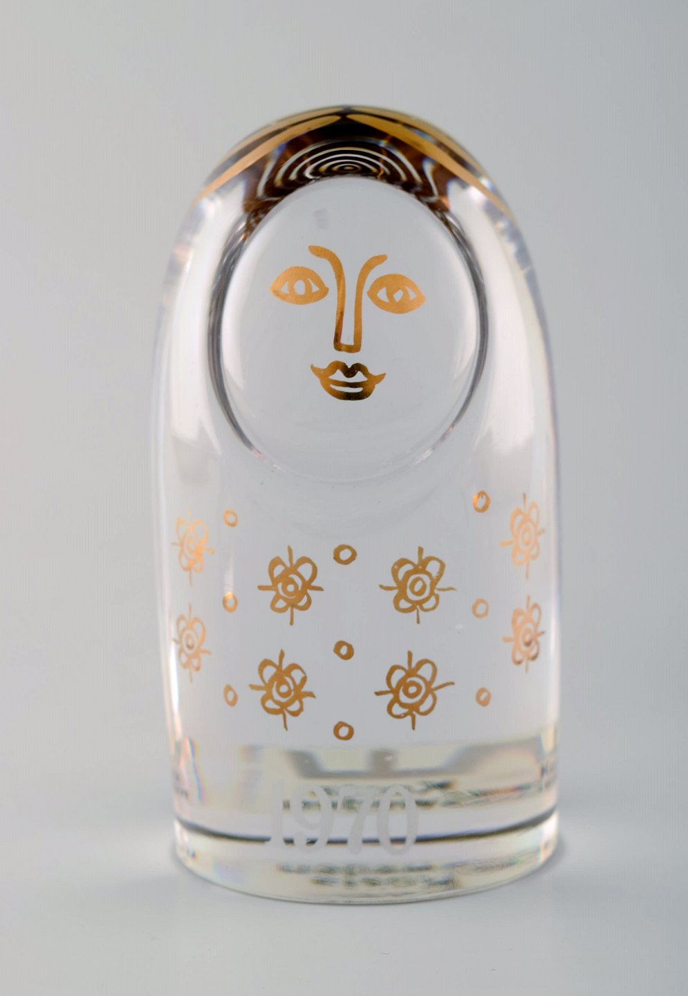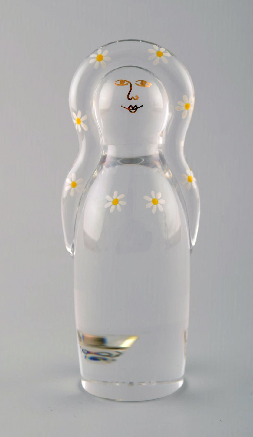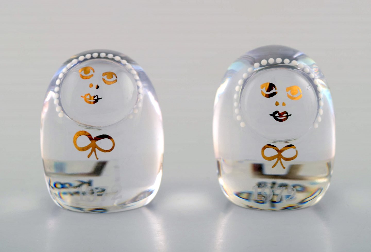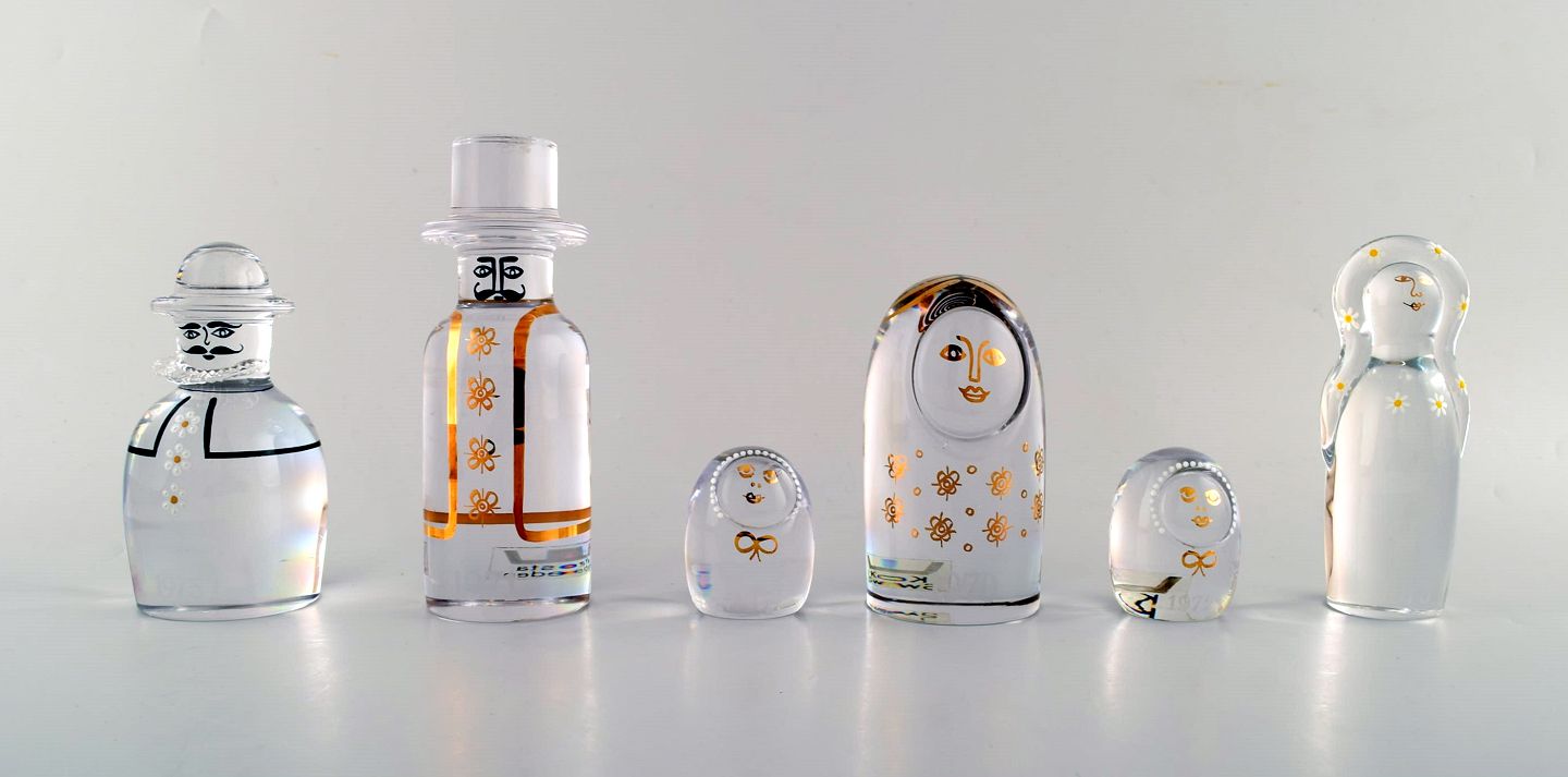 Samling af kunstglas figurer 'familien', Kosta Boda. Graveret og håndmalet dekoration. Mærket med årstal. Højde 5,5 -16 cm. År 1970-1981. I perfekt stand.
