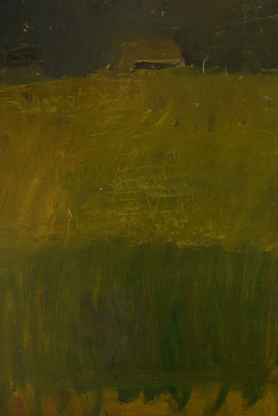 Norsk landskab med høstak og hus i baggrunden af Lili Ege (1913-2004). Olie på plade.