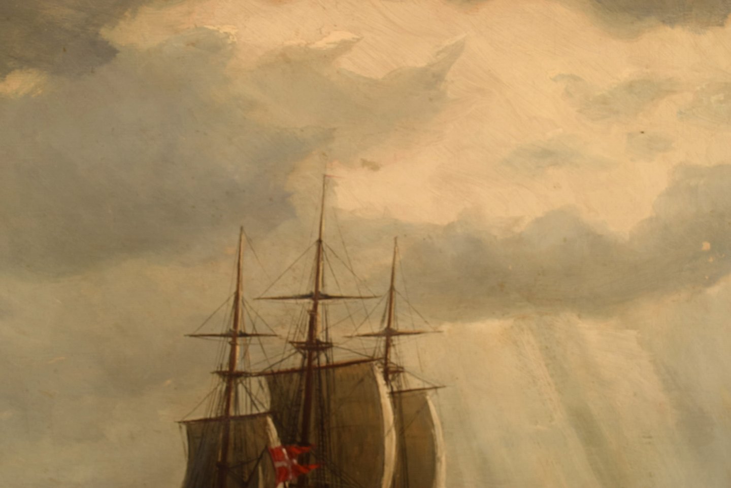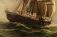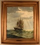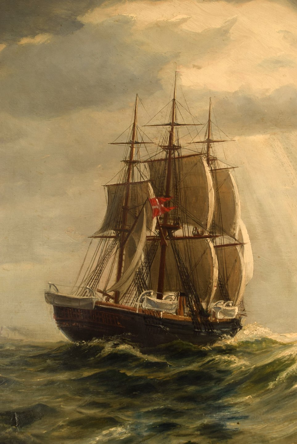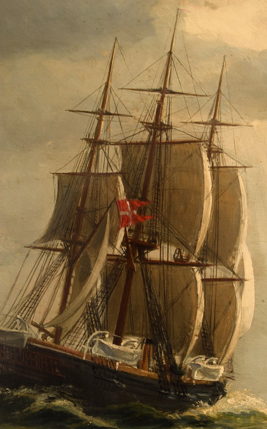 Christian Benjamin Olsen (Denmark): Three master under sail in high sea. Danish flag.