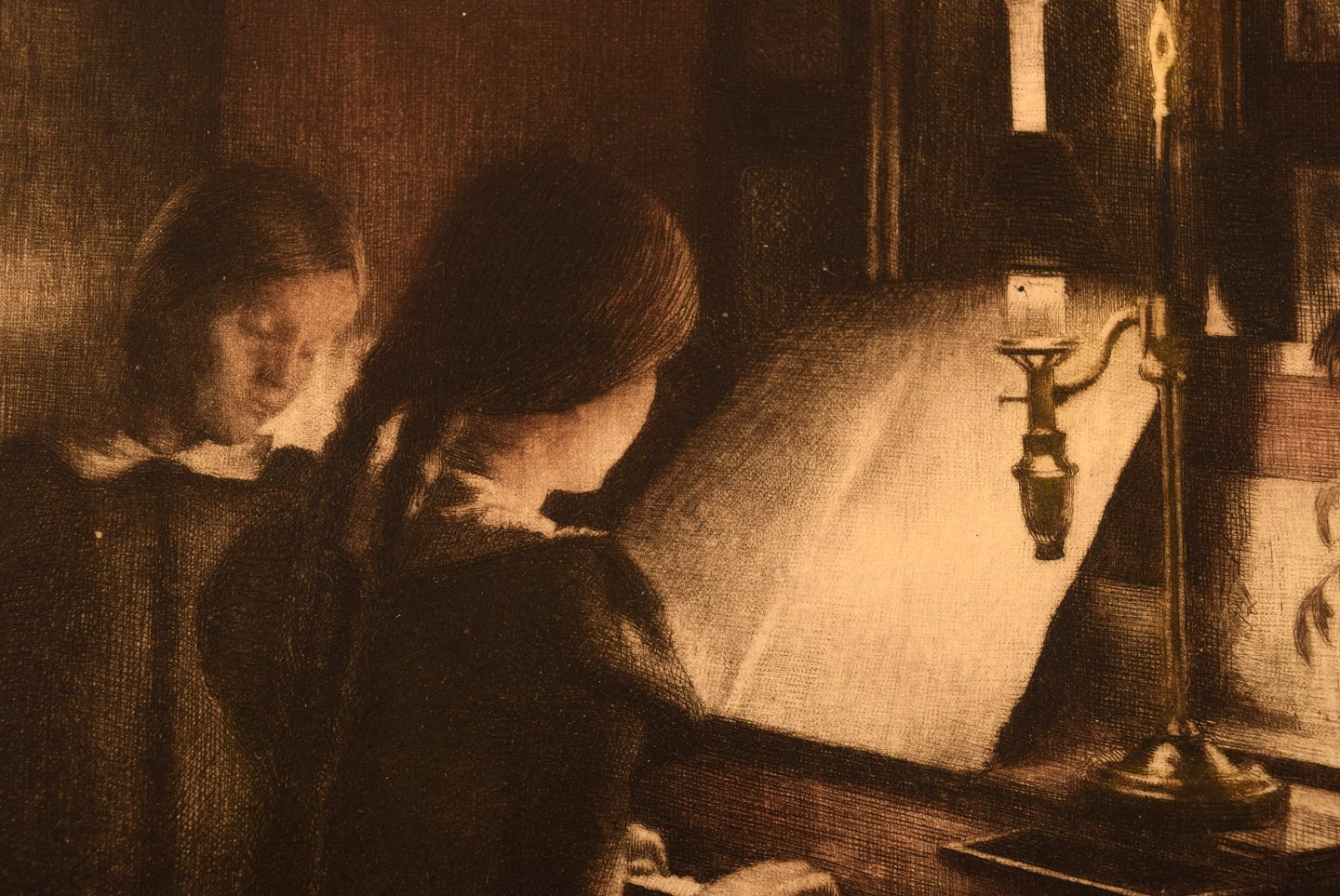 Peter Ilsted: Interiør med to piger ved klaveret. Signeret Peter Ilsted. Farvemezzotinte. Pladestørrelse 23,5 cm. x 21,5 cm. I god stand.