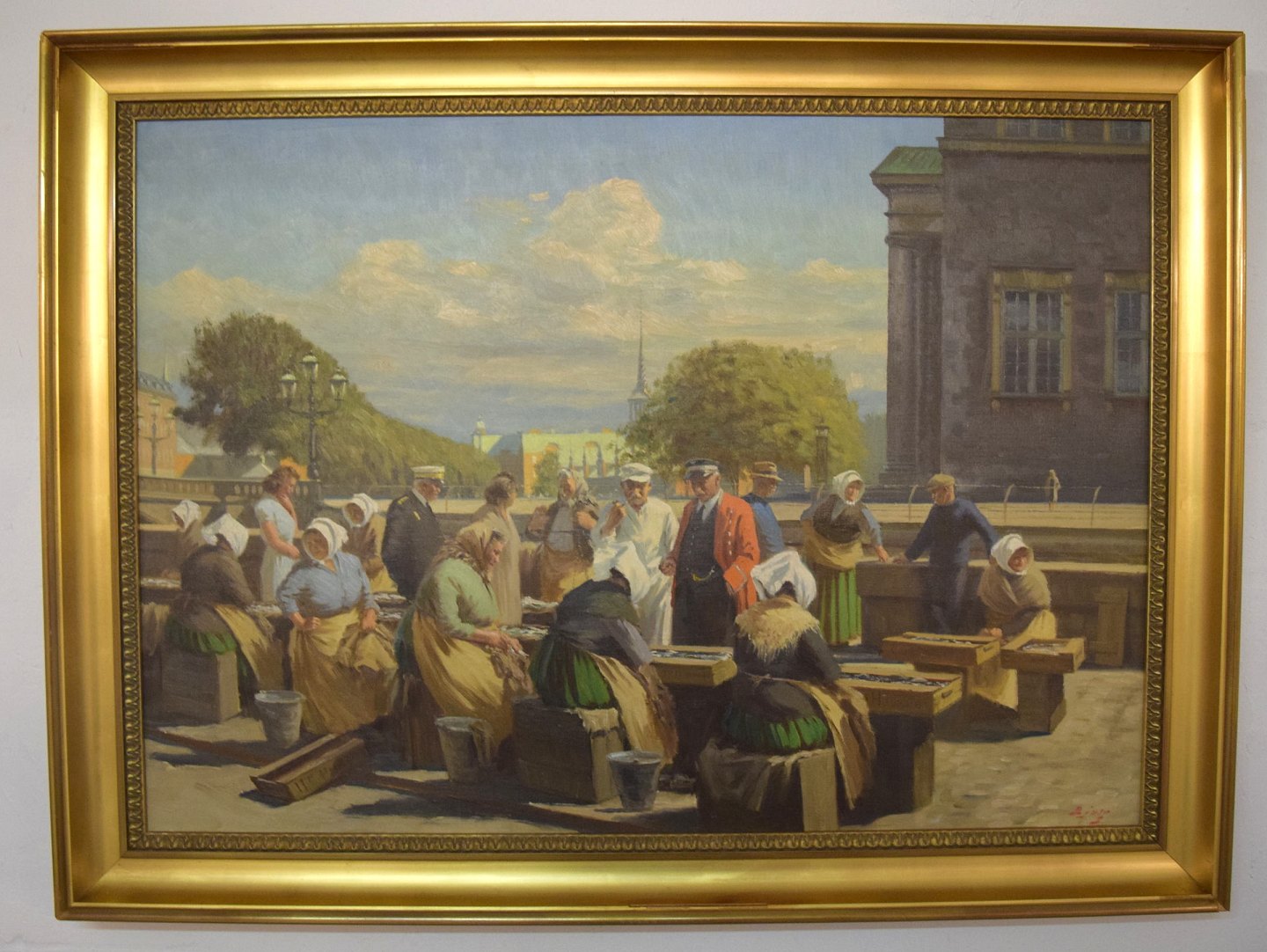 Søren Christian Bjulf (1890-1958). Oil on canvas. Fishwives at the Old Dock selling the day's catch. Beautiful summer atmosphere in Copenhagen.