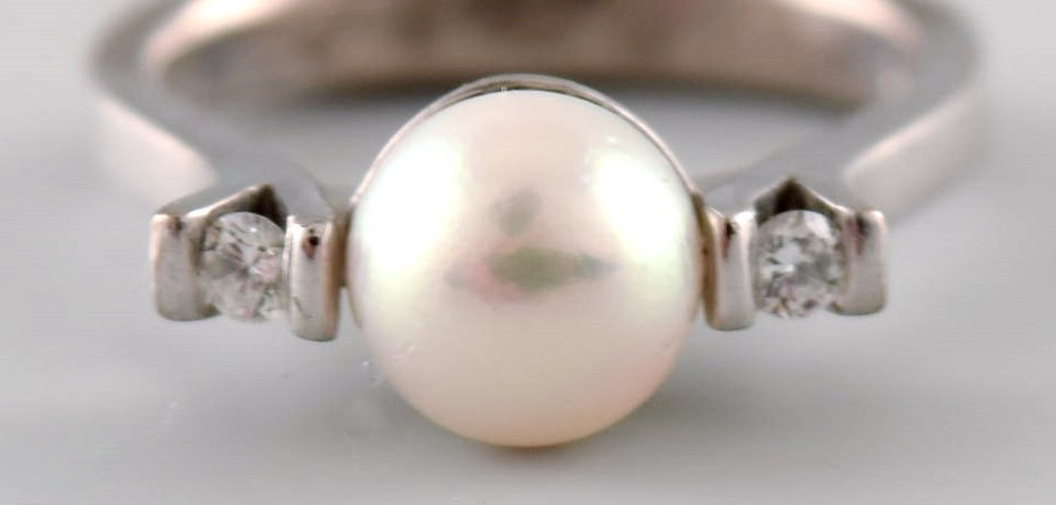 Ring af 18 kt. hvidguld prydet med en akoya saltvandskulturperle (Ø: 6,4 cm). Prydet med to brillantslebne diamanter (ca. 0.06 ct).