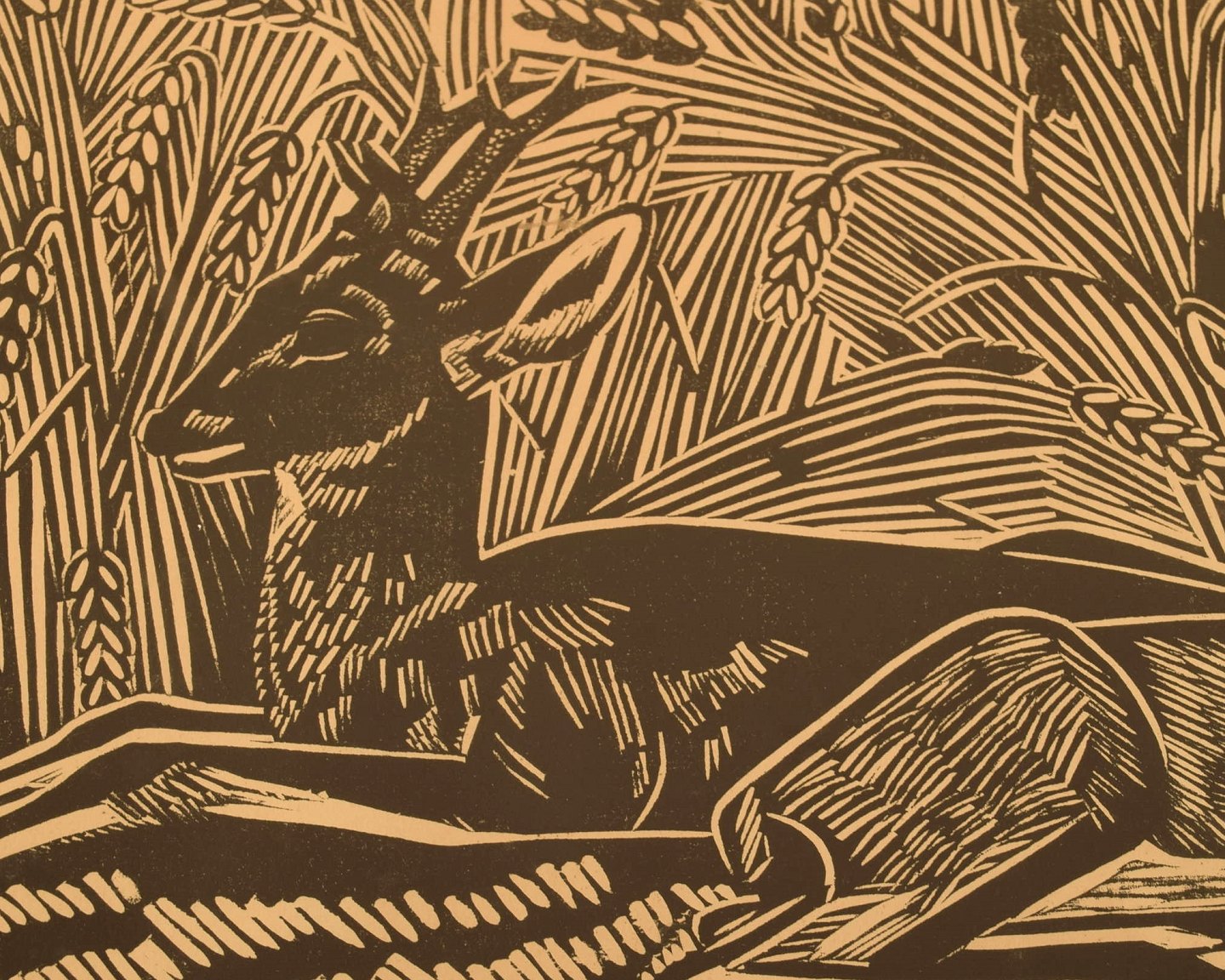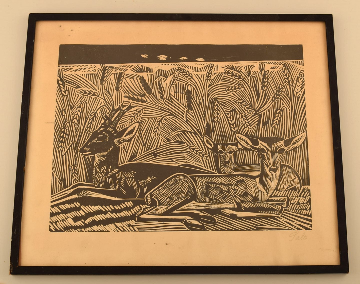 Axel Salto, litografi. Liggende hjorte i kornmark.