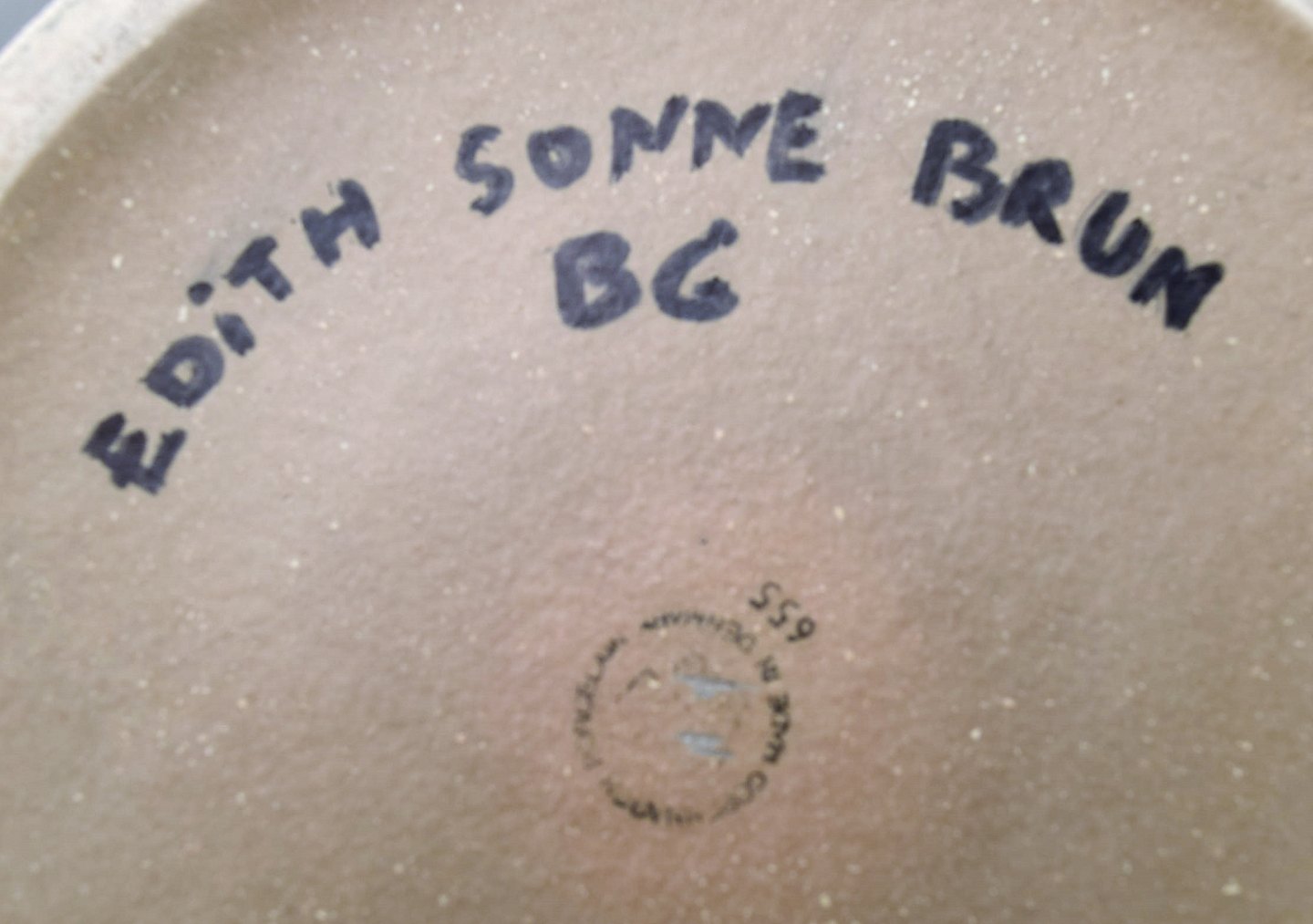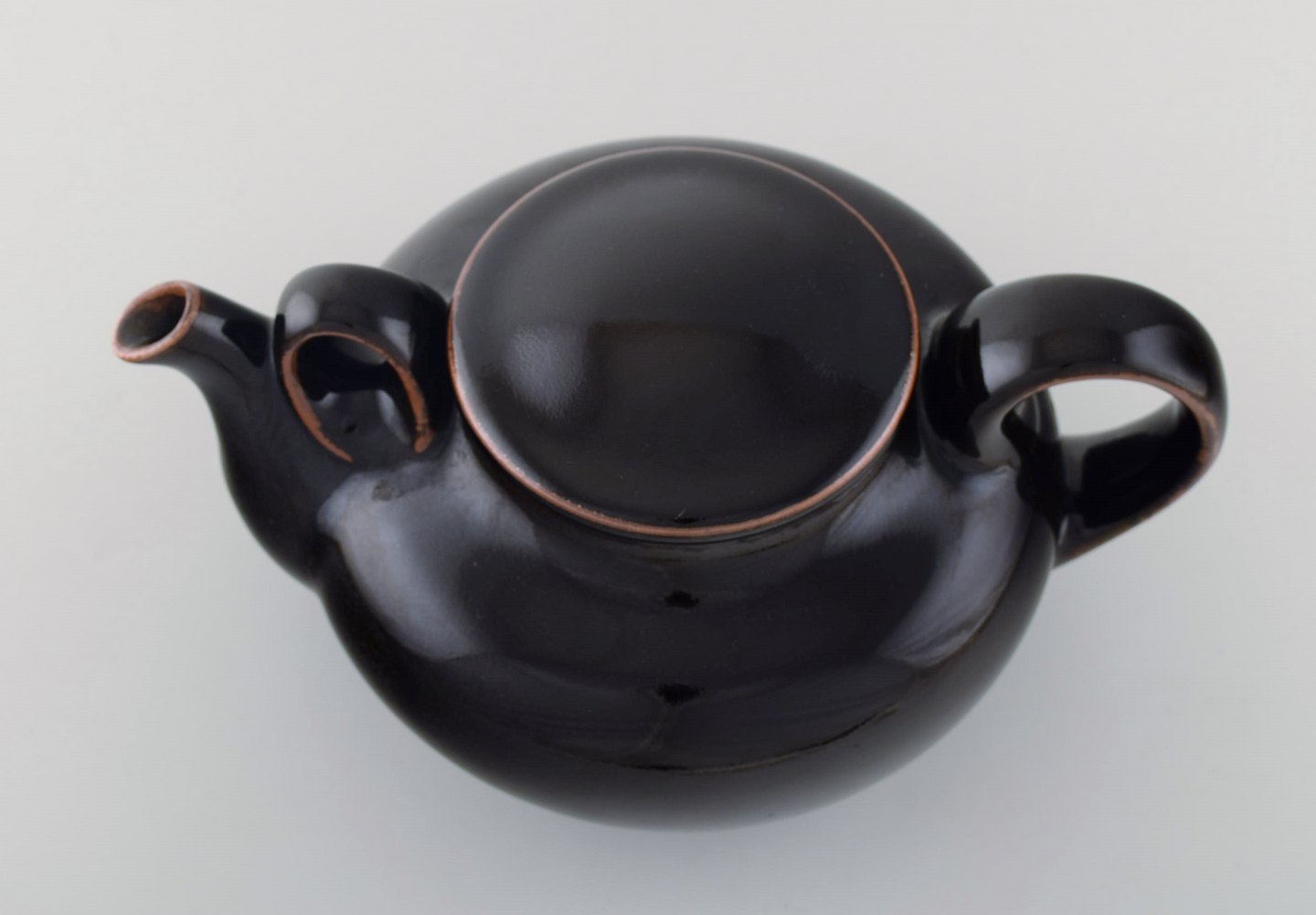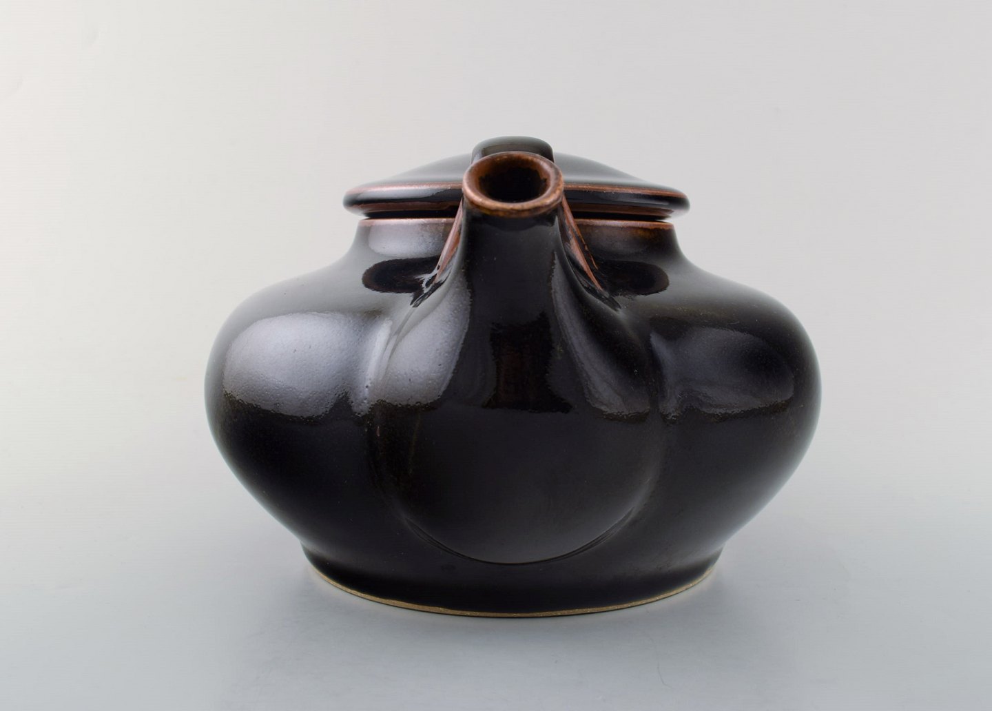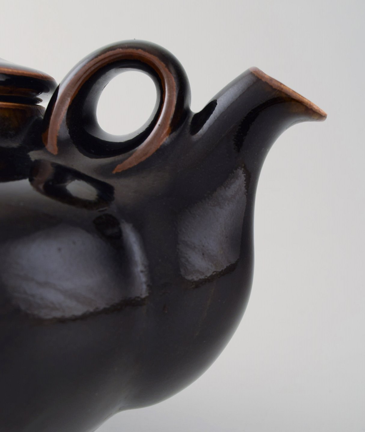 Edith Sonne Bruun for Bing & Grøndahl / B&G. Stor thekande i stentøj, dekoreret i brune nuancer. 1960'erne.