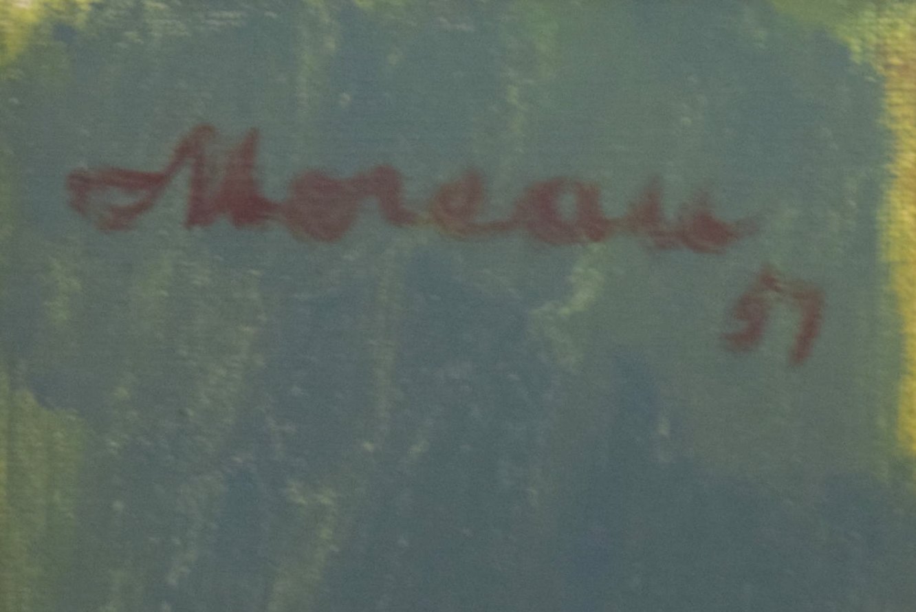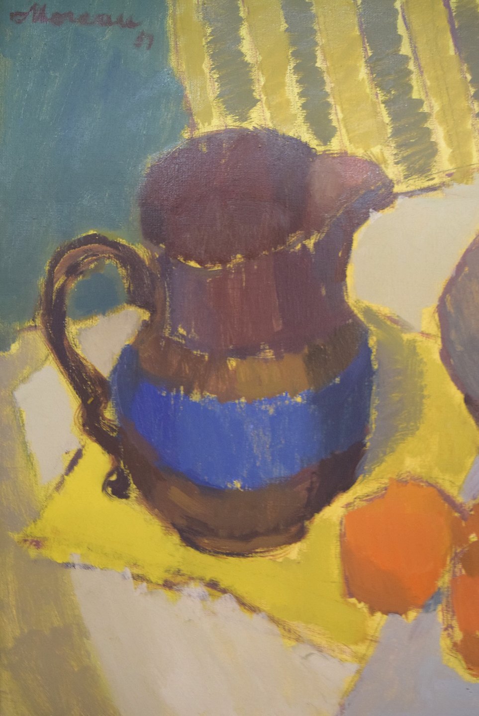 Nils Moreau, Svensk kunstner. Modernistisk stilleben med kande og appelsiner. Olie på lærred. I flot stand. Signeret. Måler: 54 x 45 x 14 cm.