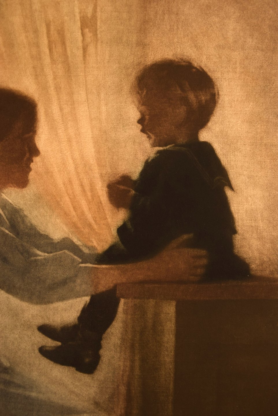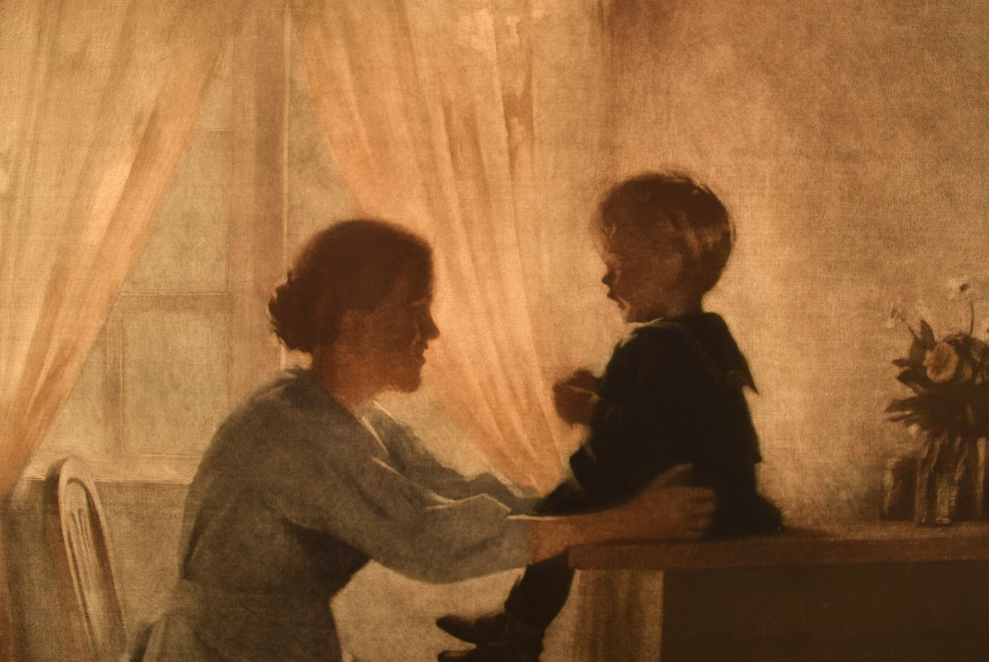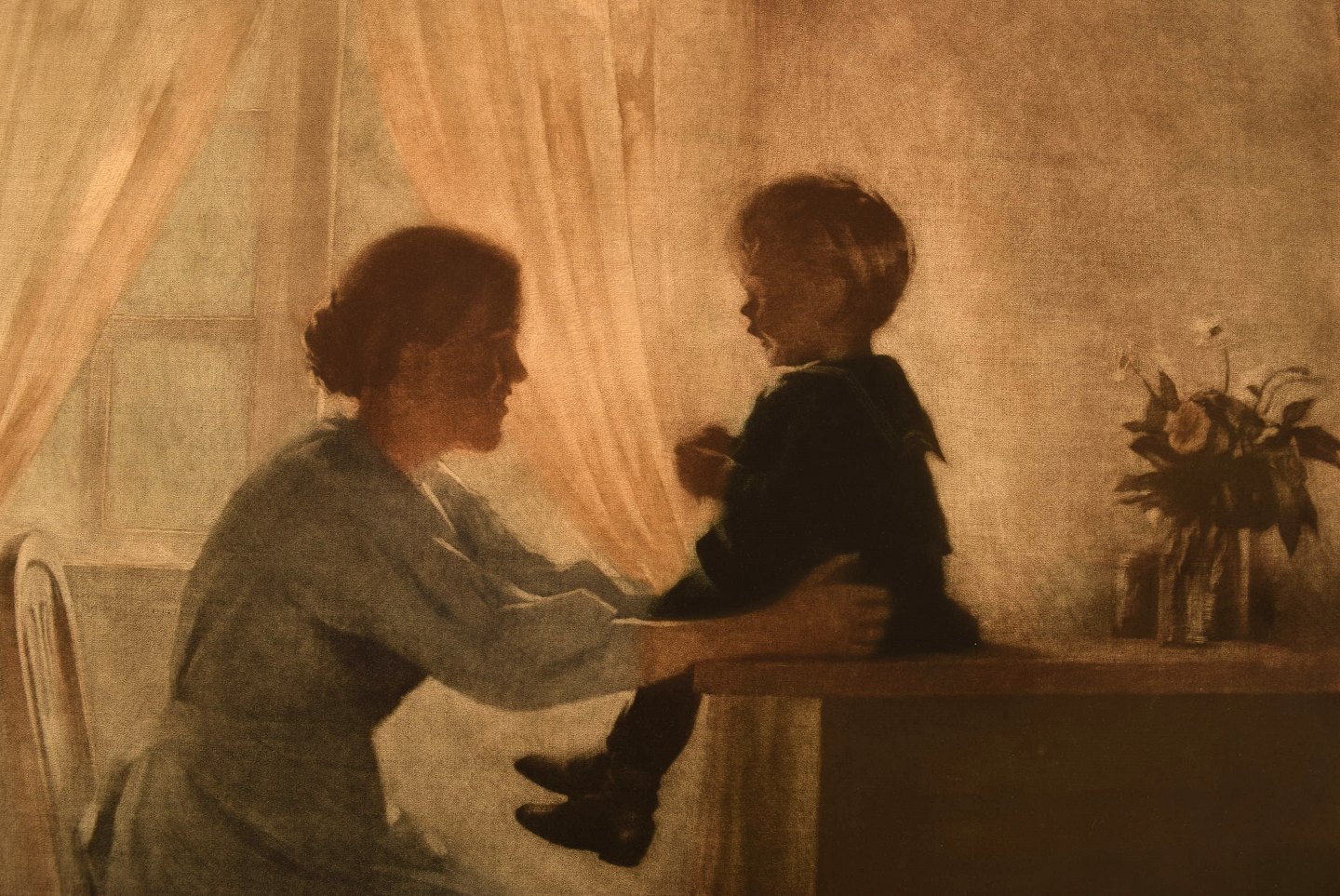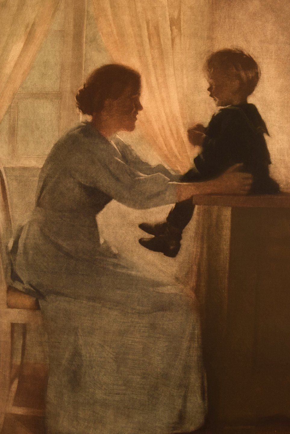 Sjælden Peter Ilsted (1861-1933). Interiør med moder og barn. mezzotinte i farver.