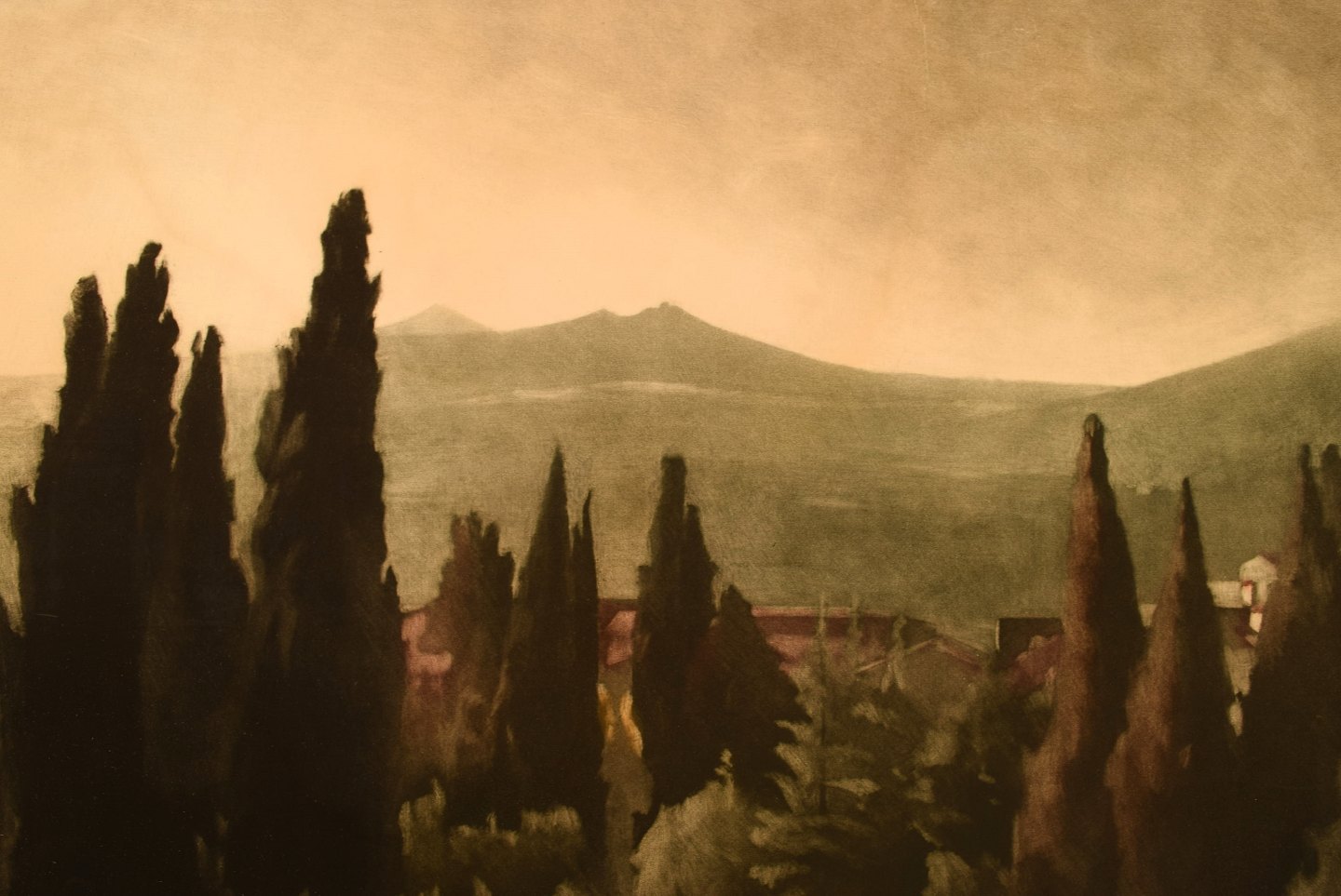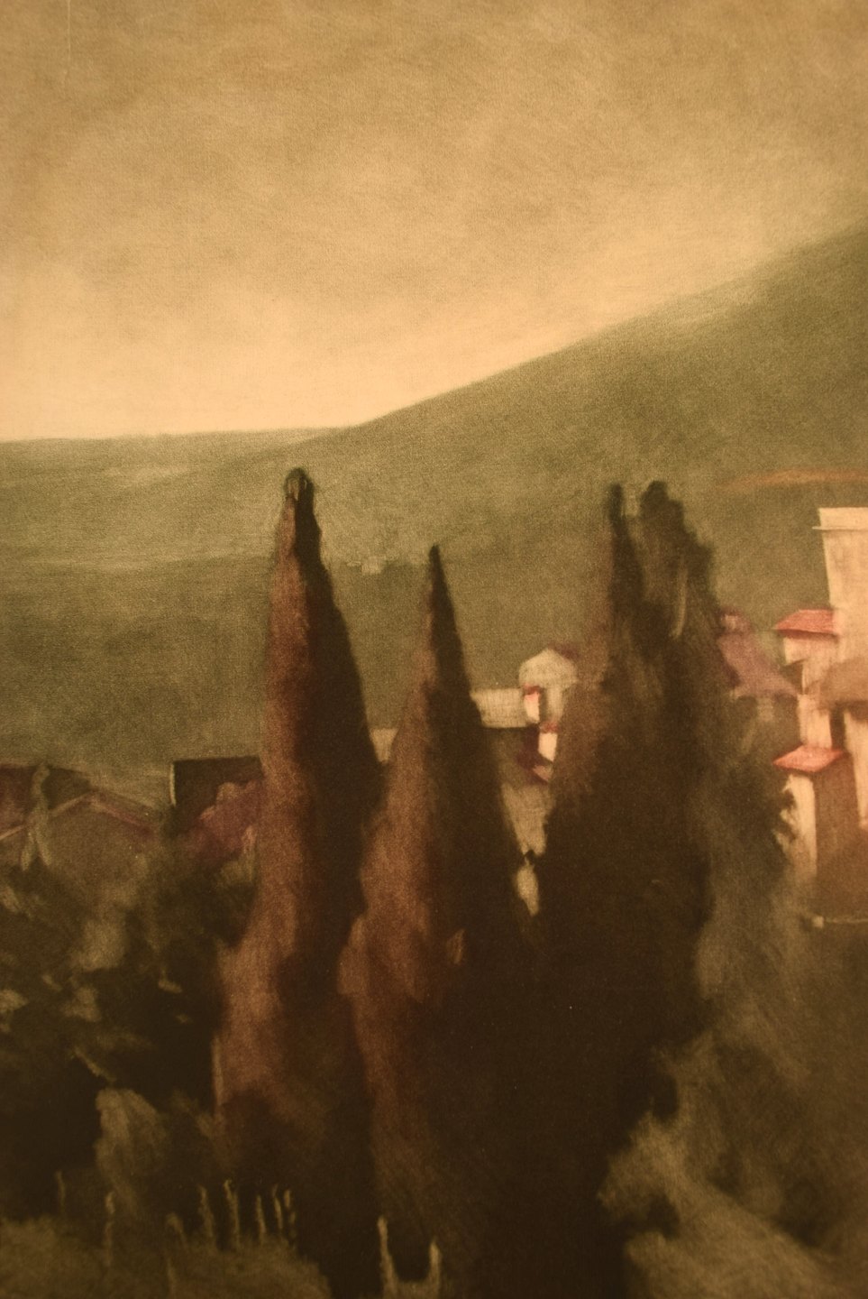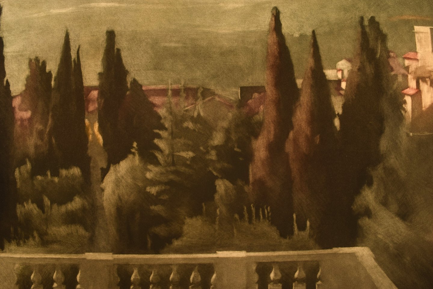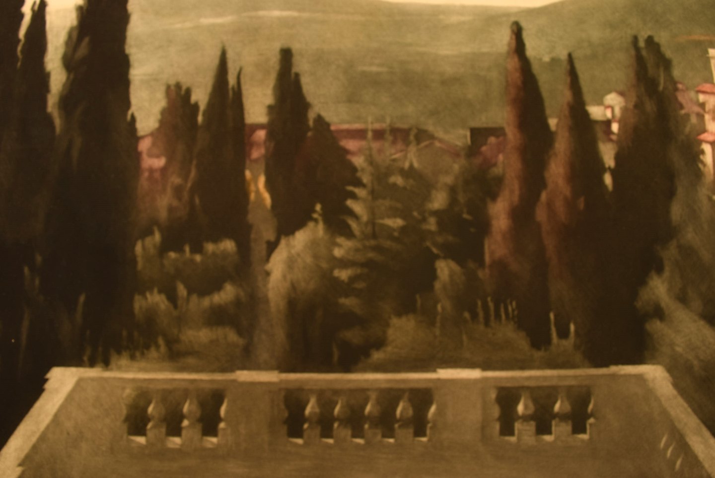 Peter Ilsted 1863-1933. "Udsigten fra Villa d'Este". Opus 31, 1914. Mezzotinte i farver.