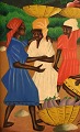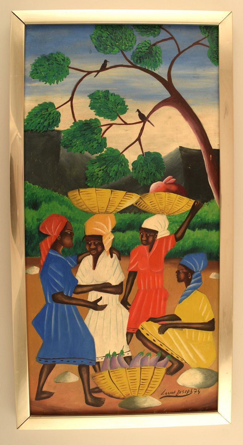 Loccas Joseph, haitiansk kunstner. Naivistisk skole. Olie på plade. 1974. Landsbykvinder bærende på frugter. Signeret. I flot stand. Lærredet måler: 59 x 29 cm. Rammen måler: 2 cm.