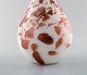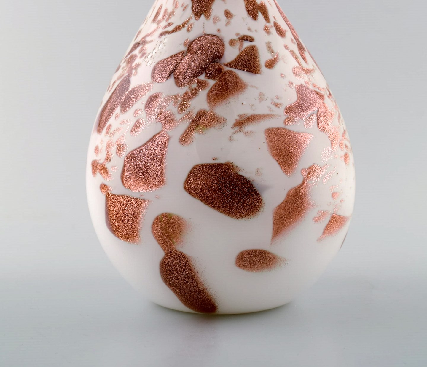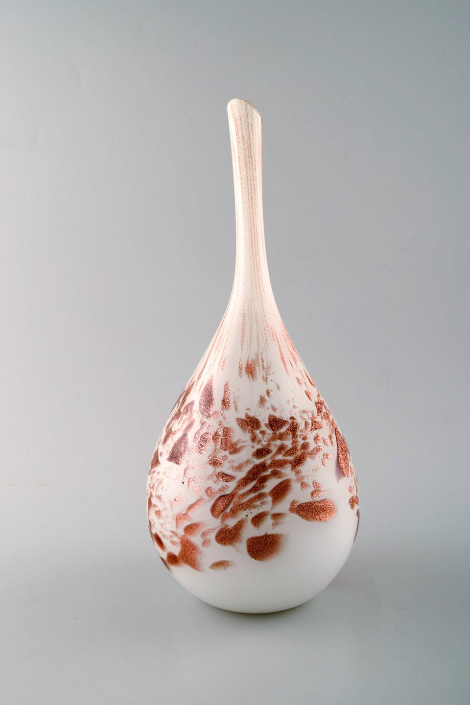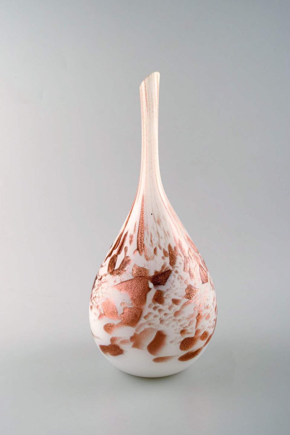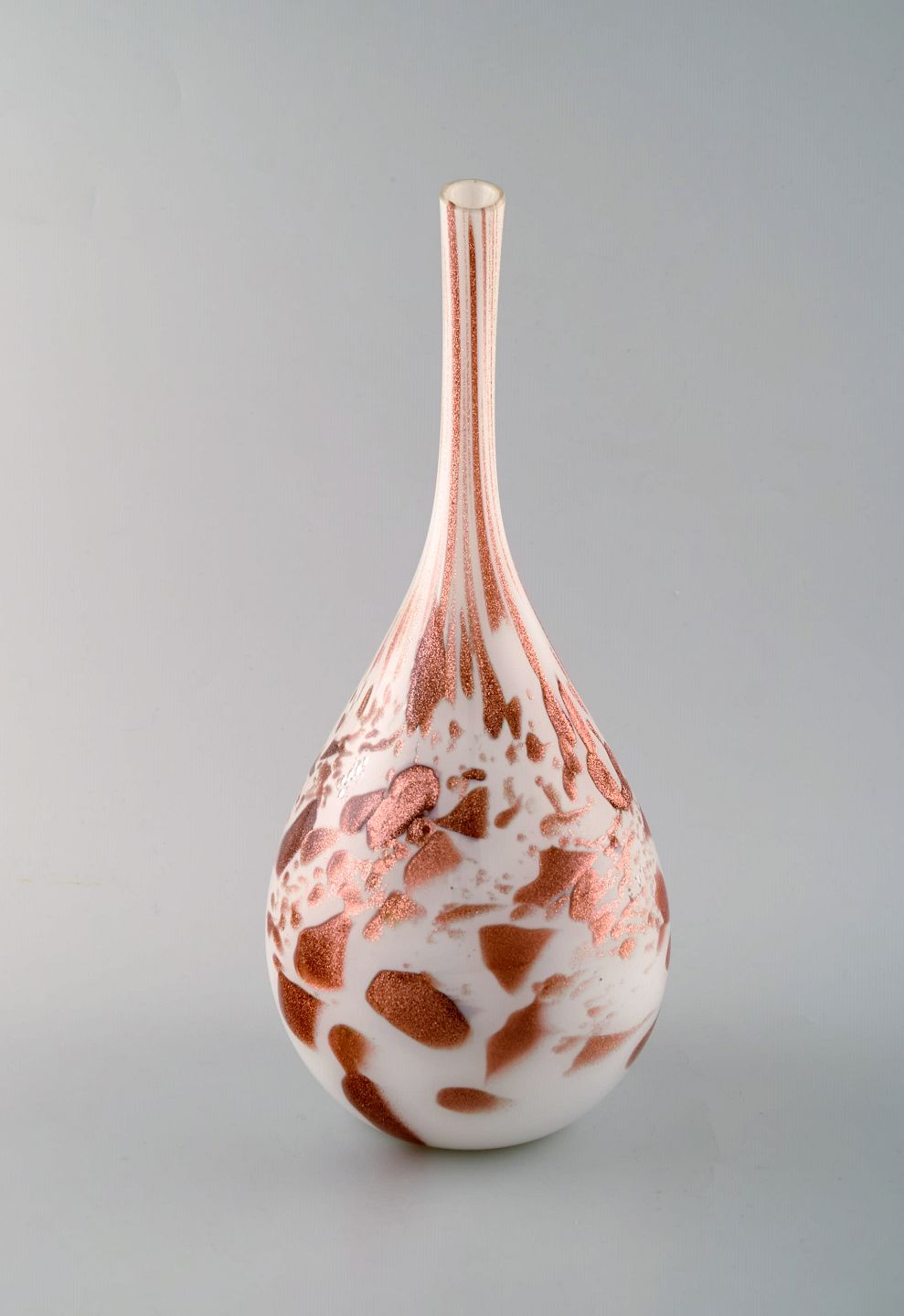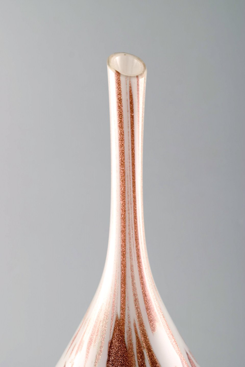 Murano vase with slim neck in mouth blown artificial glass. Brass colored on white base. 1960's. In perfect condition. Measures: 30 x 14.5 cm.