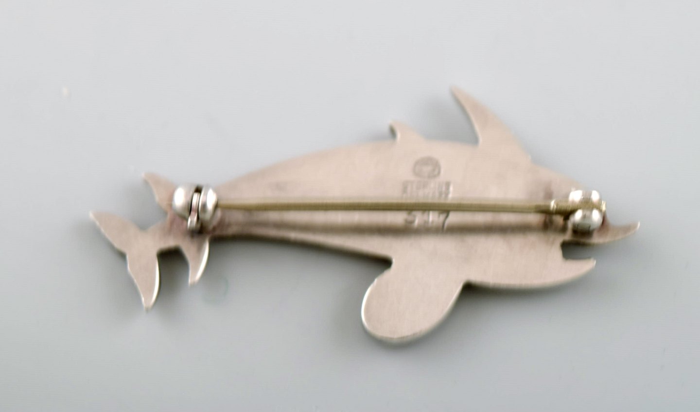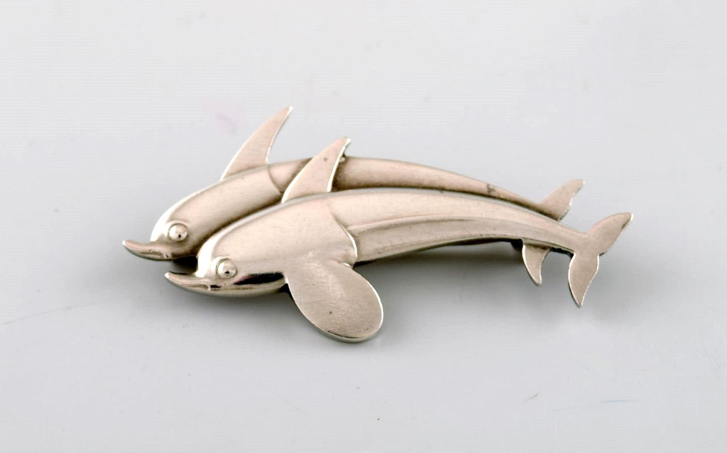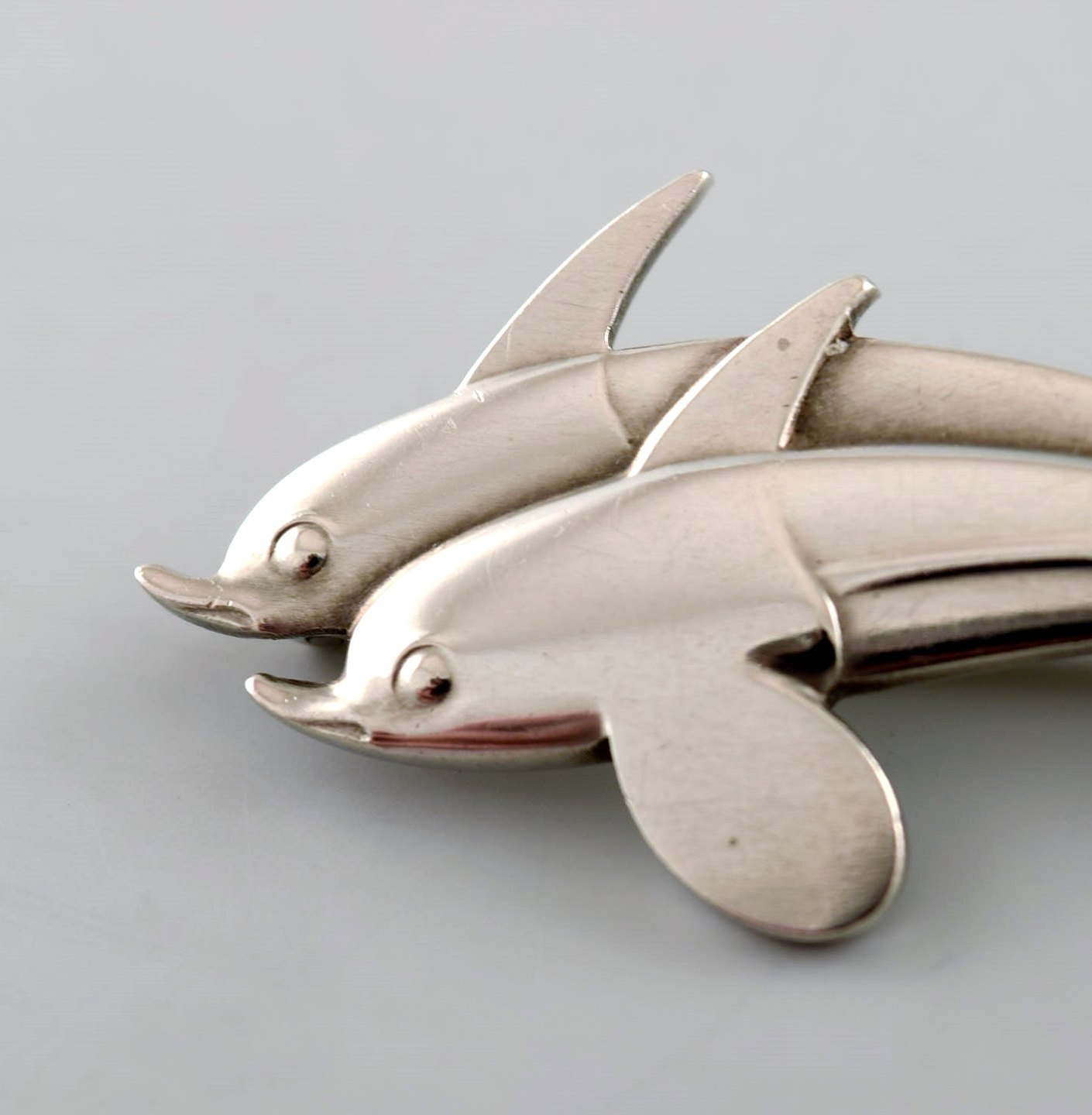 Sterling silver brooch by Georg Jensen. Design number 311. Two dolphins. Stamped. In very good condition. Measures: 4.2 x 1.8 cm.