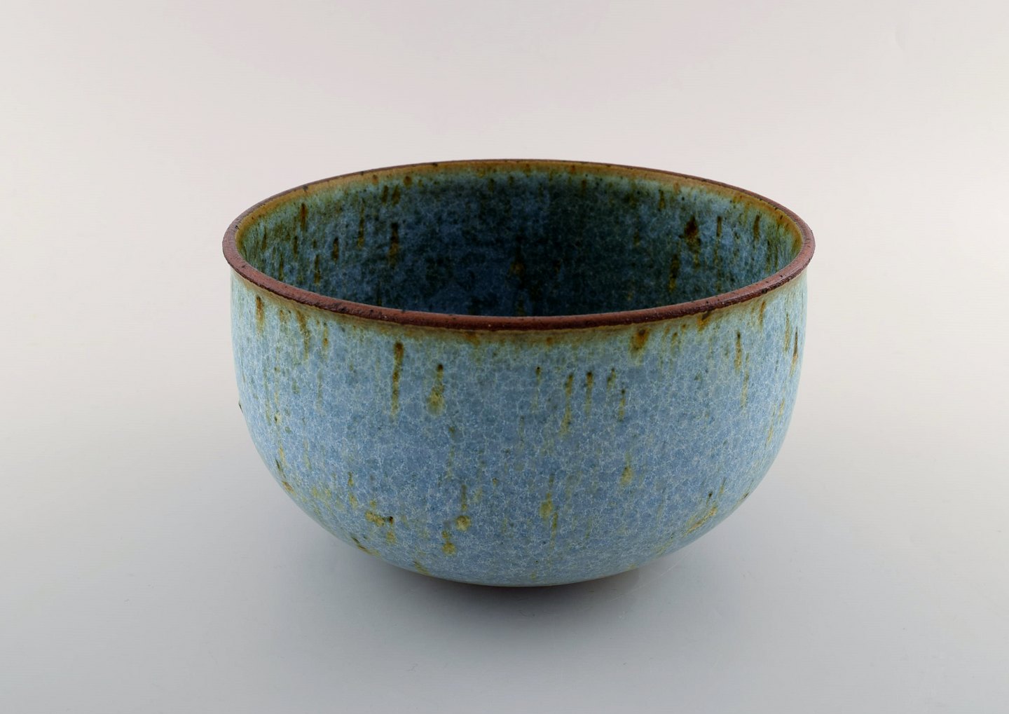 Helle Allpass (1932-2000). Stor skål af glaseret stentøj i smuk turkis glasur med jernpletter. 1960/70'erne.