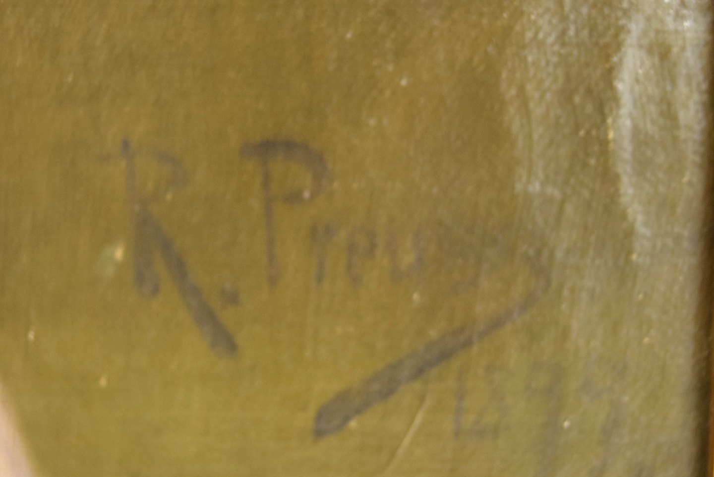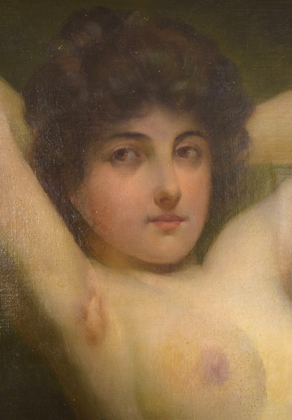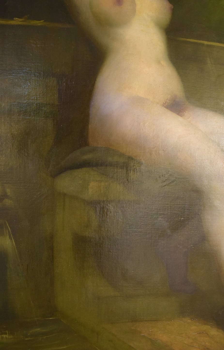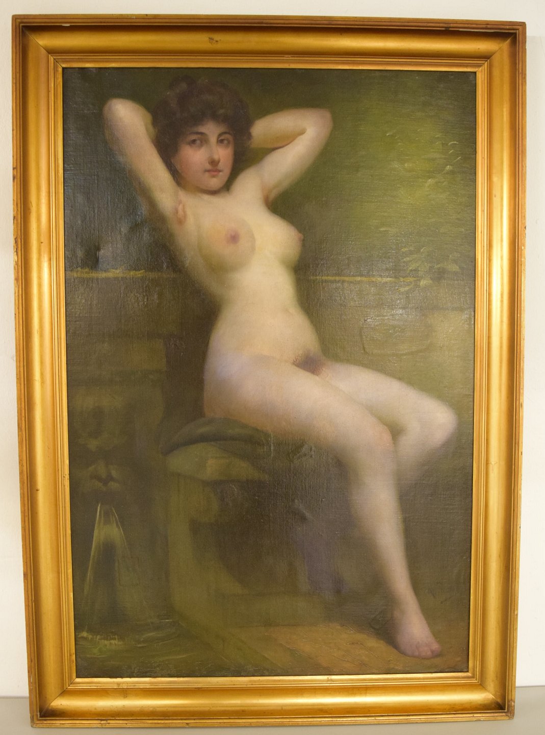 Rudolf Preuss, østrigsk maler (f.1879, d.1961). Olie på lærred. Siddende ung nøgenmodel. Dateret 1899.