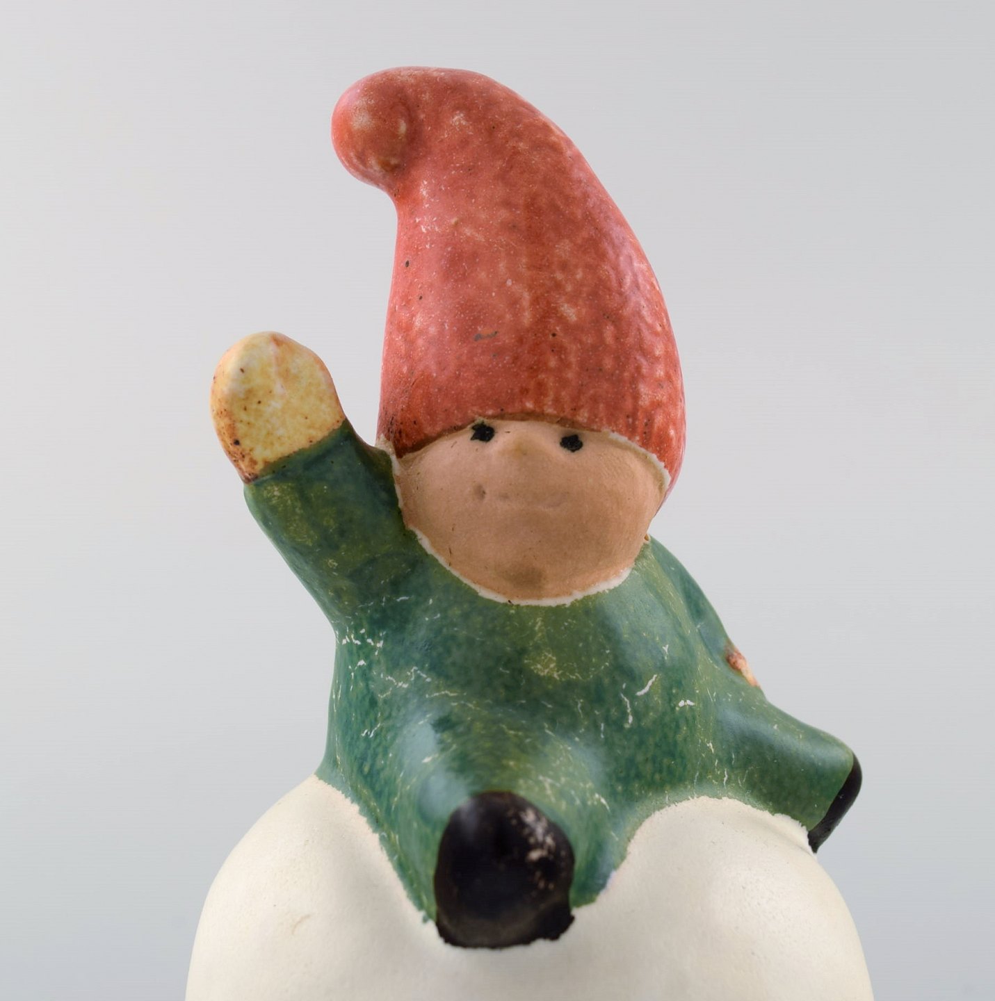 Sjælden Lisa Larson for Gustavsberg. Nisse på snebold. Glaseret stentøj. 1980'erne.