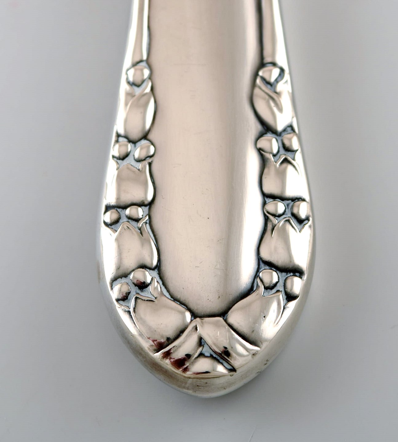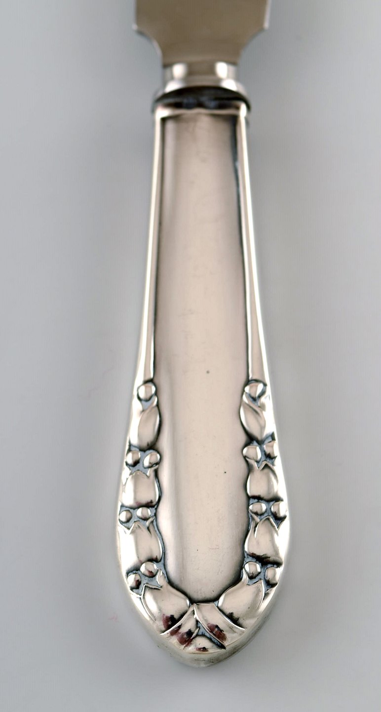 Georg Jensen "Liljekonval" lagkagekniv i sterlingsølv og rustfrit stål. 1915-1930. Måler: 26,5 cm. I flot stand. Stemplet og dateret. Tegnet af Georg Jensen i 1913.