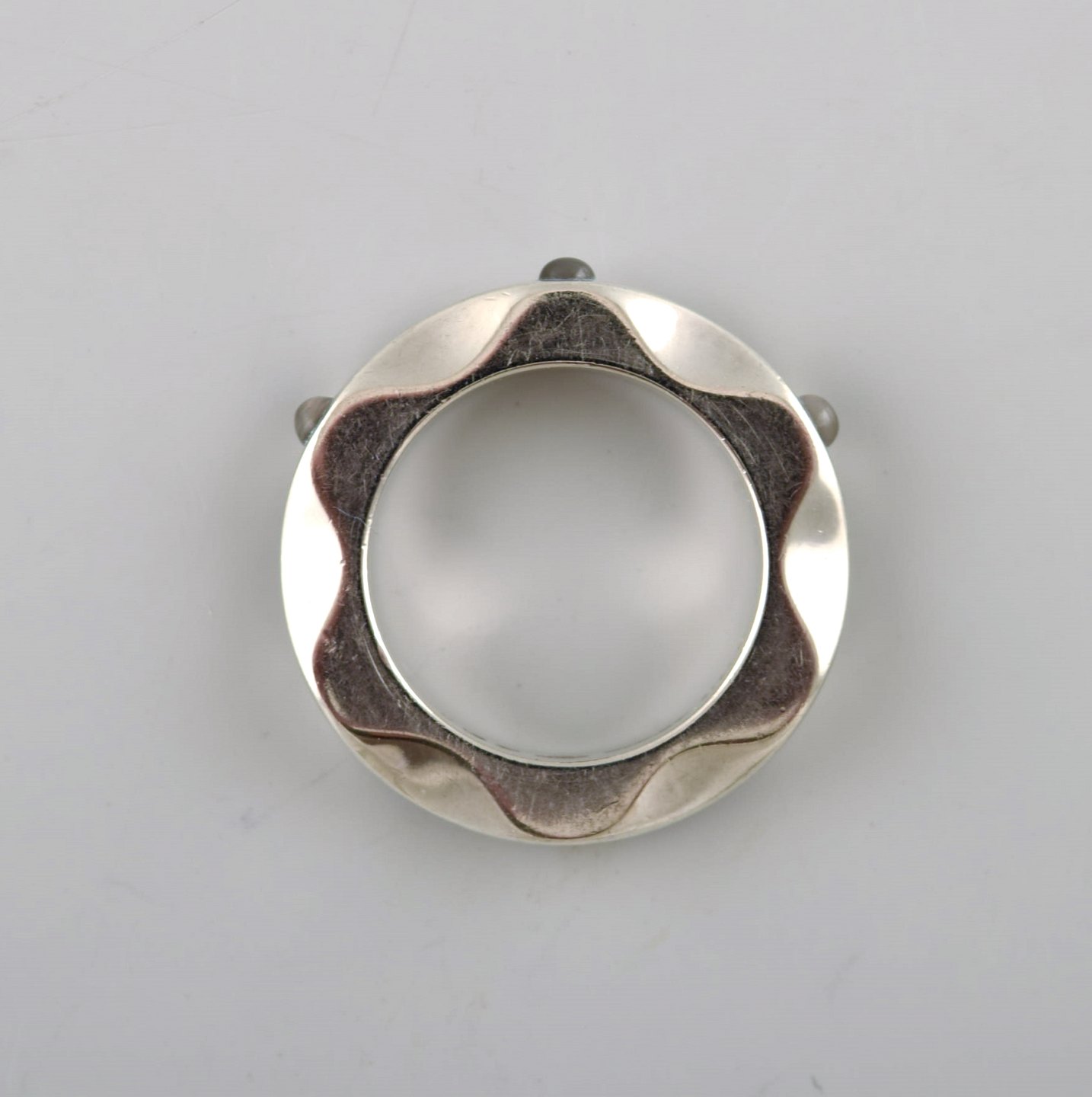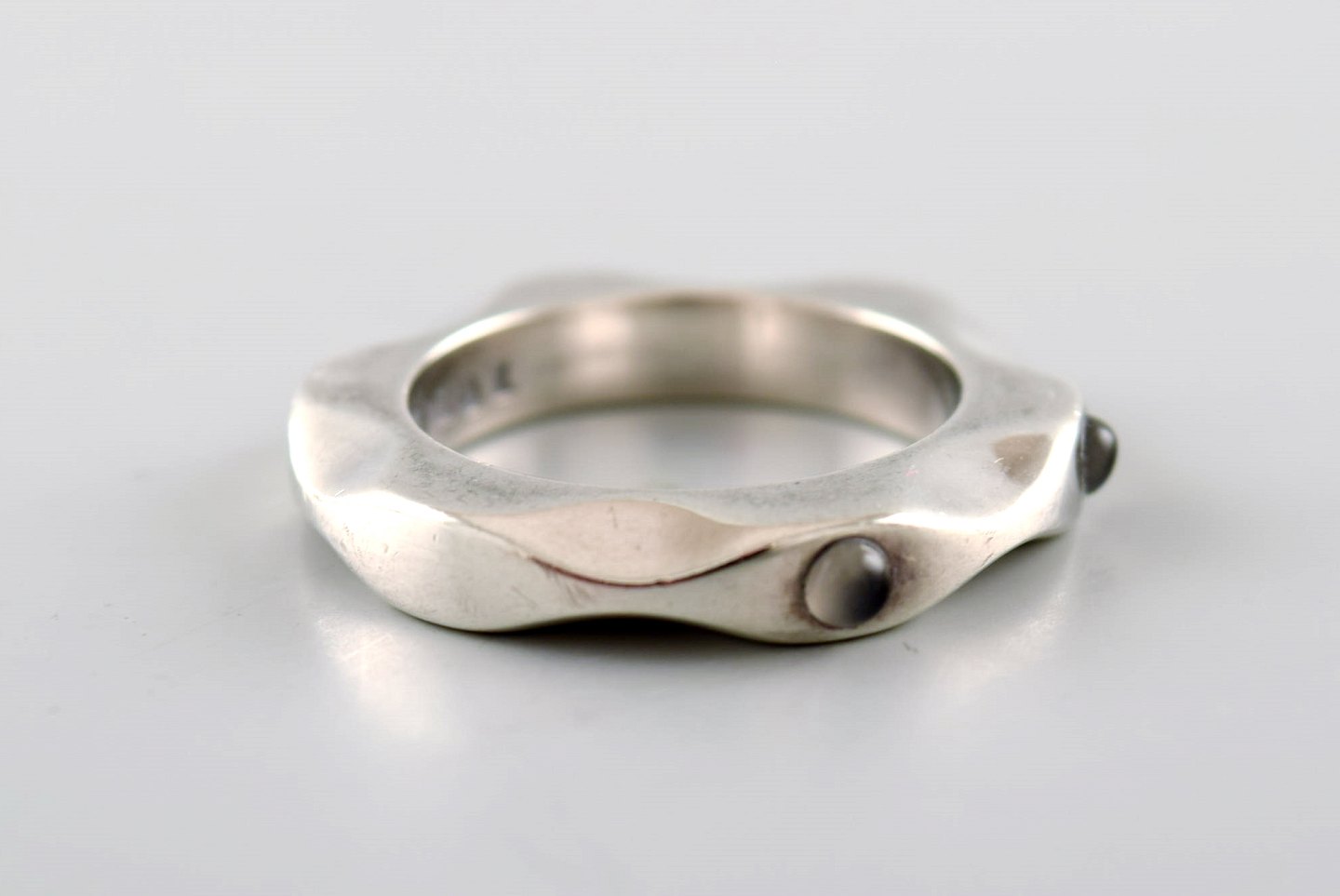 Maria Berntsen for Georg Jensen. "Mirror" ring i sterlingsølv prydet med tre mørkeblå månesten. Modelnummer: 261. Stemplet. 2000-tallet. I flot stand. Måler 17 mm.