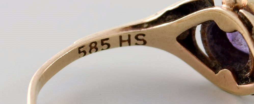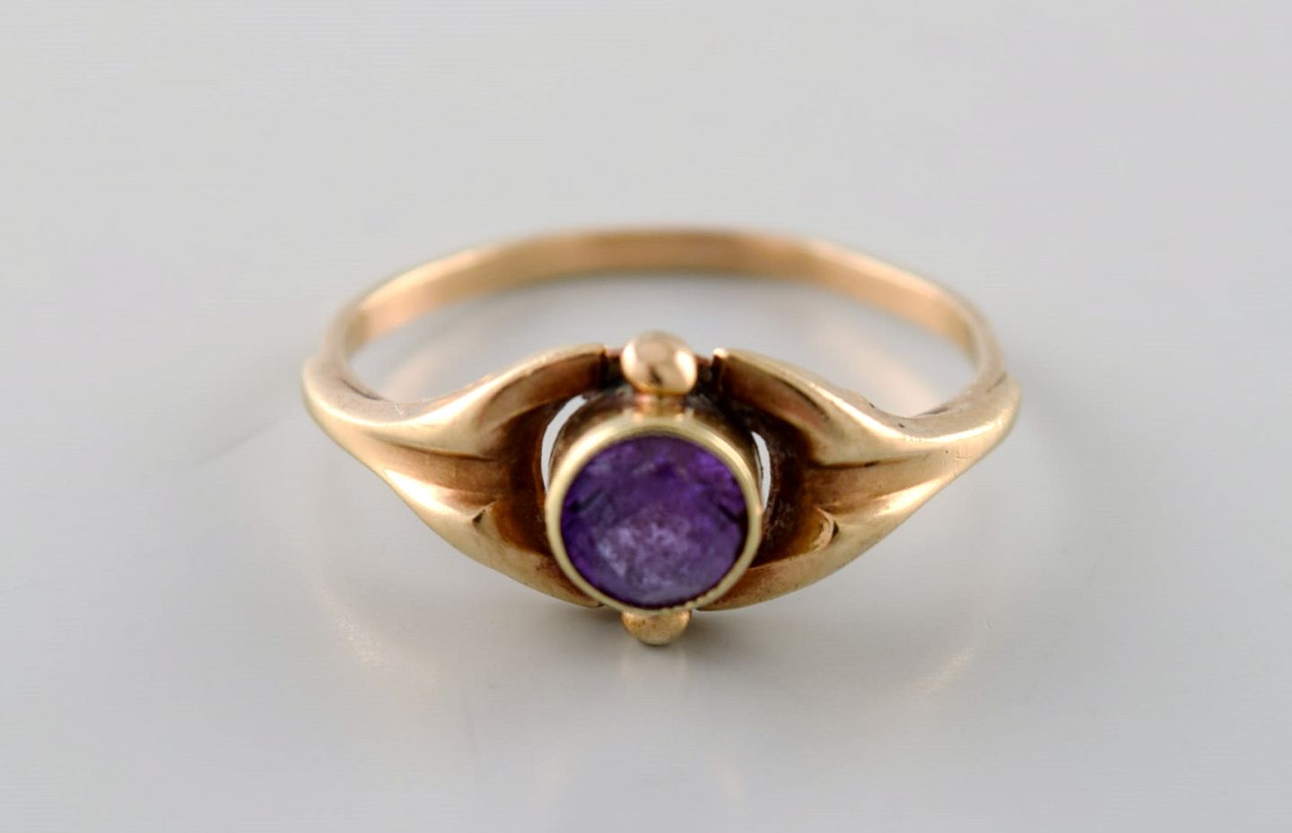 Hermann Siersbøl, dansk guldsmed. Art deco ring af 14 karat guld prydet med lilla sten. 1940'erne.
