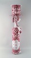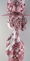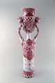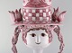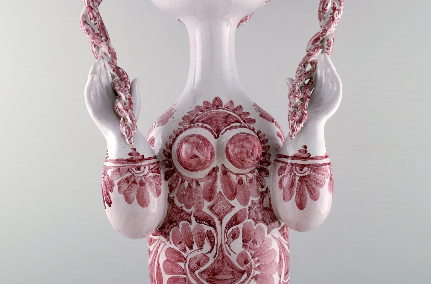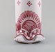 Dekoreret med rødglaserede motiver på lysegrå base, fletninger med mørkerød glasur.