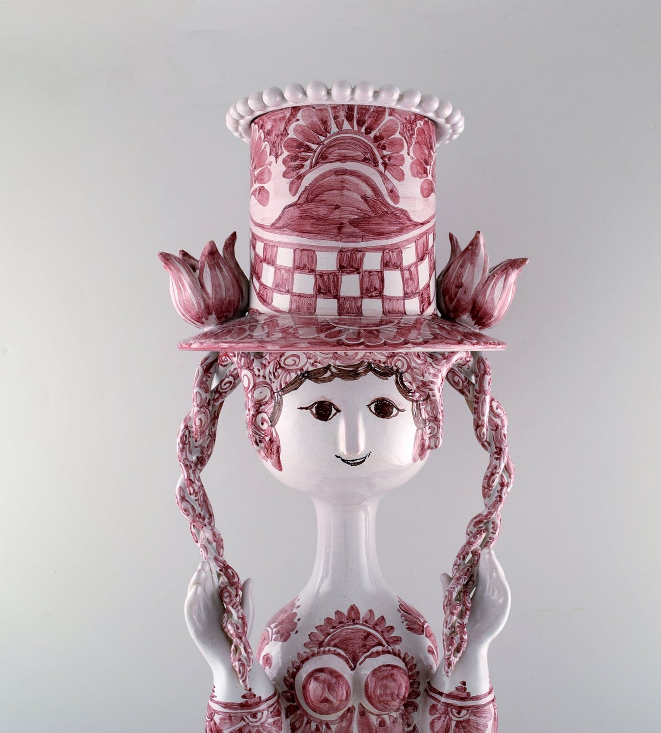 Bjørn Wiinblad: Monumental kvindefigur af lertøj. Øverste del med urtepotteskjuler i form af hat.