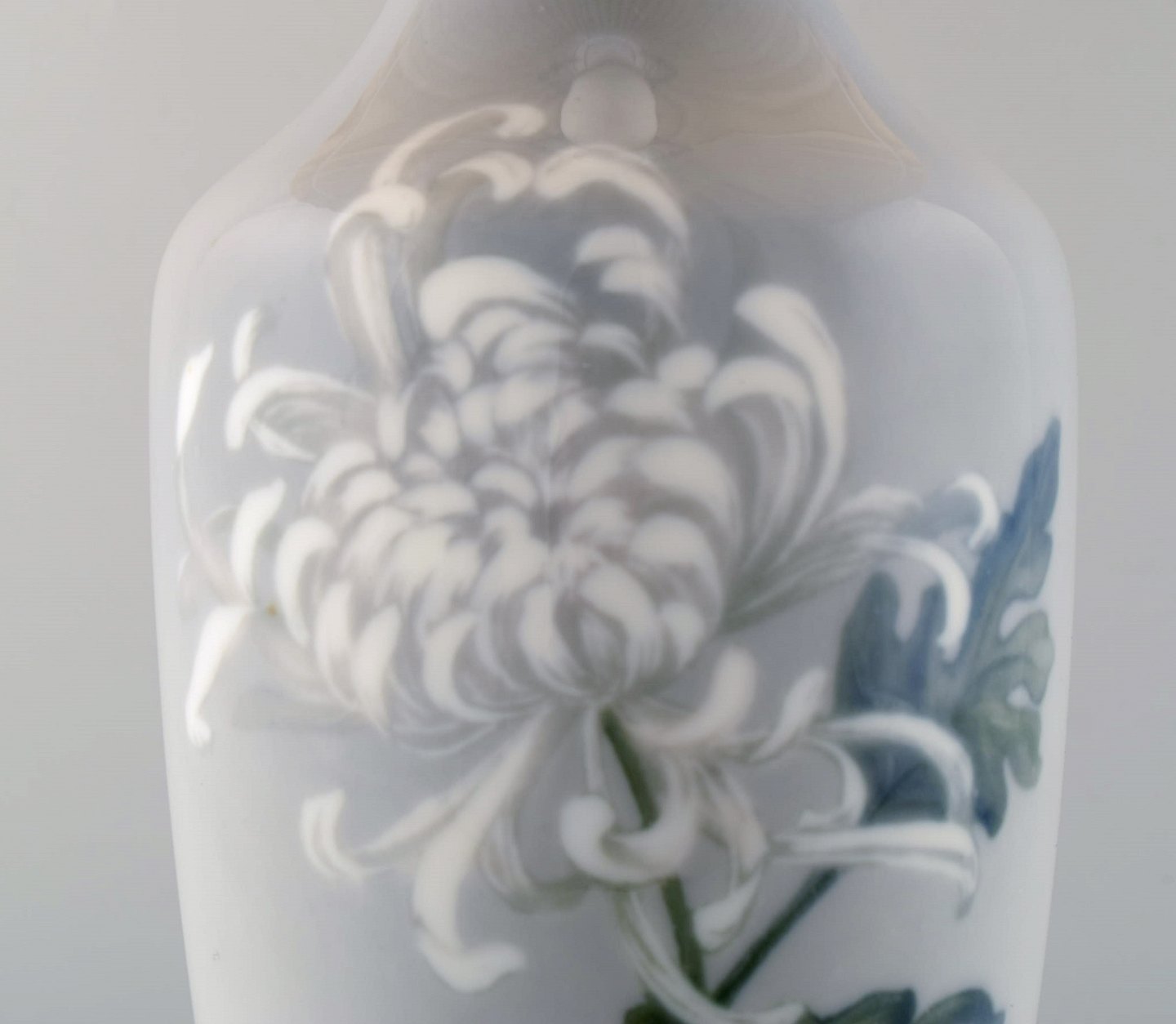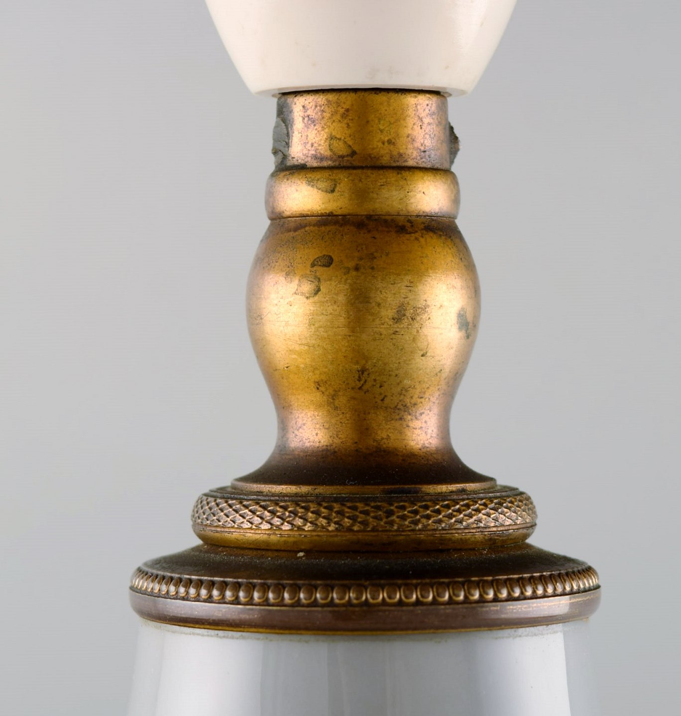 Royal Copenhagen stor bordlampe på messingstand dekoreret med blomster. 1930'erne. Le Klint skærm. I flot stand. Stemplet. 1. Sortering. Total højde 55 cm. Diameter på lampe: 14 cm.