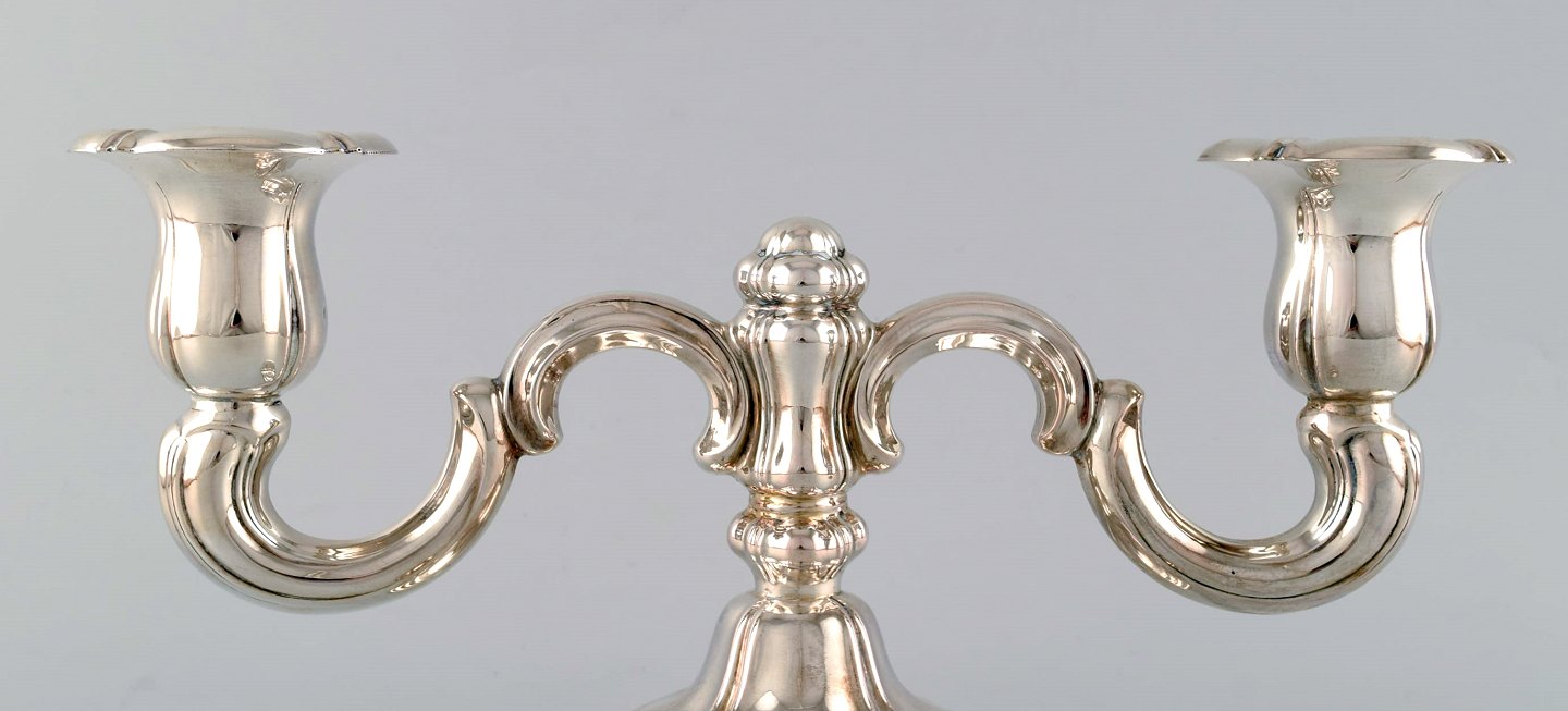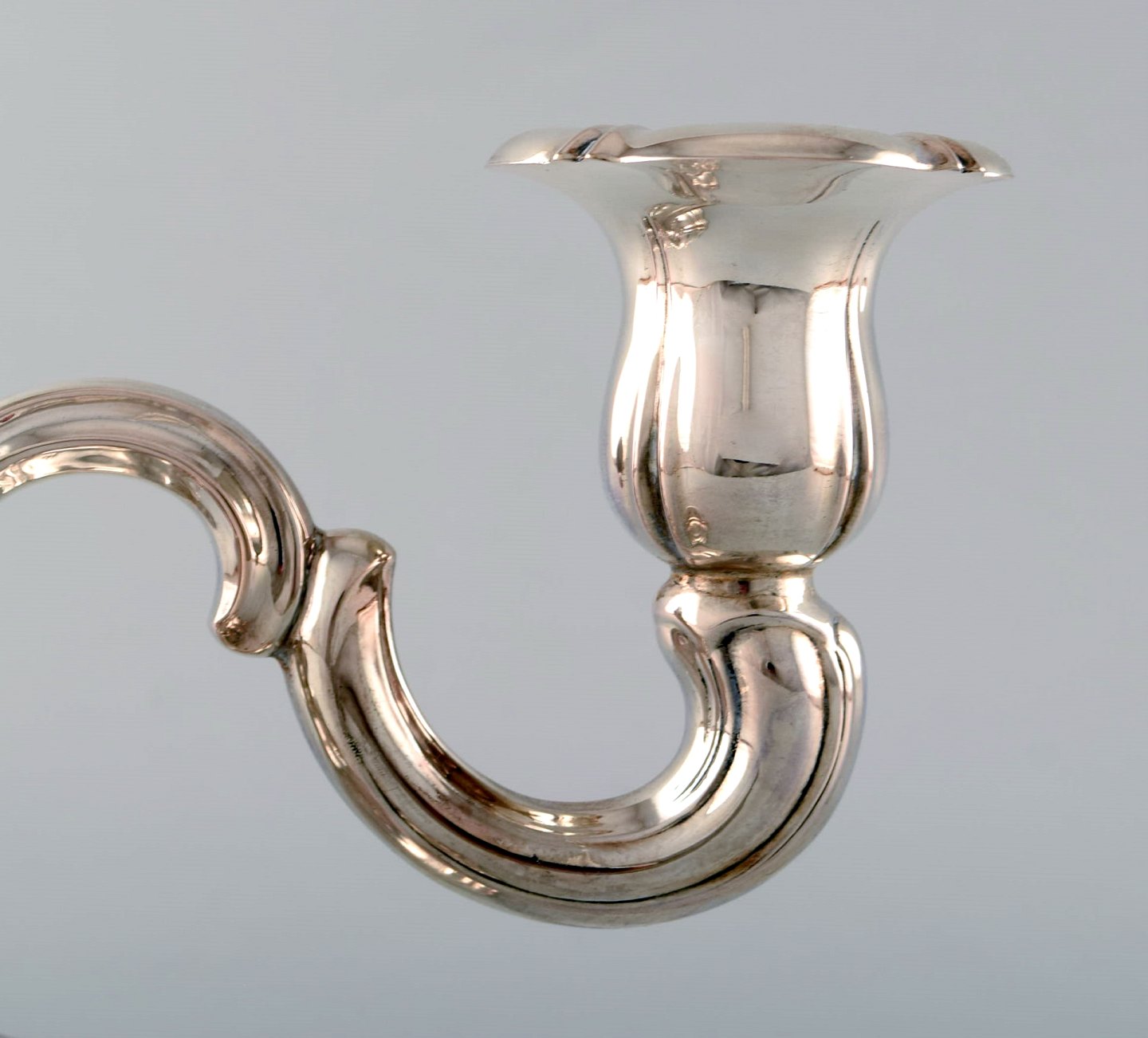 To-armet nyrokoko lysestage med svungne arme i tretårnet sølv. 1930/40'erne. I flot stand. Stemplet. Måler: 29 x 15 cm.