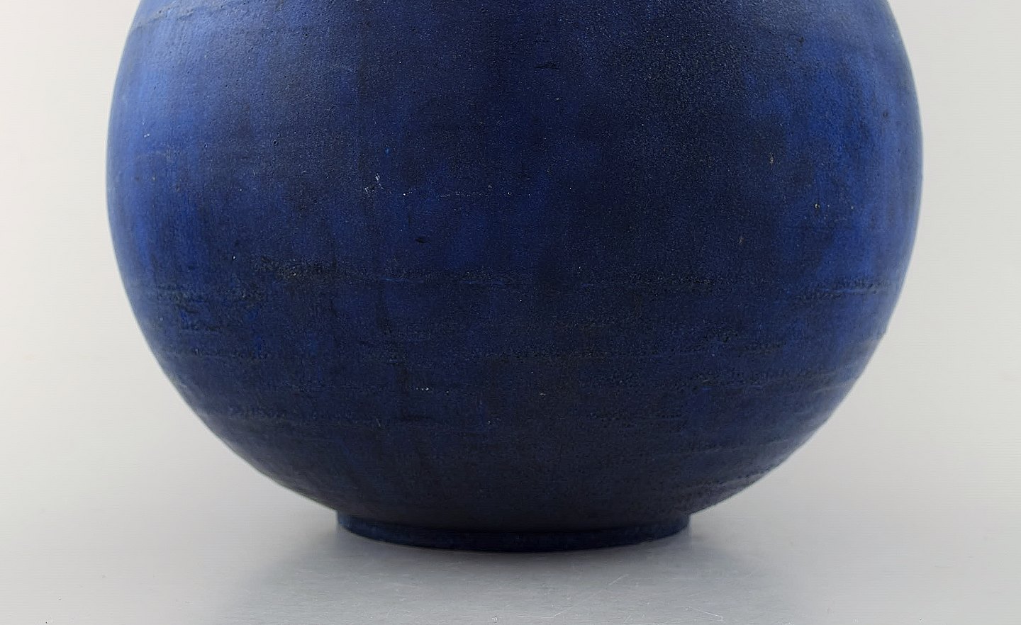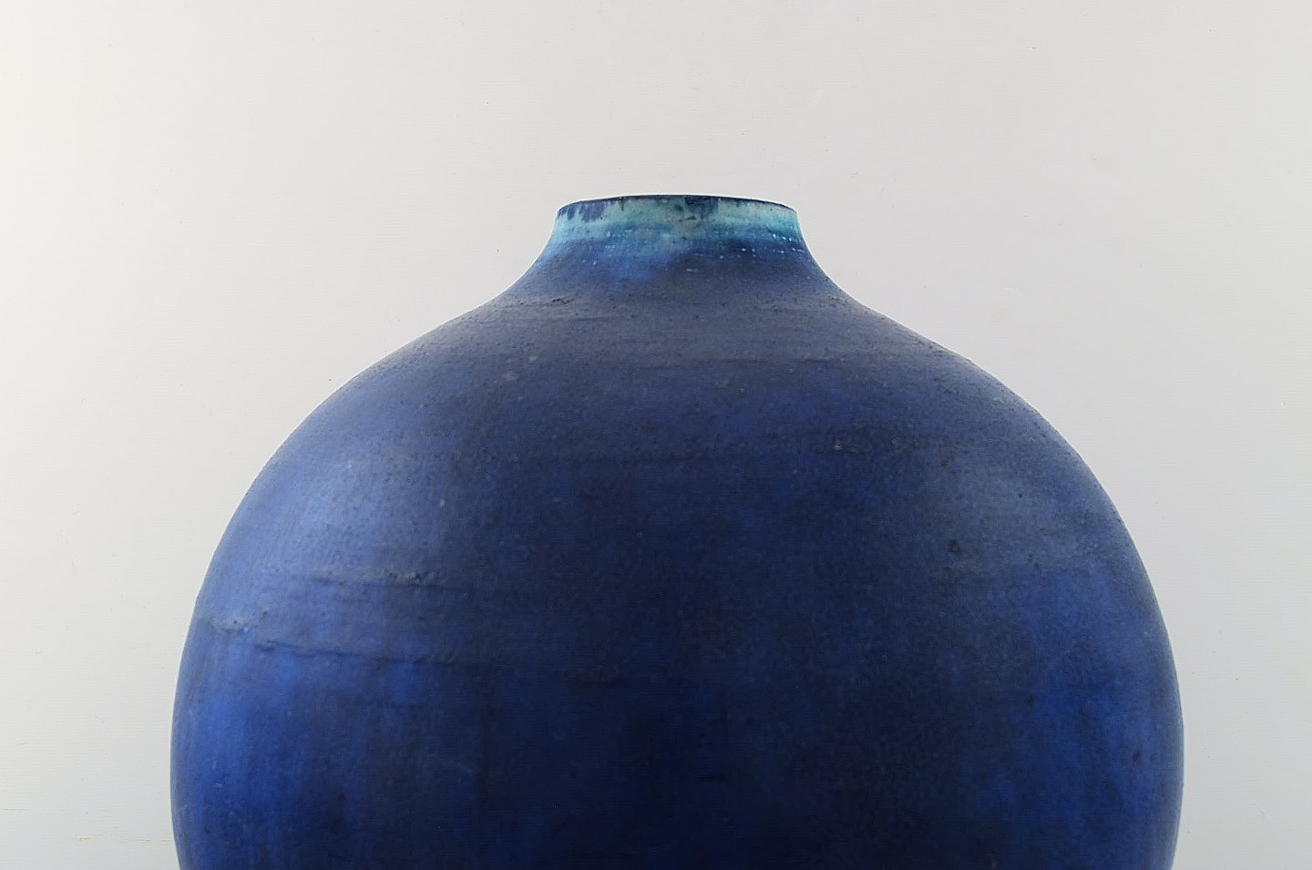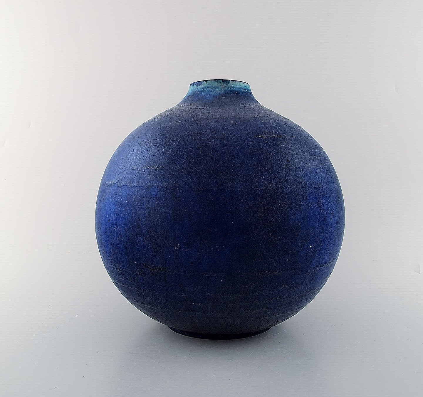Tidlig Saxbo, stor kugleformet keramikvase i moderne design. Usædvanlig smuk glasur i mange nuancer af blå. Ca. 1930. Tidligt stempel. Måler: 29 x 26 cm. I flot stand.