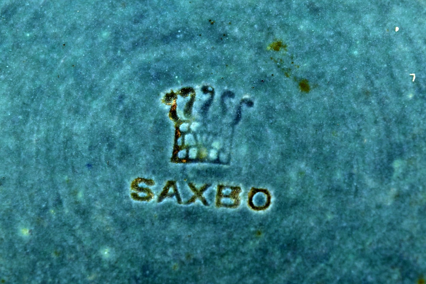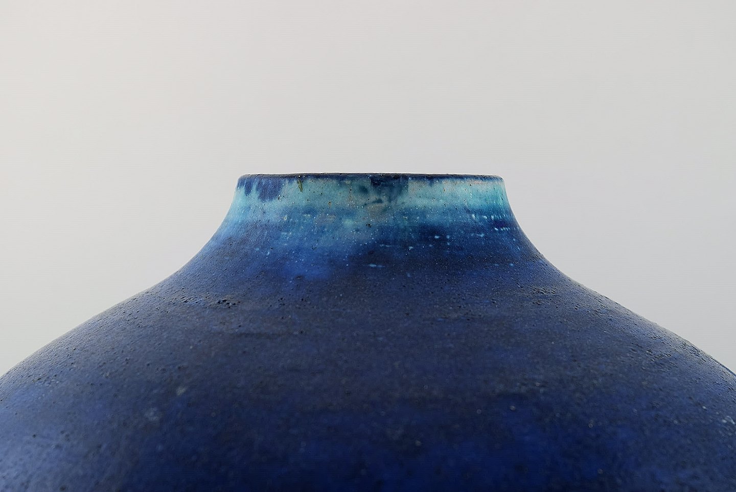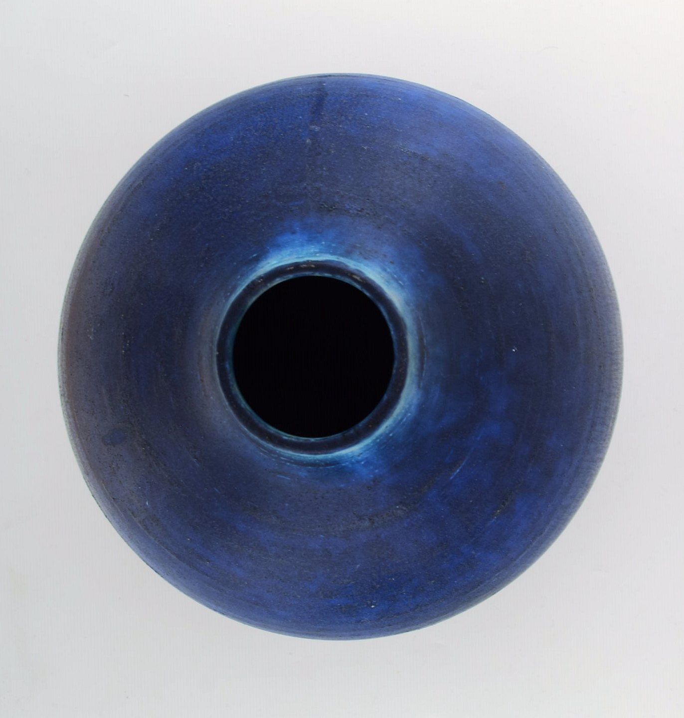 Tidlig Saxbo, stor kugleformet keramikvase i moderne design. Usædvanlig smuk glasur i mange nuancer af blå. Ca. 1930. Tidligt stempel. Måler: 29 x 26 cm. I flot stand.