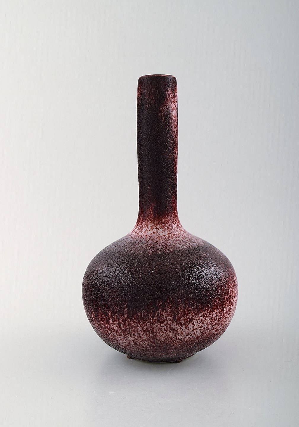 Axel Salto for Royal Copenhagen: Tidlig vase af stentøj. Usædvanlig god okseblodsglasur i mange nuancer. Langhalset form. 1940'erne.