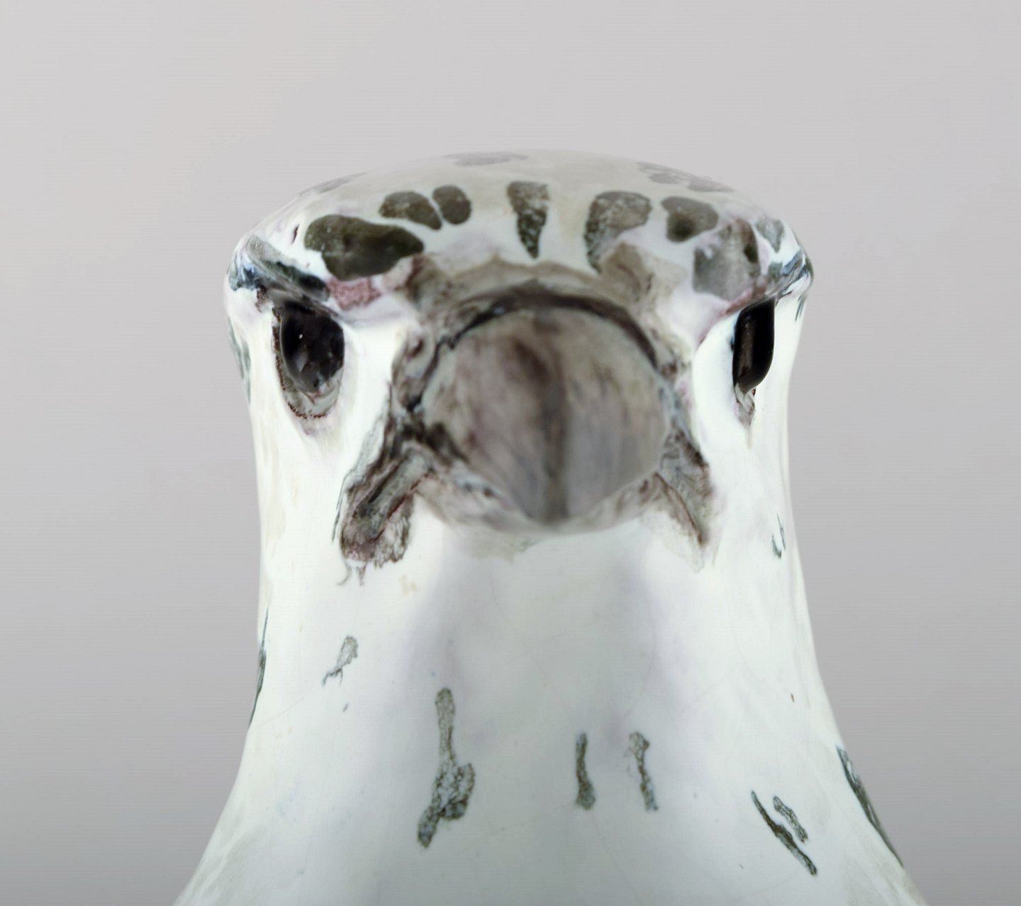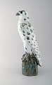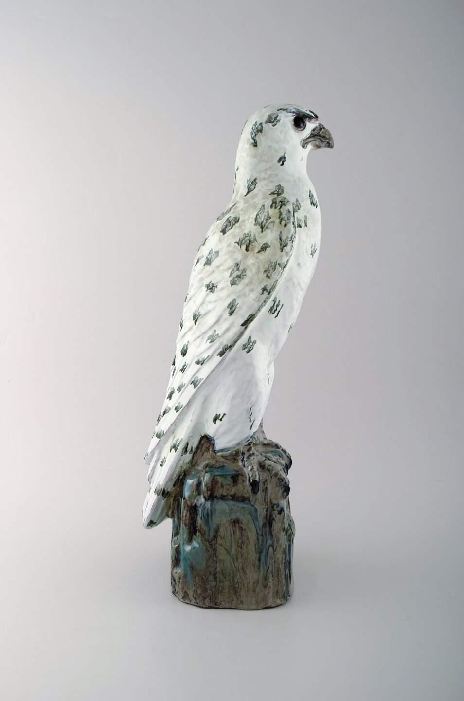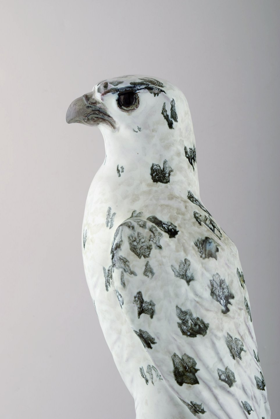 Islandsk falk af keramik dekoreret med grå, grønne, brune og hvid glasur.