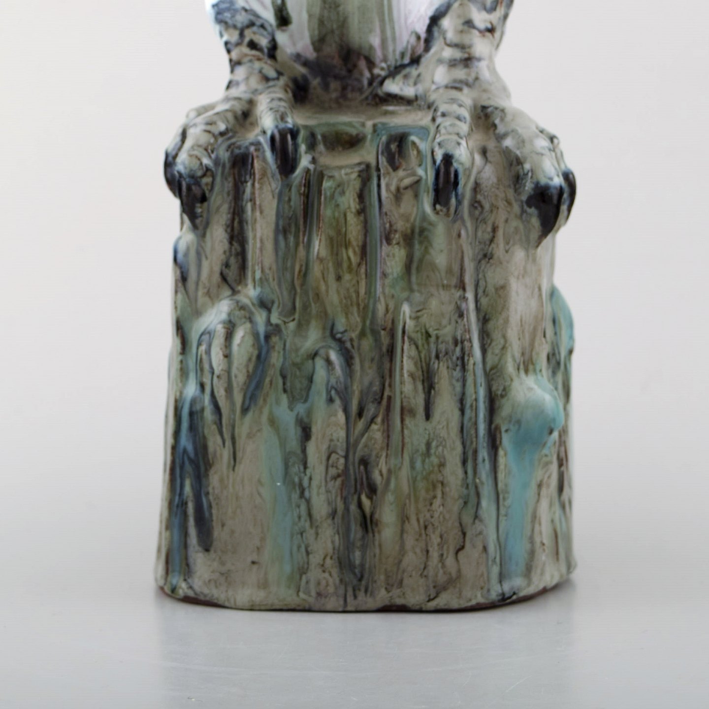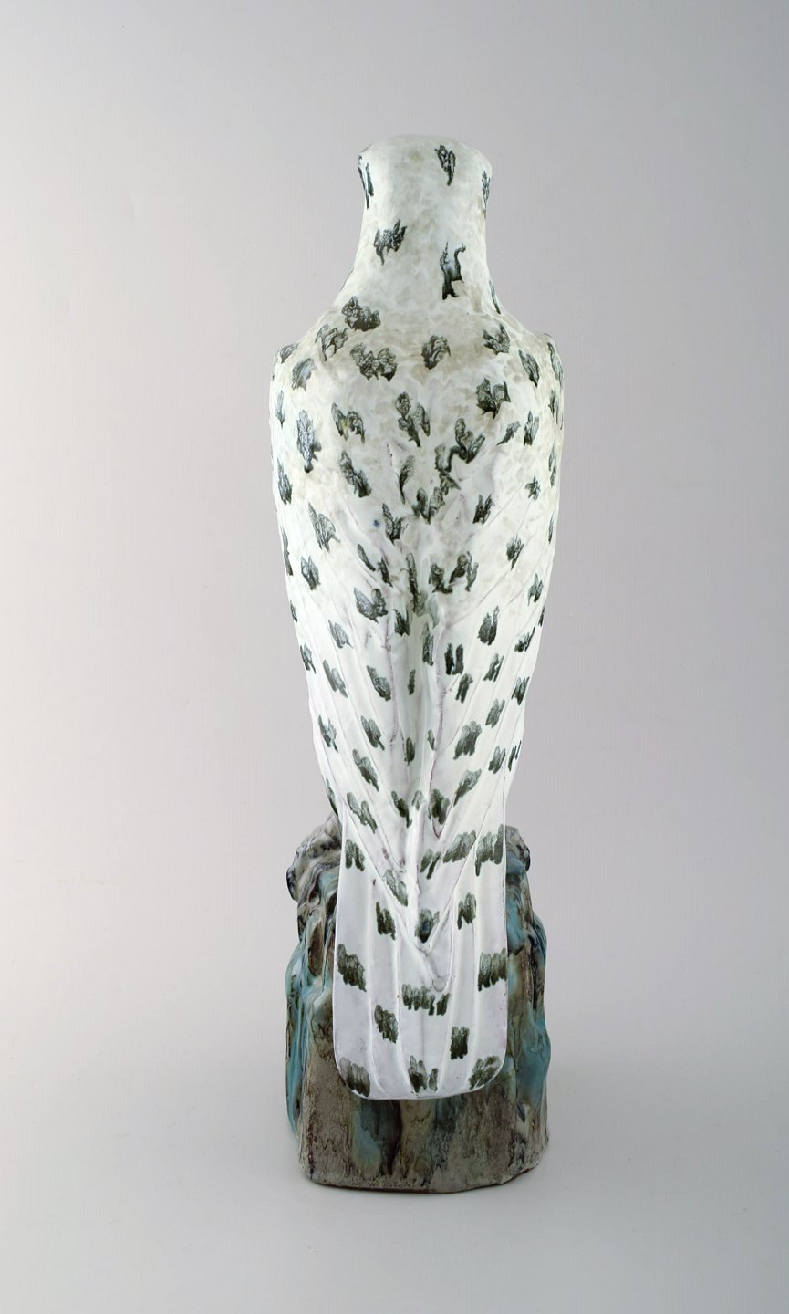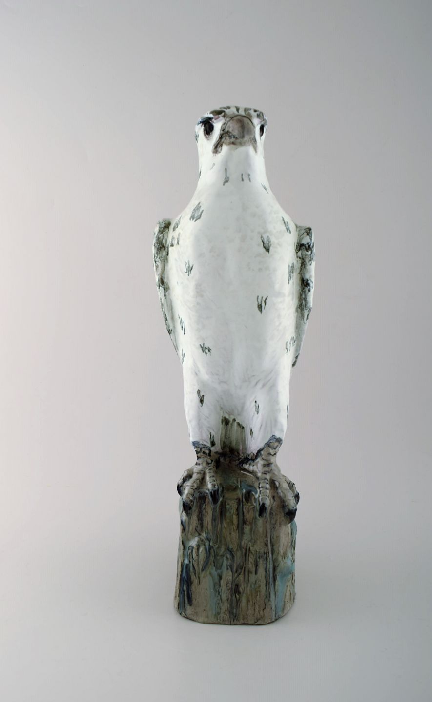 Islandsk falk af keramik dekoreret med grå, grønne, brune og hvid glasur.