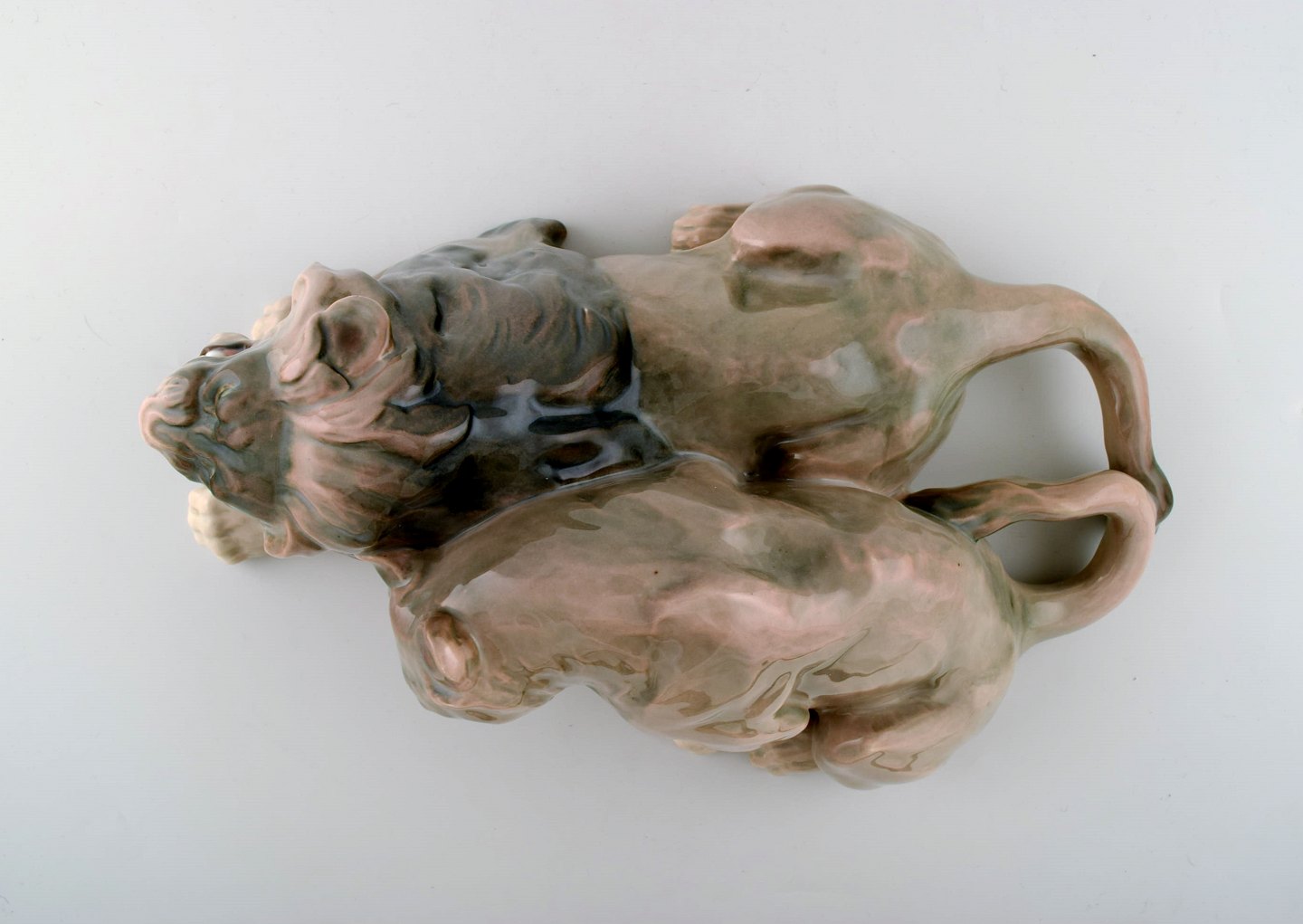 Knud Kyhn for B&G (Bing & Grøndahl). Stor sjælden porcelænsfigur i form af liggende løvepar. 1920/30'erne. Modelnummer 1823.