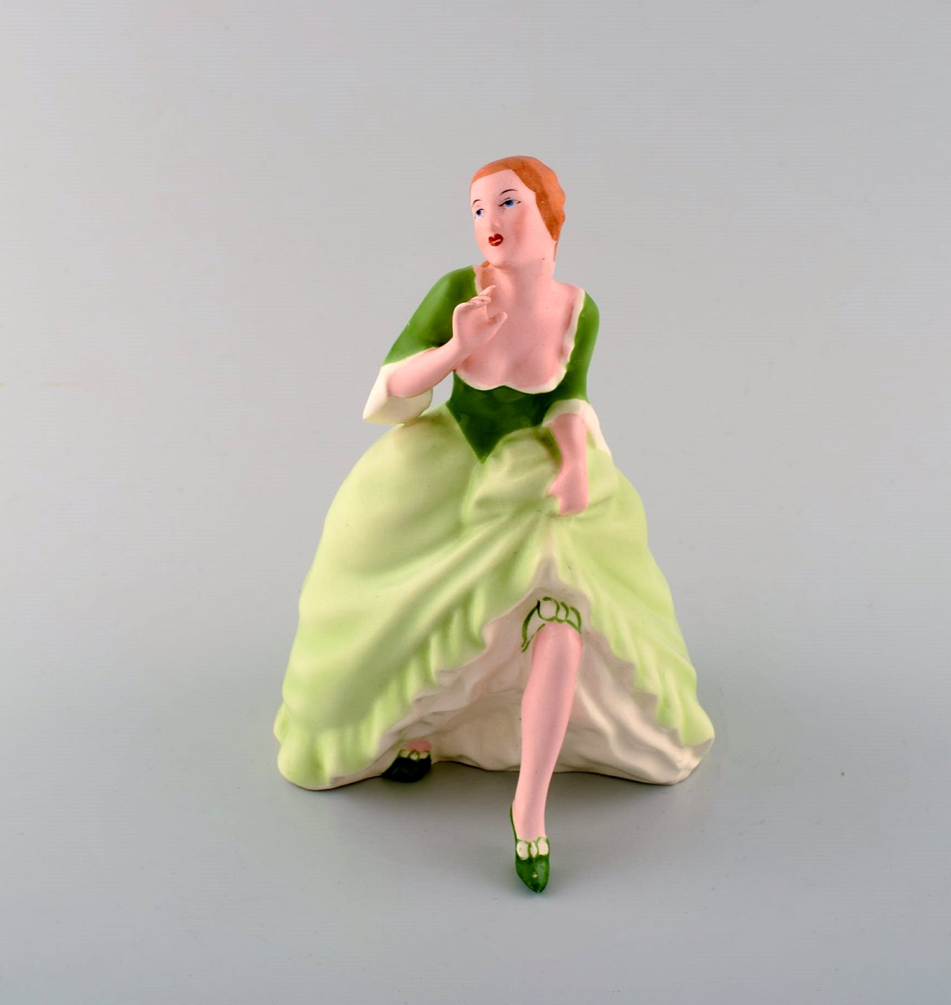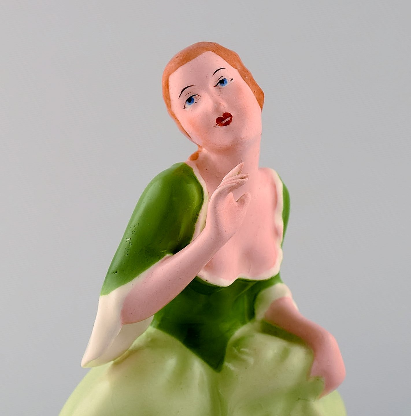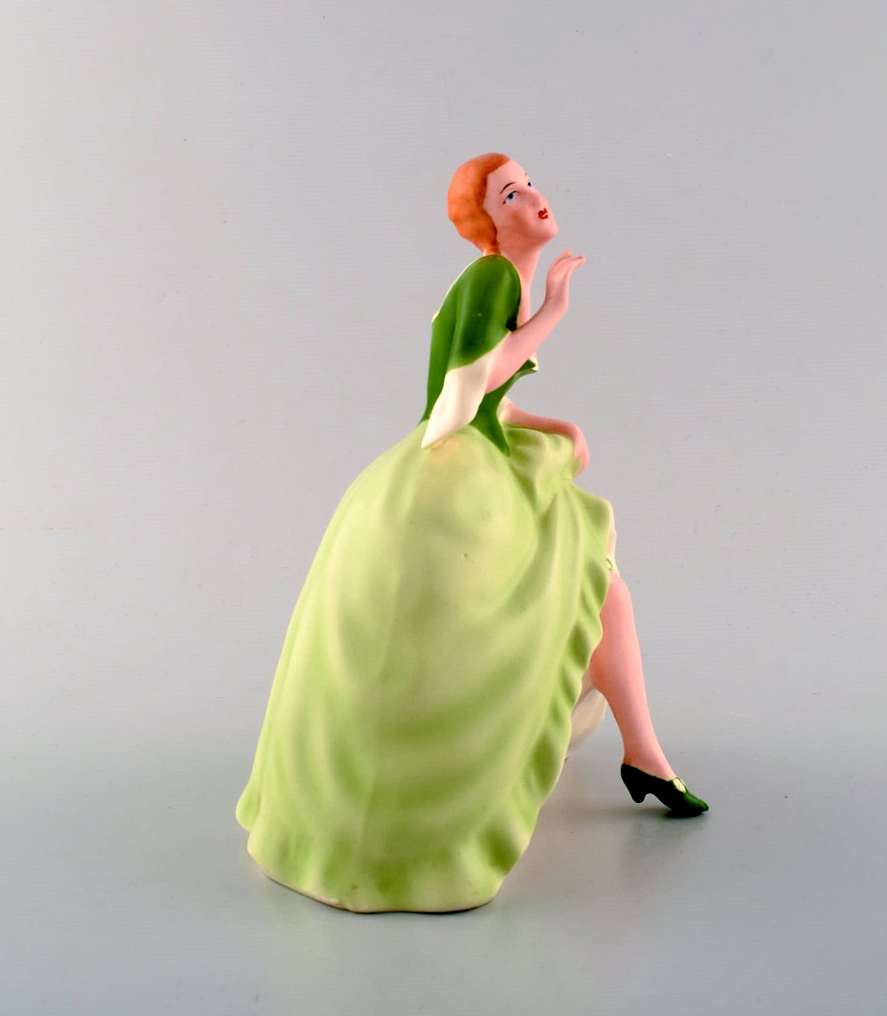 Art deco Royal Dux håndmalet porcelænsfigur. Kvinde i lysegrøn kjole med strutskørt. Tjekkiet, 1940'erne. Måler 19,5 x 15 cm. Stemplet. I perfekt stand.