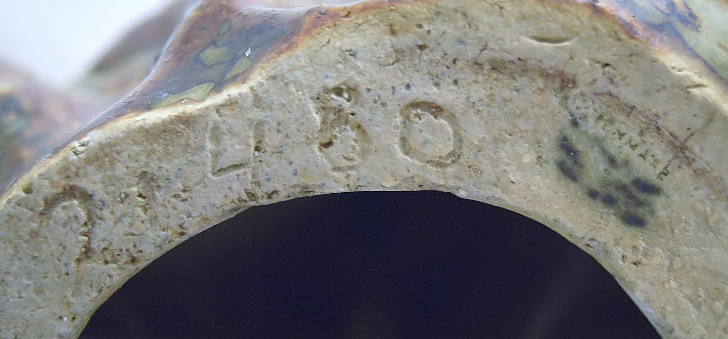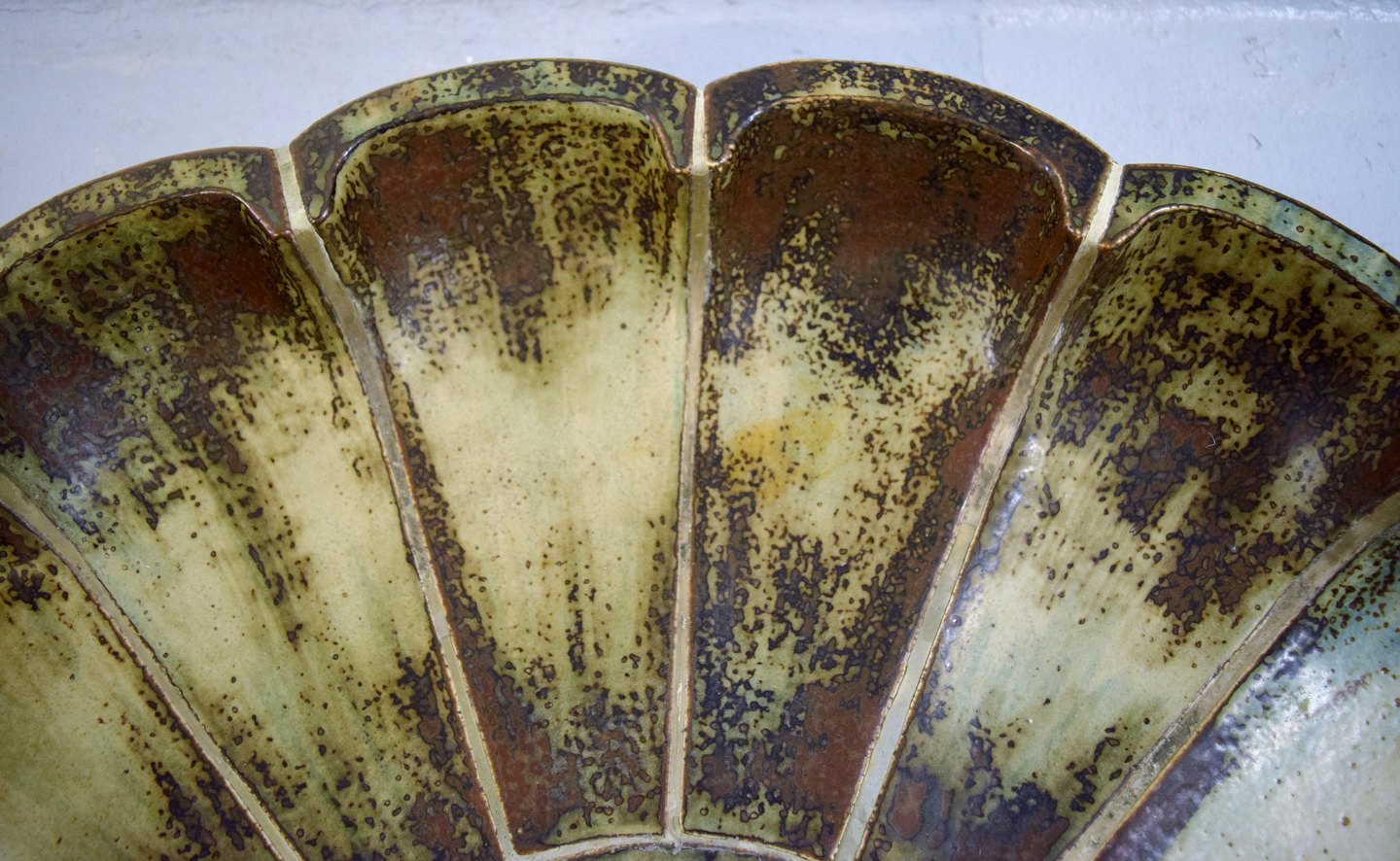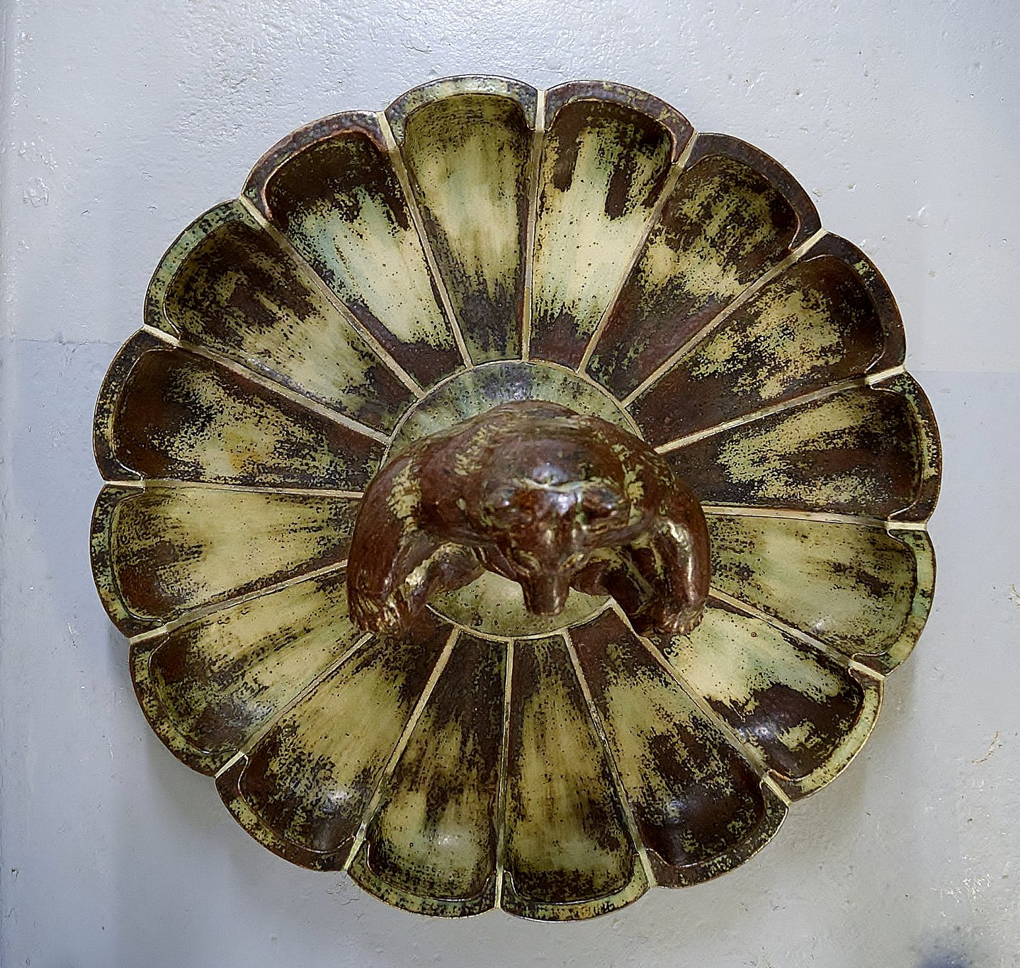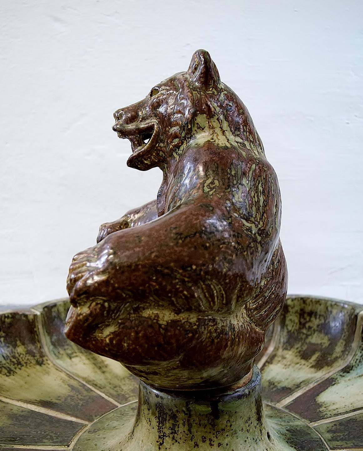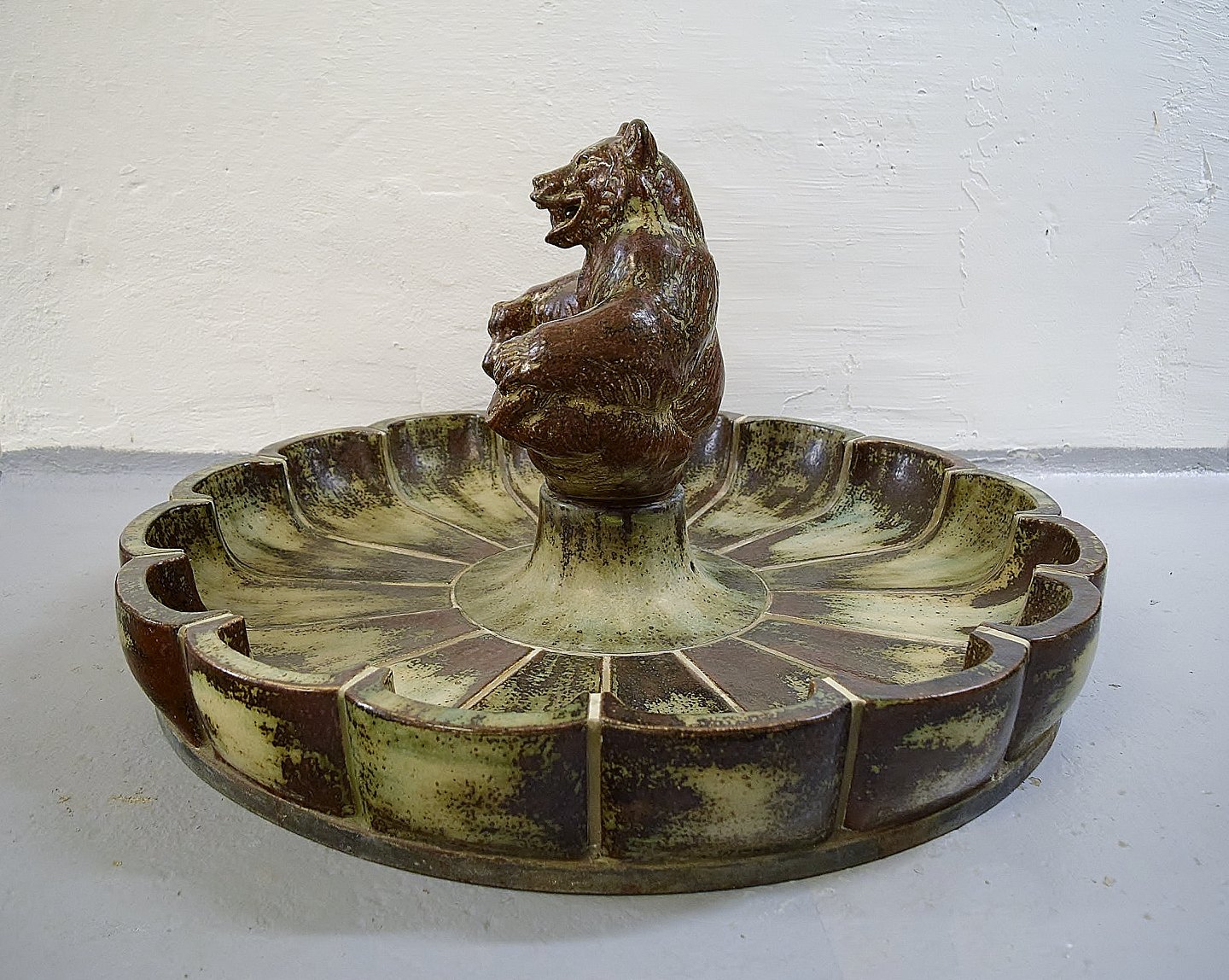 Unika Knud Kyhn for Royal copenhagen. Monumental og tung cirkulær havefontæne af stentøj i svejfet mønster med løstsiddende bjørn i midten. Vandet løber ud af bjørnens mund. Dekoreret med Sung glasur. Sjældent udbudt, museumskvalitet.