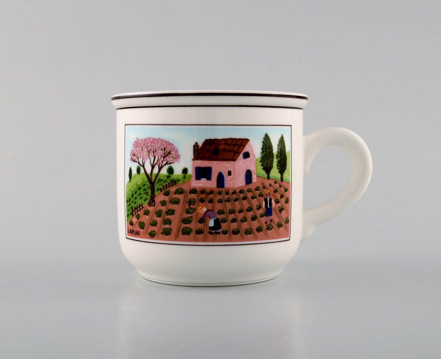 Villeroy & Boch Naif kaffeservice i porcelæn. Et sæt på 6 kopper med undekopper dekoreret med naivistisk landsbymotiv.