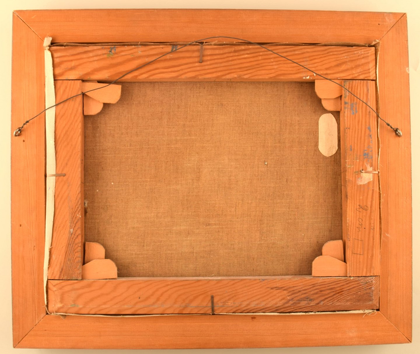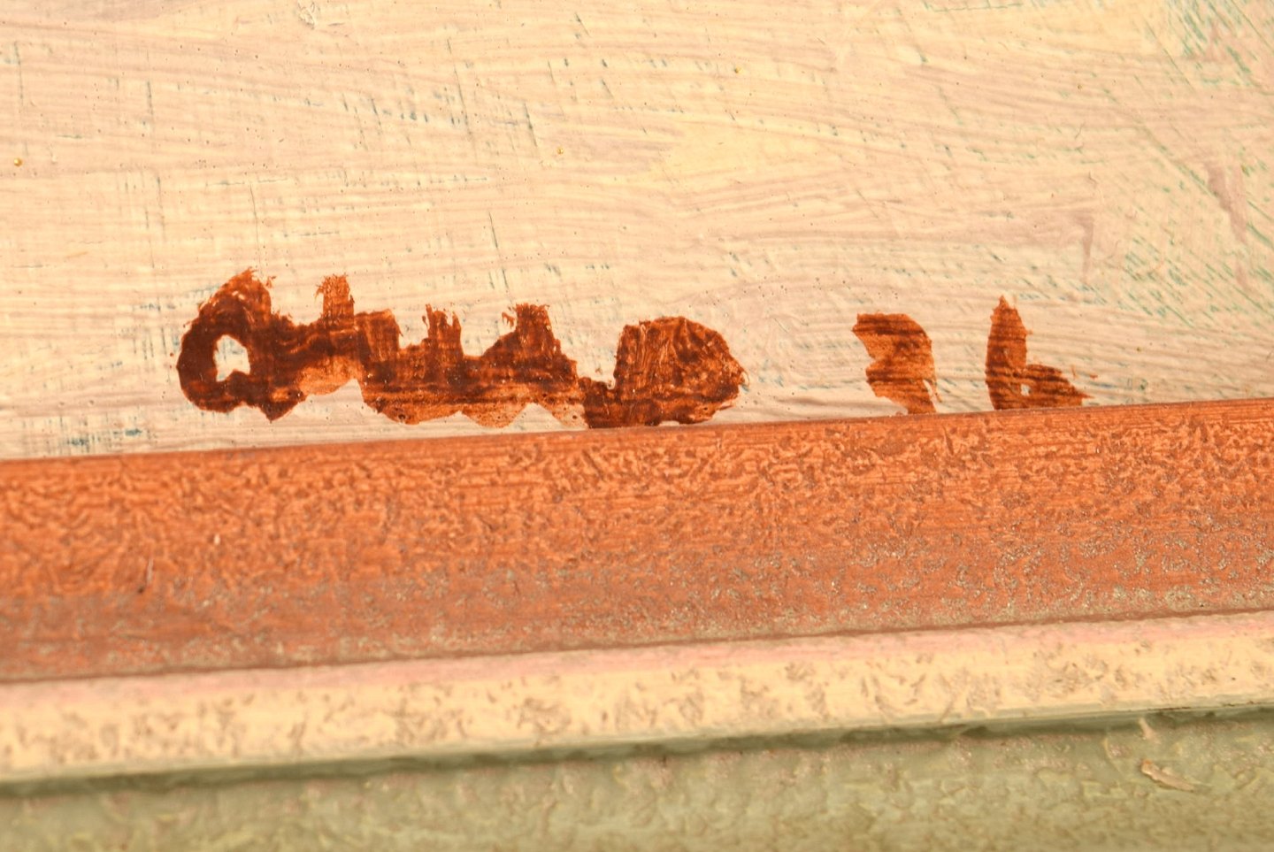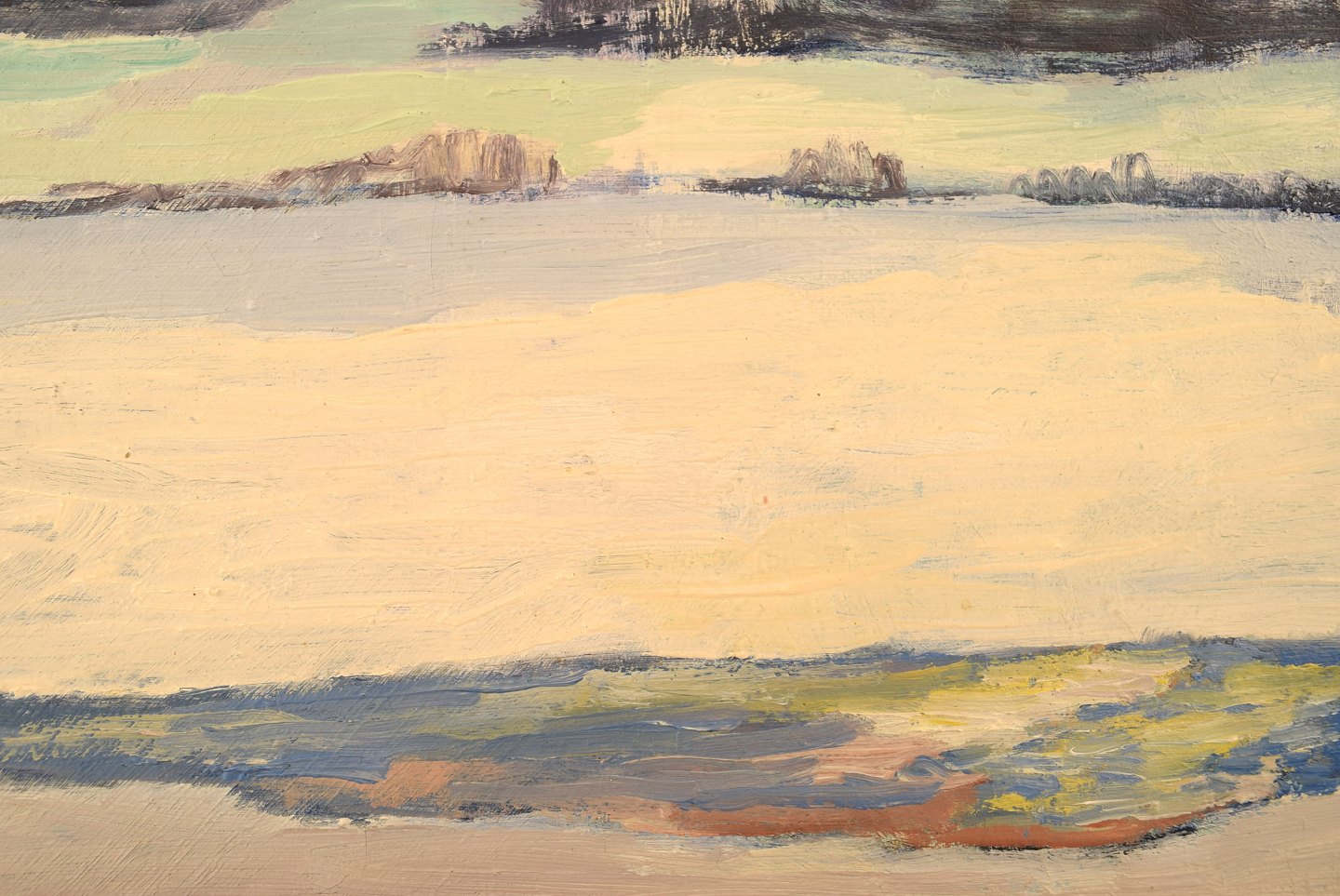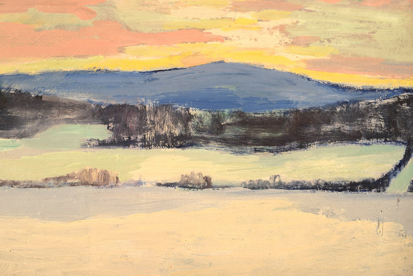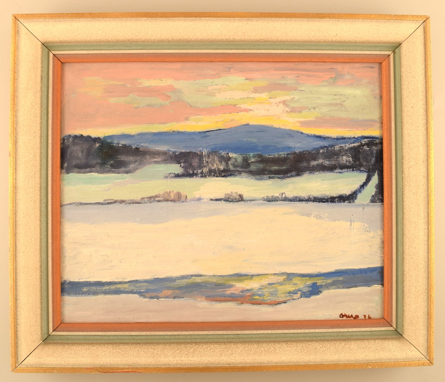 Bengt Orup (f. 1916, d.1996), Svensk kunstner. Olie på lærred. Solnedgang i sneklædt vinterlandskab. 1936. Stille, Nordisk stemning.
