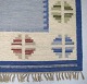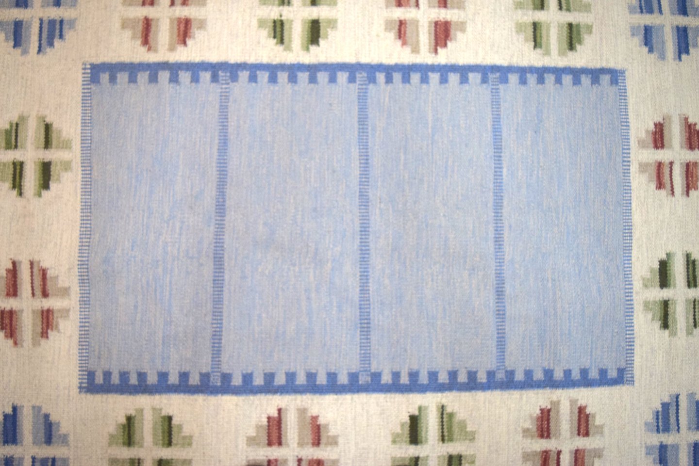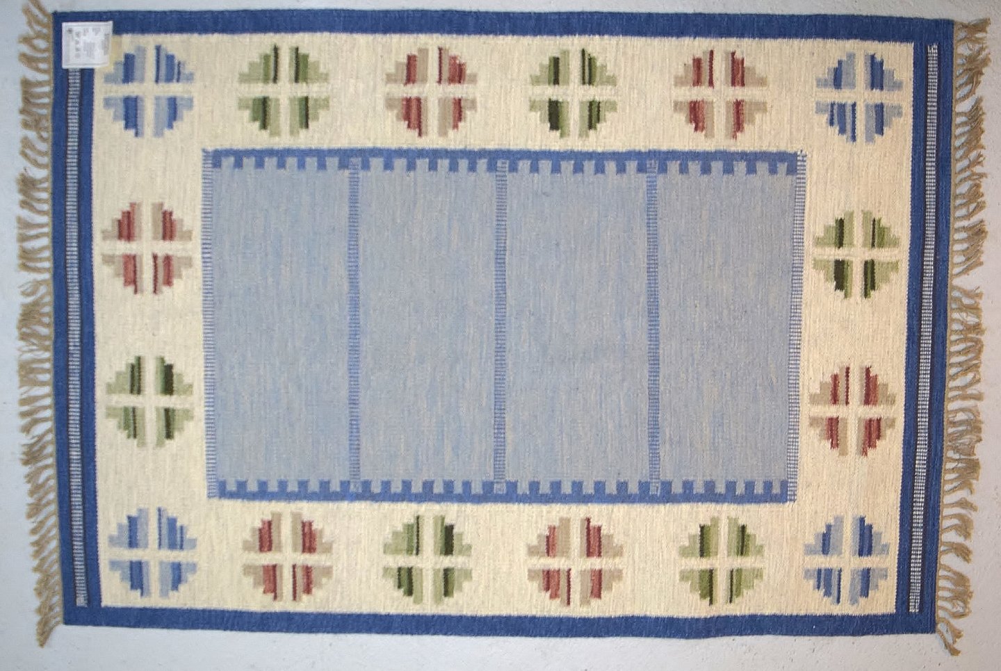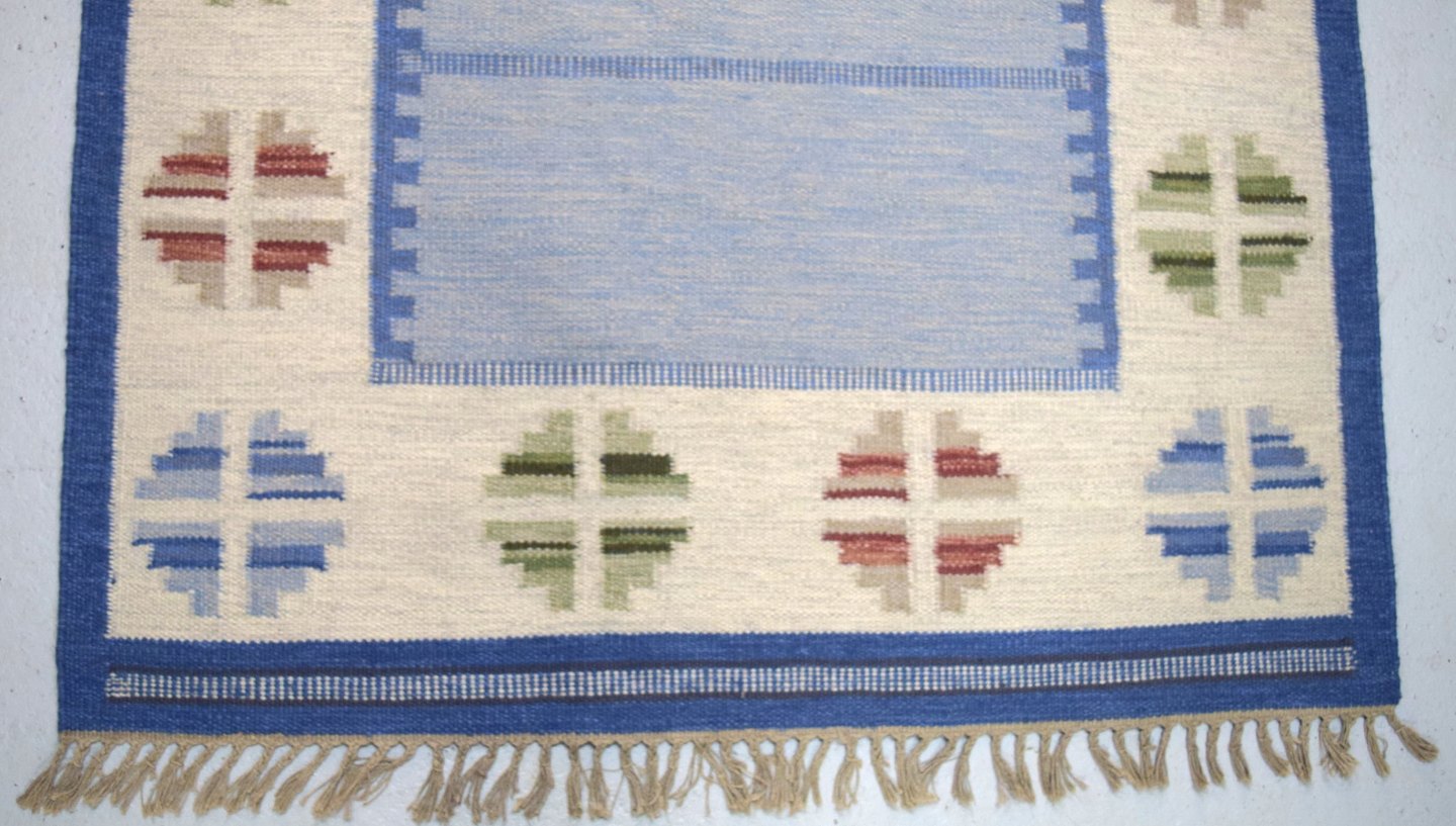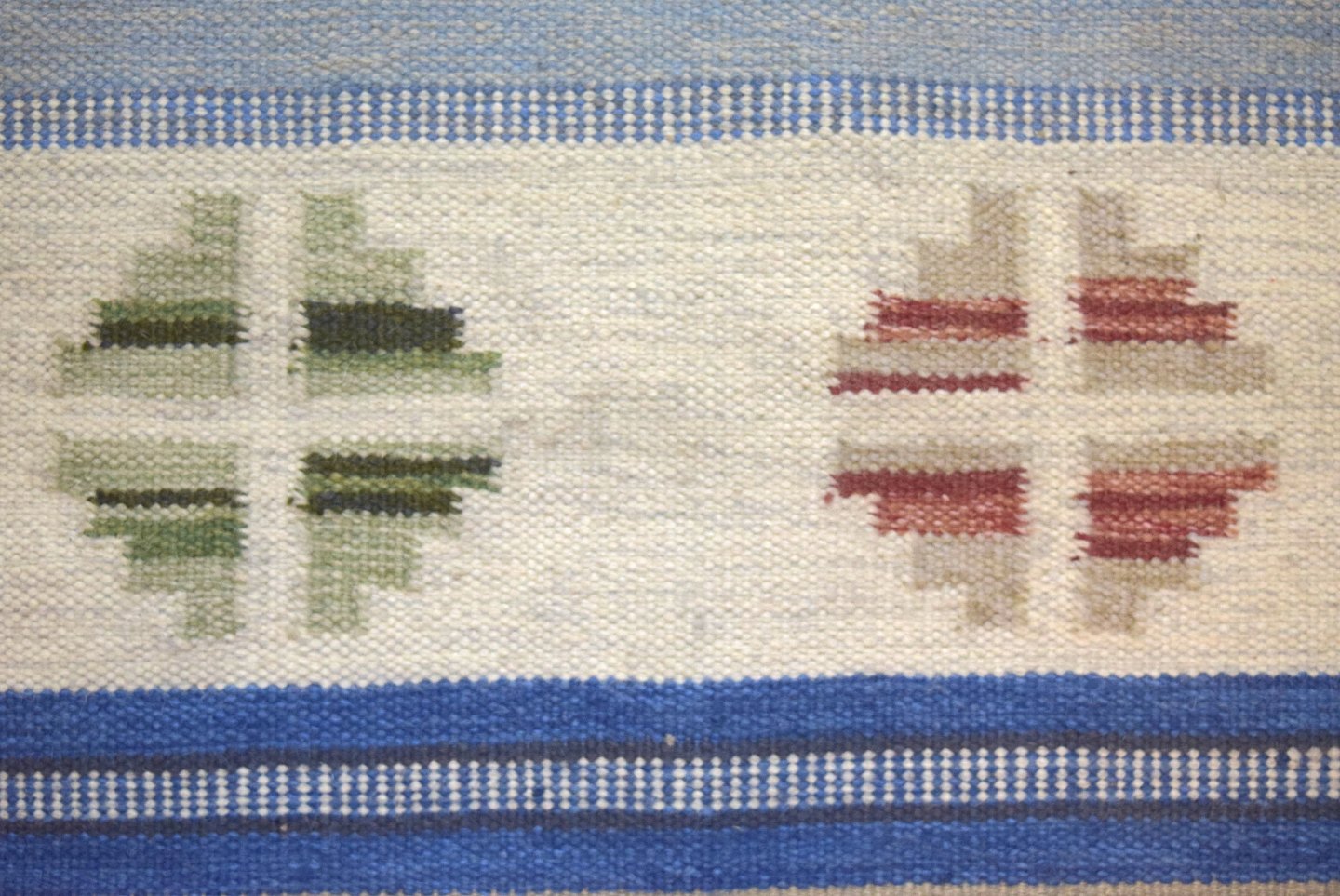 Håndvævet tæppe af uld i "rölakan" teknik. Geometriske felter i grøn, blå og rød. 1960'erne.