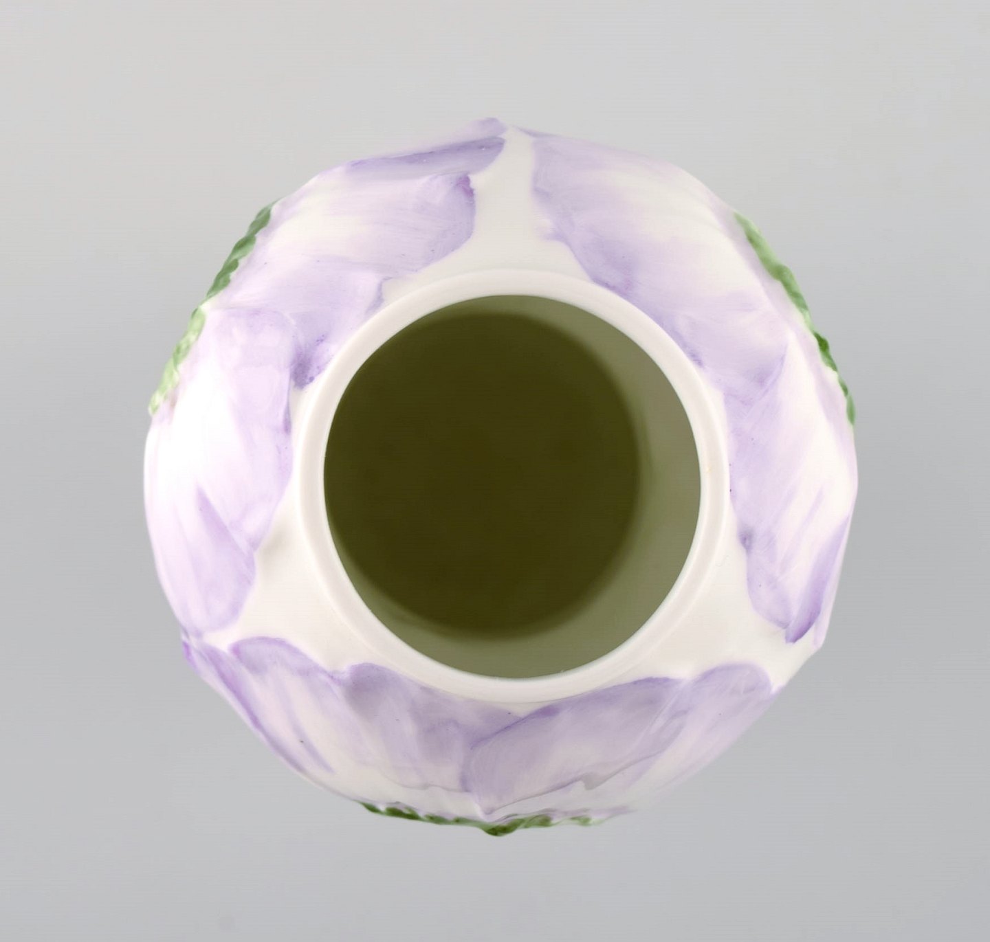 Rörstrand. Et par art nouveau vaser i porcelæn dekoreret med violette og grønne blomster i relief. Ca. 1900.