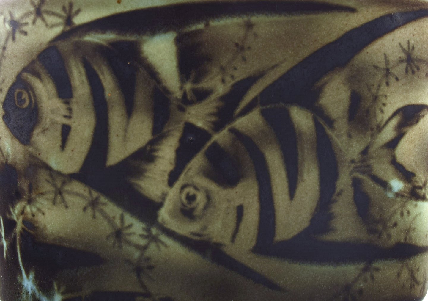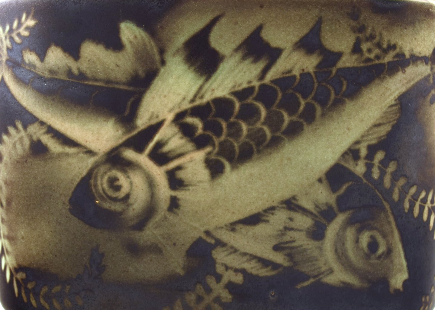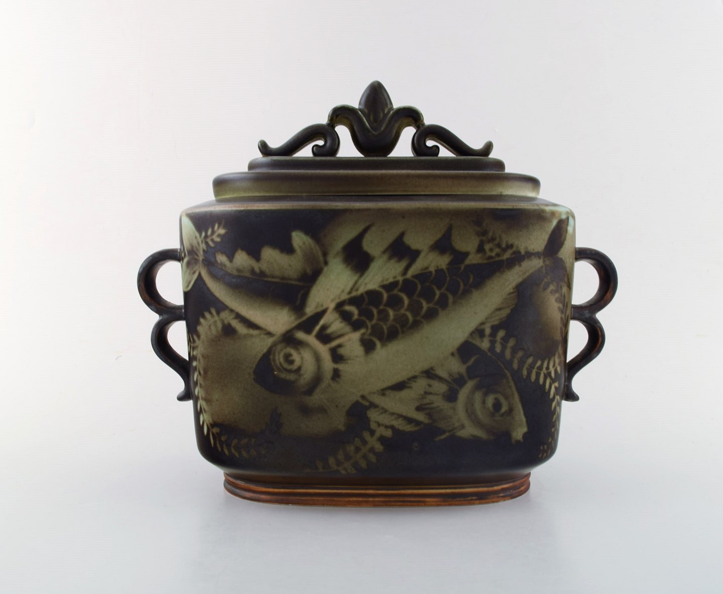 Gunnar Nylund for ALP Lidköping. Stor unika hånddrejet art deco Flambé lågkrukke med tropiske fisk. 1930'erne. I flot stand. Måler: 27 x 23 cm.