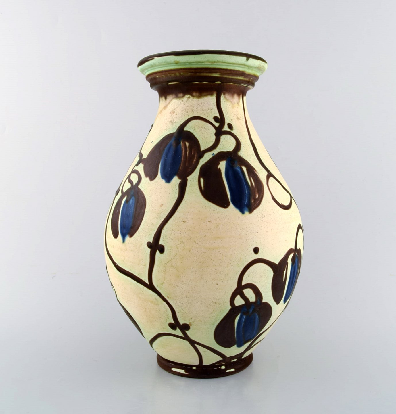 Kähler, HAK, glaseret stentøjsvase i moderne design. 1930/40´erne. Kohornsteknik. Blå og brune blomster på lys baggrund. Stemplet. Måler : 31 x 21 cm. I flot stand.