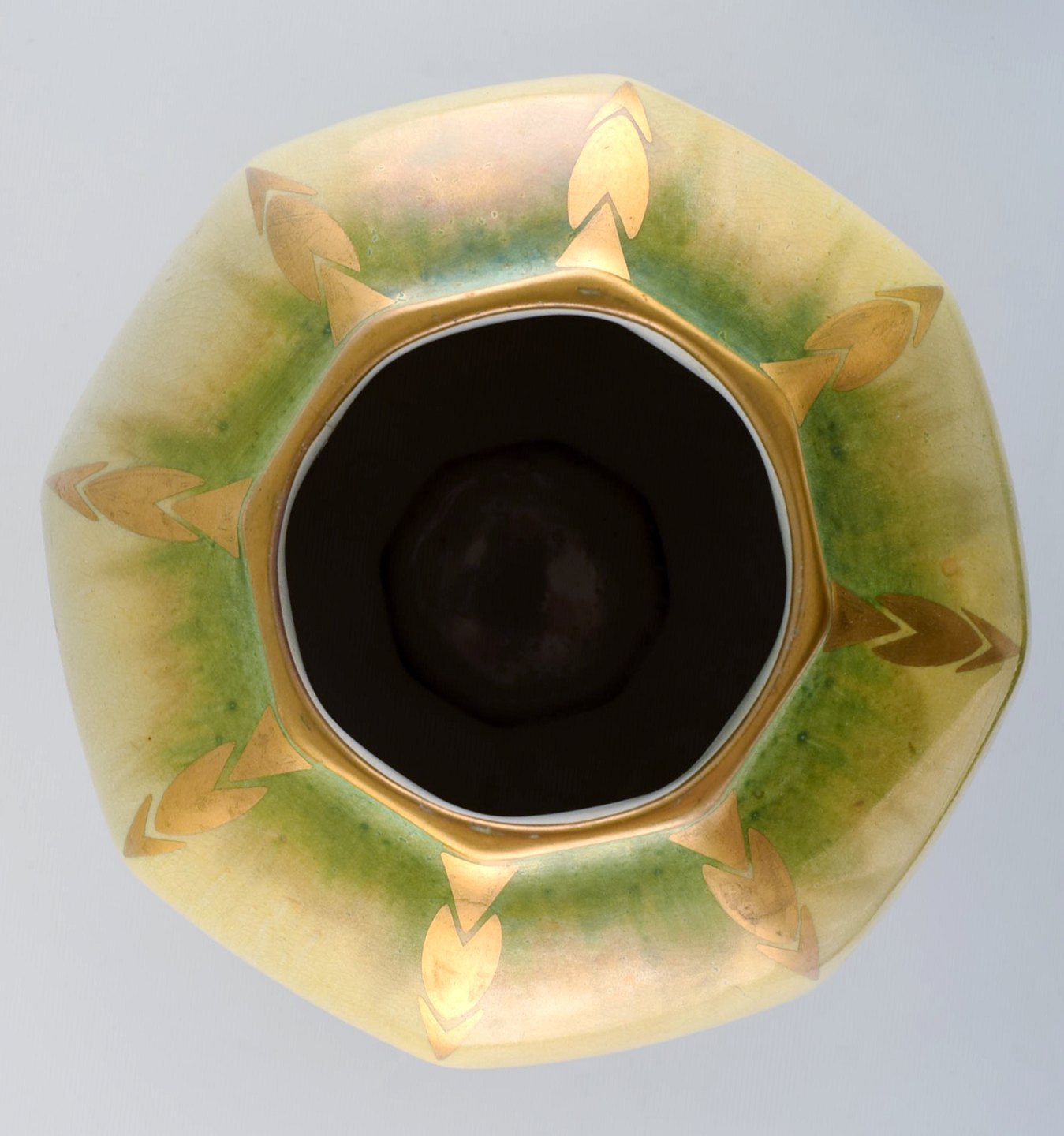 Josef Ekberg for Gustavsberg. Stor art deco bojan / lågkrukke i grøn og gul glasur med gulddekoration. Dateret 1930.