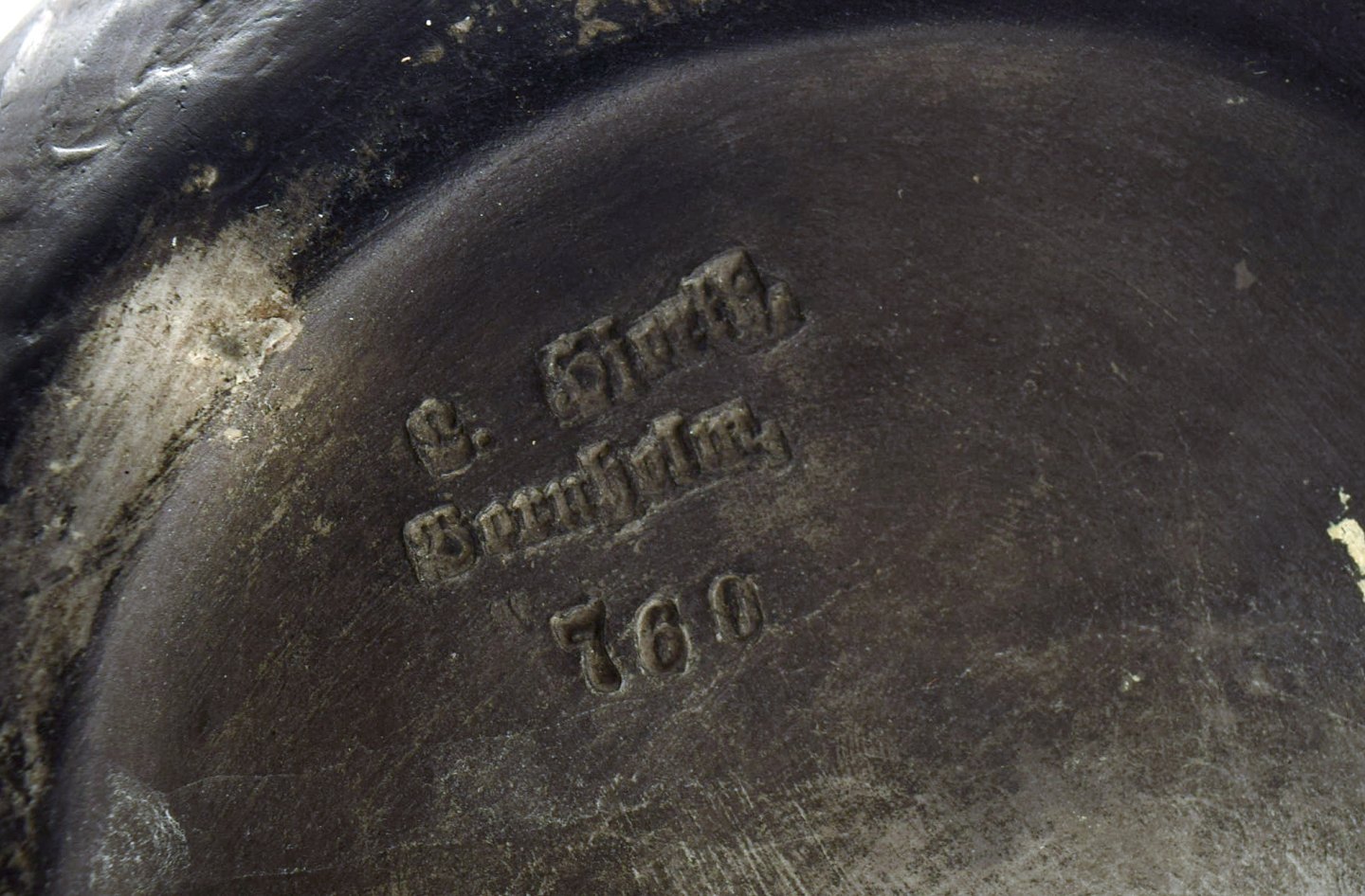 L. Hjorth, Bornholm. Art nouveau terracotta skål med salamander. Modelnummer 760. Ca. 1910. Måler: 14 x 12,5 cm. Stemplet. I perfekt stand.