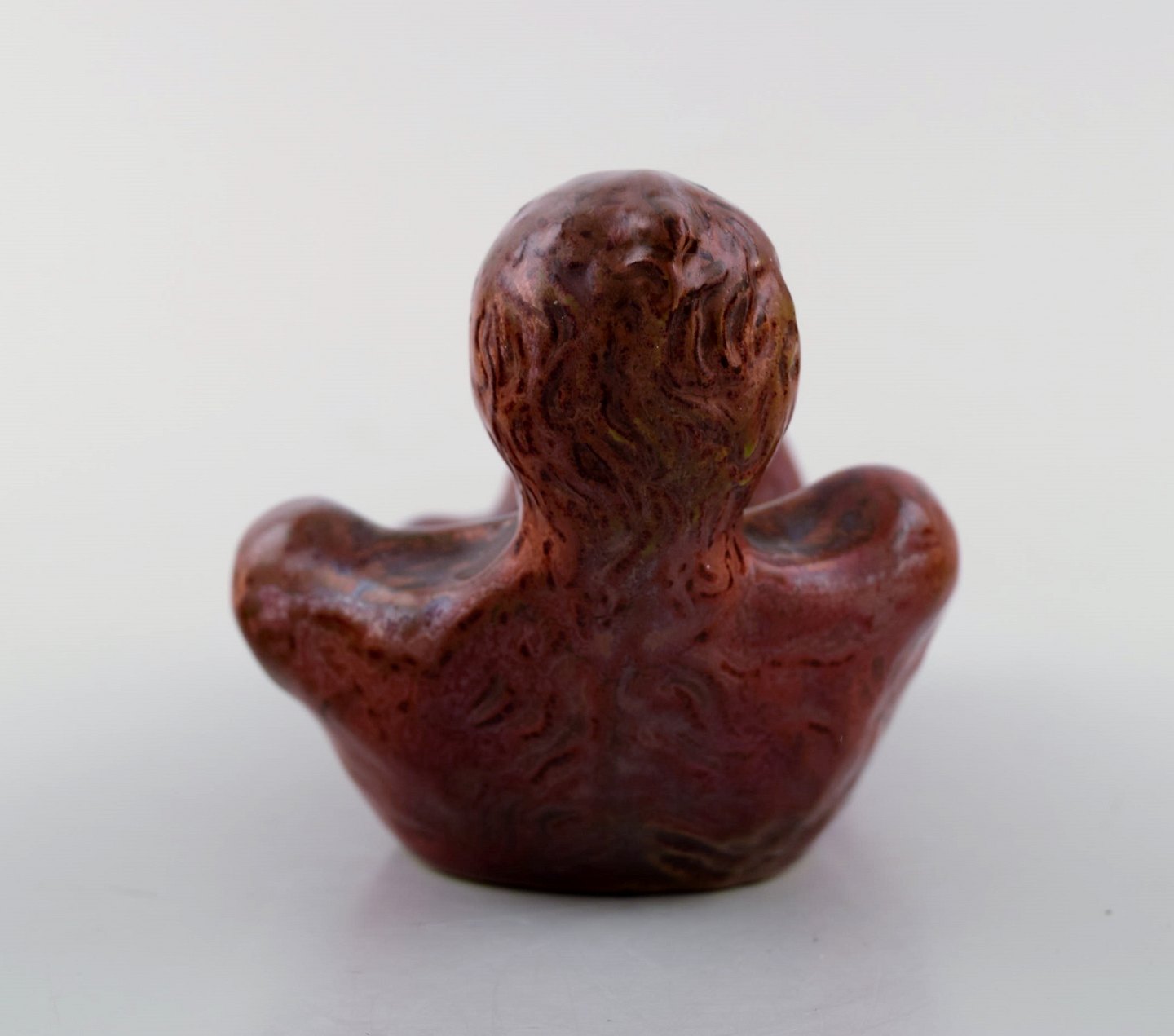 Hjorth (Bornholm) glaseret stentøjsfigur. Liggende abe. 1940'erne. Smuk lustre glasur i røde nuancer. Modelnummer 717.
